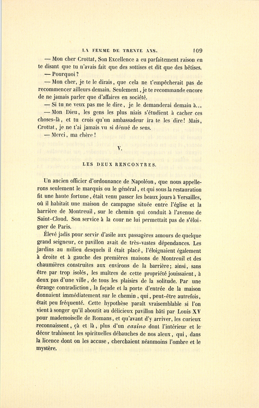 Pendant l’un des premiers jours du mois de juin 1844, une dame d’environ cinquante ans, mais qui paraissait encore plus vieille que ne le comportait son âge véritable, se promenait au soleil, à l’heure de midi, le long d’une allée, dans le jardin d’un grand hôtel situé rue Plumet, à Paris. Après avoir fait deux ou trois fois le tour du sentier légèrement sinueux où elle restait pour ne pas perdre de vue les fenêtres d’un appartement qui semblait attirer toute son attention, elle vint s’asseoir sur un de ces fauteuils à demi champêtres qui se fabriquent avec de jeunes branches d’arbres garnies de leur écorce. De la place où se trouvait ce siége élégant, la dame pouvait embrasser par une des grilles d’enceinte et les boulevards intérieurs, au milieu desquels est posé l’admirable dôme des Invalides, qui élève sa coupole d’or parmi les têtes d’un millier d’ormes, admirable paysage, et l’aspect moins grandiose de son jardin terminé par la façade grise d’un des plus beaux hôtels du faubourg Saint-Germain. Là tout était silencieux, les jardins voisins, les boulevards, les Invalides ; car, dans ce noble quartier, le jour ne commence guère qu’à midi. À moins de quelque caprice, à moins qu’une {p. 154} jeune dame ne veuille monter à cheval, ou qu’un vieux diplomate n’ait un protocole à refaire, à cette heure, valets et maîtres, tout dort, ou tout se réveille.