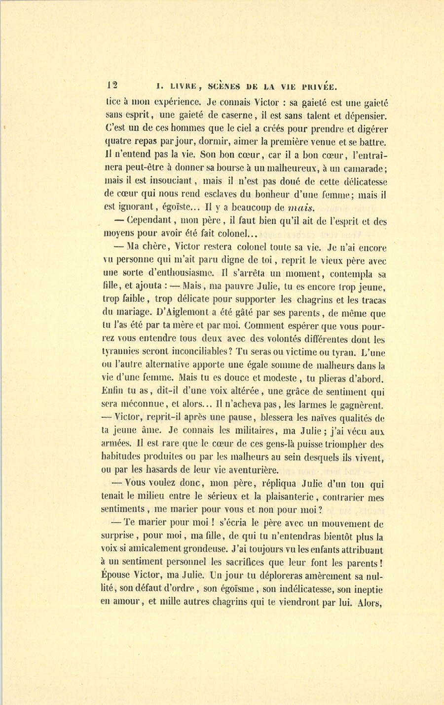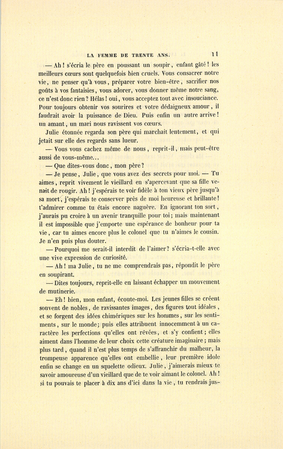– Eh ! bien, mon enfant, écoute-moi. Les jeunes filles se créent souvent de nobles, de ravissantes images, des figures tout idéales, et se forgent des idées chimériques sur les hommes, sur les sentiments, sur le monde ; puis elles attribuent innocemment à un caractère les perfections qu’elles ont rêvées, et s’y confient ; elles aiment dans l’homme de leur choix cette créature imaginaire ; mais plus tard, quand il n’est plus temps de s’affranchir du malheur, la trompeuse apparence qu’elles ont embellie, leur première idole enfin se change en un squelette odieux. Julie, j’aimerais mieux te savoir amoureuse d’un vieillard que de te voir aimant le colonel. Ah ! si tu pouvais te placer à dix ans d’ici dans la vie, tu rendrais {p. 12} justice à mon expérience. Je connais Victor : sa gaieté est une gaieté sans esprit, une gaieté de caserne, il est sans talent et dépensier. C’est un de ces hommes que le ciel a créés pour prendre et digérer quatre repas par jour, dormir, aimer la première venue et se battre. Il n’entend pas la vie. Son bon cœur, car il a bon cœur, l’entraînera peut-être à donner sa bourse à un malheureux, à un camarade ; mais il est insouciant, mais il n’est pas doué de cette délicatesse de cœur qui nous rend esclaves du bonheur d’une femme ; mais il est ignorant, égoïste… Il y a beaucoup de mais.
