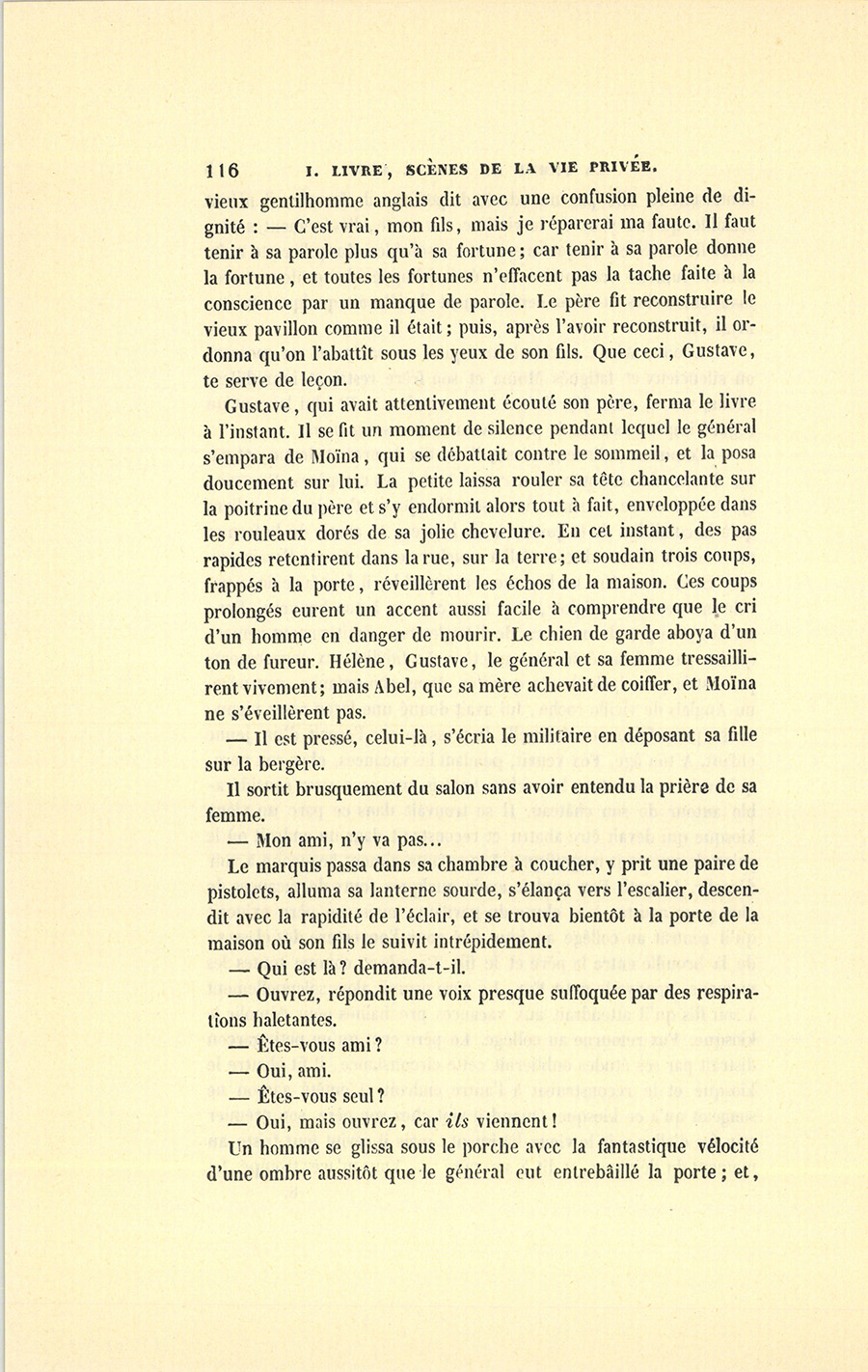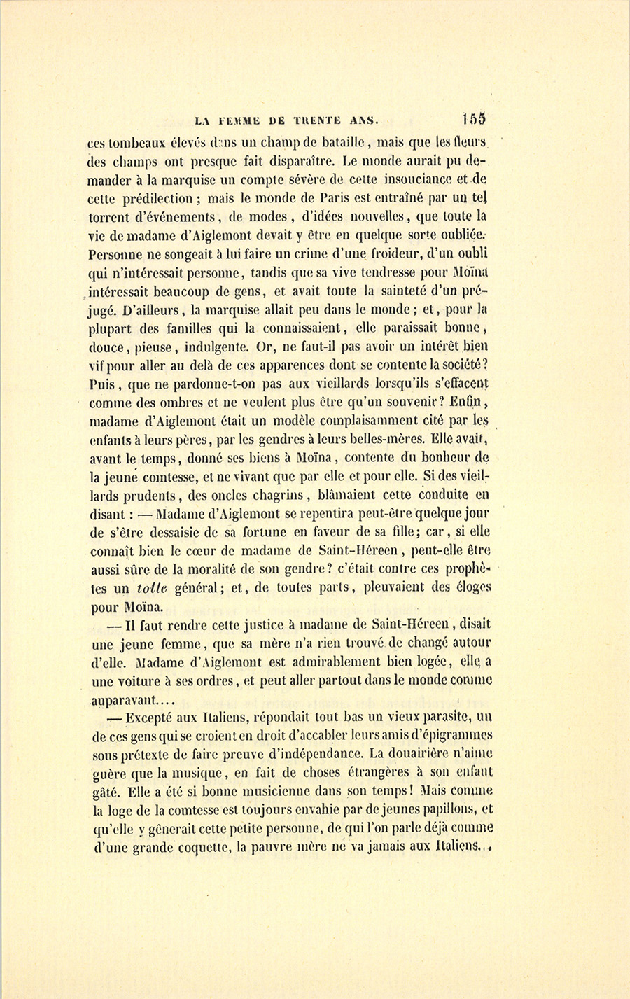 La vieille dame si matinale était la marquise d’Aiglemont, mère de madame de Saint-Héreen, à qui ce bel hôtel appartenait. La marquise s’en était privée pour sa fille, à qui elle avait donné toute sa fortune, en ne se réservant qu’une pension viagère. La comtesse Moïna de Saint-Héreen était le dernier enfant de madame d’Aiglemont. Pour lui faire épouser l’héritier d’une des plus illustres maisons de France, la marquise avait tout sacrifié. Rien n’était plus naturel : elle avait successivement perdu deux fils ; l’un, Gustave marquis d’Aiglemont, était mort du choléra ; l’autre, Abel, avait succombé devant Constantine. Gustave laissa des enfants et une veuve. Mais l’affection assez tiède que madame d’Aiglemont avait portée à ses deux fils s’était encore affaiblie en passant à ses petits-enfants. Elle se comportait poliment avec madame d’Aiglemont la jeune : mais elle s’en tenait au sentiment superficiel que le bon goût et les convenances nous prescrivent de témoigner à nos proches. La fortune de ses enfants morts ayant été parfaitement réglée, elle avait réservé pour sa chère Moïna ses économies et ses biens propres. Moïna, belle et ravissante depuis son enfance, avait toujours été pour madame d’Aiglemont l’objet d’une de ces prédilections innées ou involontaires chez les mères de famille ; fatales sympathies qui semblent inexplicables, ou que les observateurs savent trop bien expliquer. La charmante figure de Moïna, le son de voix de cette fille chérie, ses manières, sa démarche, sa physionomie, ses gestes, tout en elle réveillait chez la marquise les émotions les plus profondes qui puissent animer, troubler ou charmer le cœur d’une mère. Le principe de sa vie présente, de sa vie du lendemain, de sa vie passée, était dans le cœur de cette jeune femme, où elle avait jeté tous ses trésors. Moïna avait heureusement survécu à quatre enfants, ses aînés. Madame d’Aiglemont avait en effet perdu, de la manière la plus malheureuse, disaient les gens du monde, une fille charmante dont la destinée était presque inconnue, et un petit garçon, enlevé à cinq ans par une horrible catastrophe. La marquise vit sans doute un présage du ciel dans le respect que le sort semblait avoir pour la fille de son cœur, et n’accordait que de faibles souvenirs à ses enfants déjà tombés selon les caprices de la mort, et qui restaient au fond de son âme, comme {p. 155} ces tombeaux élevés dans un champ de bataille, mais que les fleurs des champs ont presque fait disparaître. Le monde aurait pu demander à la marquise un compte sévère de cette insouciance et de cette prédilection ; mais le monde de Paris est entraîné par un tel torrent d’événements, de modes, d’idées nouvelles, que toute la vie de madame d’Aiglemont devait y être en quelque sorte oubliée. Personne ne songeait à lui faire un crime d’une froideur, d’un oubli qui n’intéressait personne, tandis que sa vive tendresse pour Moïna intéressait beaucoup de gens, et avait toute la sainteté d’un préjugé. D’ailleurs, la marquise allait peu dans le monde ; et, pour la plupart des familles qui la connaissaient, elle paraissait bonne, douce, pieuse, indulgente. Or, ne faut-il pas avoir un intérêt bien vif pour aller au delà de ces apparences dont se contente la société ? Puis, que ne pardonne-t-on pas aux vieillards lorsqu’ils s’effacent comme des ombres et ne veulent plus être qu’un souvenir ? Enfin, madame d’Aiglemont était un modèle complaisamment cité par les enfants à leurs pères, par les gendres à leurs belles-mères. Elle avait, avant le temps, donné ses biens à Moïna, contente du bonheur de la jeune comtesse, et ne vivant que par elle et pour elle. Si des vieillards prudents, des oncles chagrins, blâmaient cette conduite en disant : – Madame d’Aiglemont se repentira peut-être quelque jour de s’être dessaisie de sa fortune en faveur de sa fille ; car, si elle connaît bien le cœur de madame de Saint-Héreen, peut-elle être aussi sûre de la moralité de son gendre ? c’était contre ces prophètes un tolle général ; et, de toutes parts, pleuvaient des éloges pour Moïna.