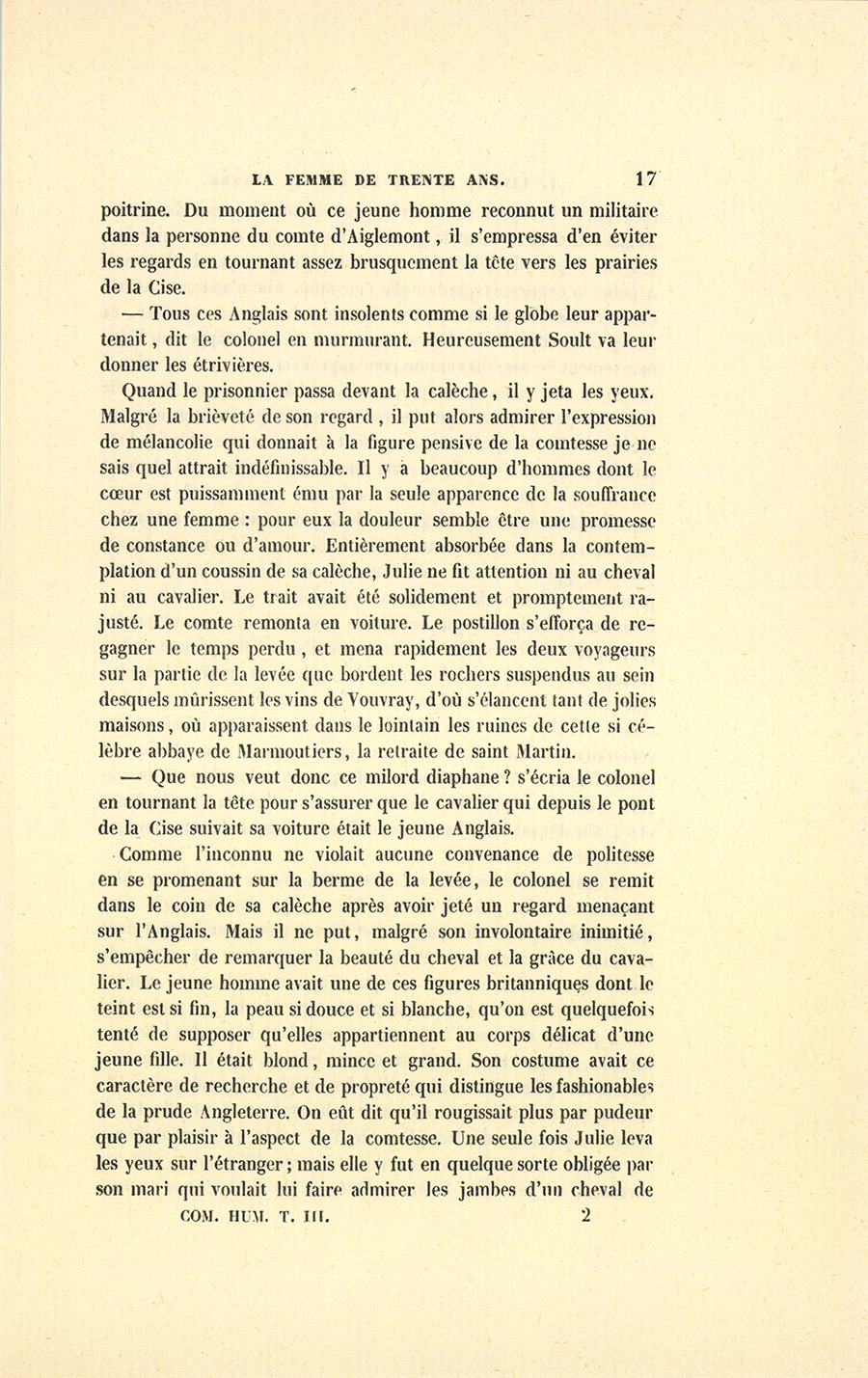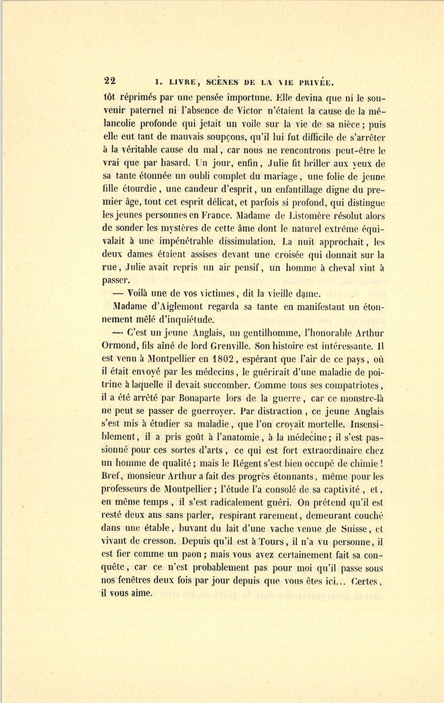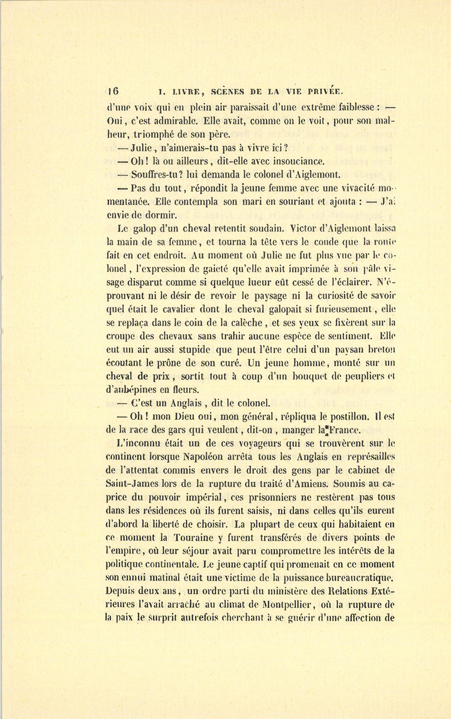 L’inconnu était un de ces voyageurs qui se trouvèrent sur le continent lorsque Napoléon arrêta tous les Anglais en représailles de l’attentat commis envers le droit des gens par le cabinet de Saint-James lors de la rupture du traité d’Amiens. Soumis au caprice du pouvoir impérial, ces prisonniers ne restèrent pas tous dans les résidences où ils furent saisis, ni dans celles qu’ils eurent d’abord la liberté de choisir. La plupart de ceux qui habitaient en ce moment la Touraine y furent transférés de divers points de l’empire, où leur séjour avait paru compromettre les intérêts de la politique continentale. Le jeune captif qui promenait en ce moment son ennui matinal était une victime de la puissance bureaucratique. Depuis deux ans, un ordre parti du ministère des Relations Extérieures l’avait arraché au climat de Montpellier, où la rupture de la paix le surprit autrefois cherchant à se guérir d’une affection de {p. 17} poitrine. Du moment où ce jeune homme reconnut un militaire dans la personne du comte d’Aiglemont, il s’empressa d’en éviter les regards en tournant assez brusquement la tête vers les prairies de la Cise.