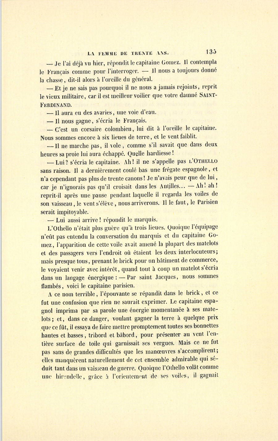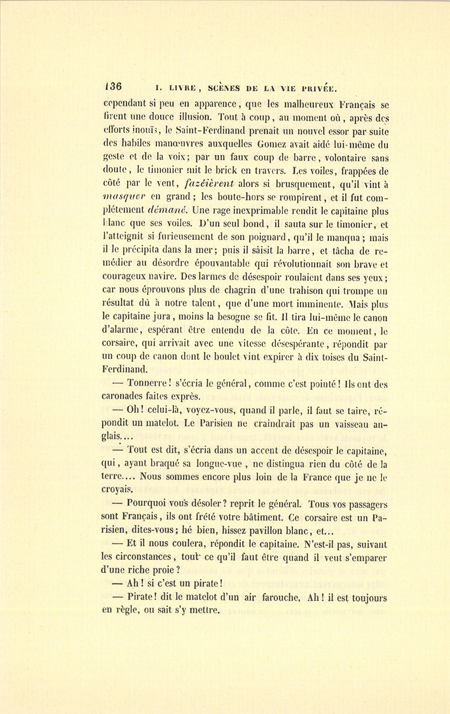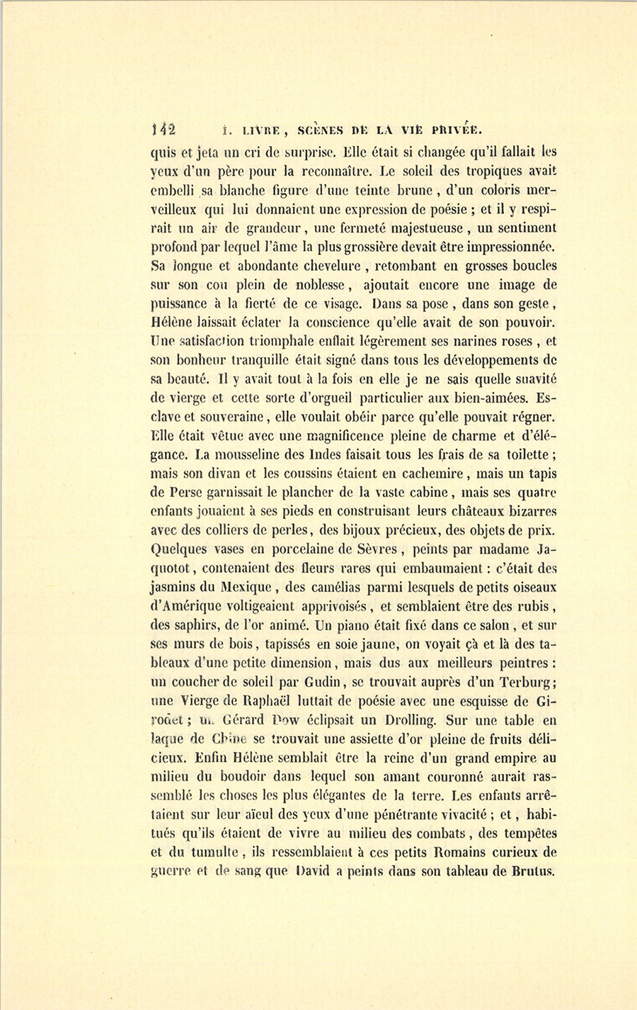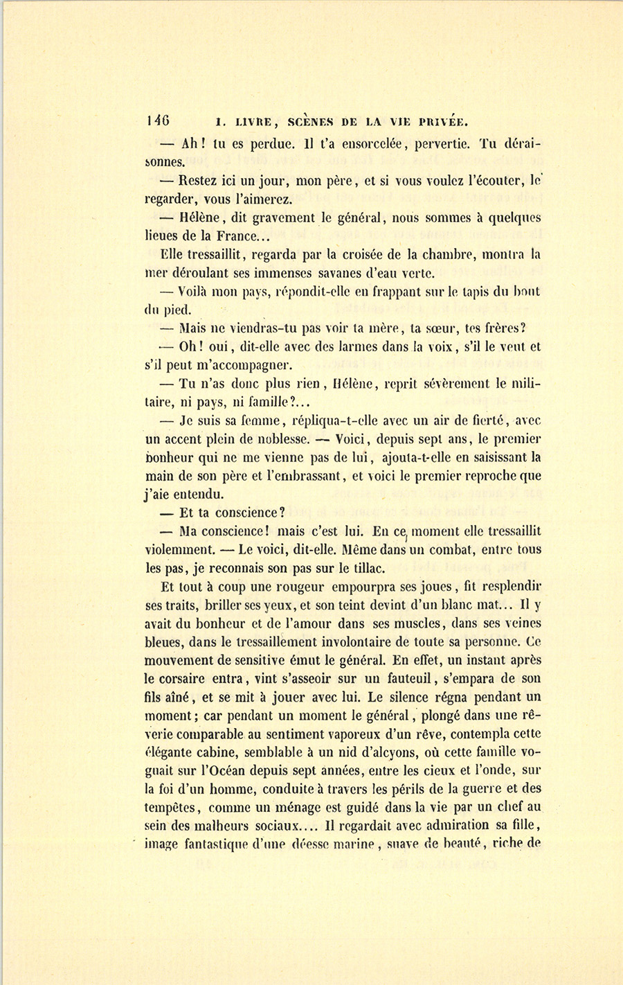 Et tout à coup une rougeur empourpra ses joues, fit resplendir ses traits, briller ses yeux, et son teint devint d’un blanc mat… Il y avait du bonheur et de l’amour dans ses muscles, dans ses veines bleues, dans le tressaillement involontaire de toute sa personne. Ce mouvement de sensitive émut le général. En effet, un instant après le corsaire entra, vint s’asseoir sur un fauteuil, s’empara de son fils aîné, et se mit à jouer avec lui. Le silence régna pendant un moment ; car pendant un moment le général, plongé dans une rêverie comparable au sentiment vaporeux d’un rêve, contempla cette élégante cabine, semblable à un nid d’alcyons, où cette famille voguait sur l’Océan depuis sept années, entre les cieux et l’onde, sur la foi d’un homme, conduite à travers les périls de la guerre et des tempêtes, comme un ménage est guidé dans la vie par un chef au sein des malheurs sociaux… Il regardait avec admiration sa fille, image fantastique d’une déesse marine, suave de beauté, riche de {p. 147} bonheur, et faisant pâlir tous les trésors qui l’entouraient devant les trésors de son âme, les éclairs de ses yeux et l’indescriptible poésie exprimée dans sa personne et autour d’elle. Cette situation offrait une étrangeté qui le surprenait, une sublimité de passion et de raisonnement qui confondait les idées5 vulgaires. Les froides et étroites combinaisons de la société mouraient devant ce tableau. Le vieux militaire sentit toutes ces choses, et comprit aussi que sa fille n’abandonnerait jamais une vie si large, si féconde en contrastes, remplie par un amour si vrai ; puis, si elle avait une fois goûté le péril sans en être effrayée, elle ne pouvait plus revenir aux petites scènes d’un monde mesquin et borné.