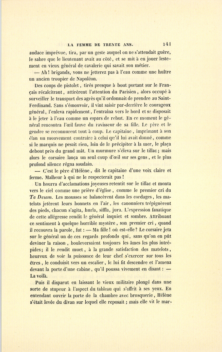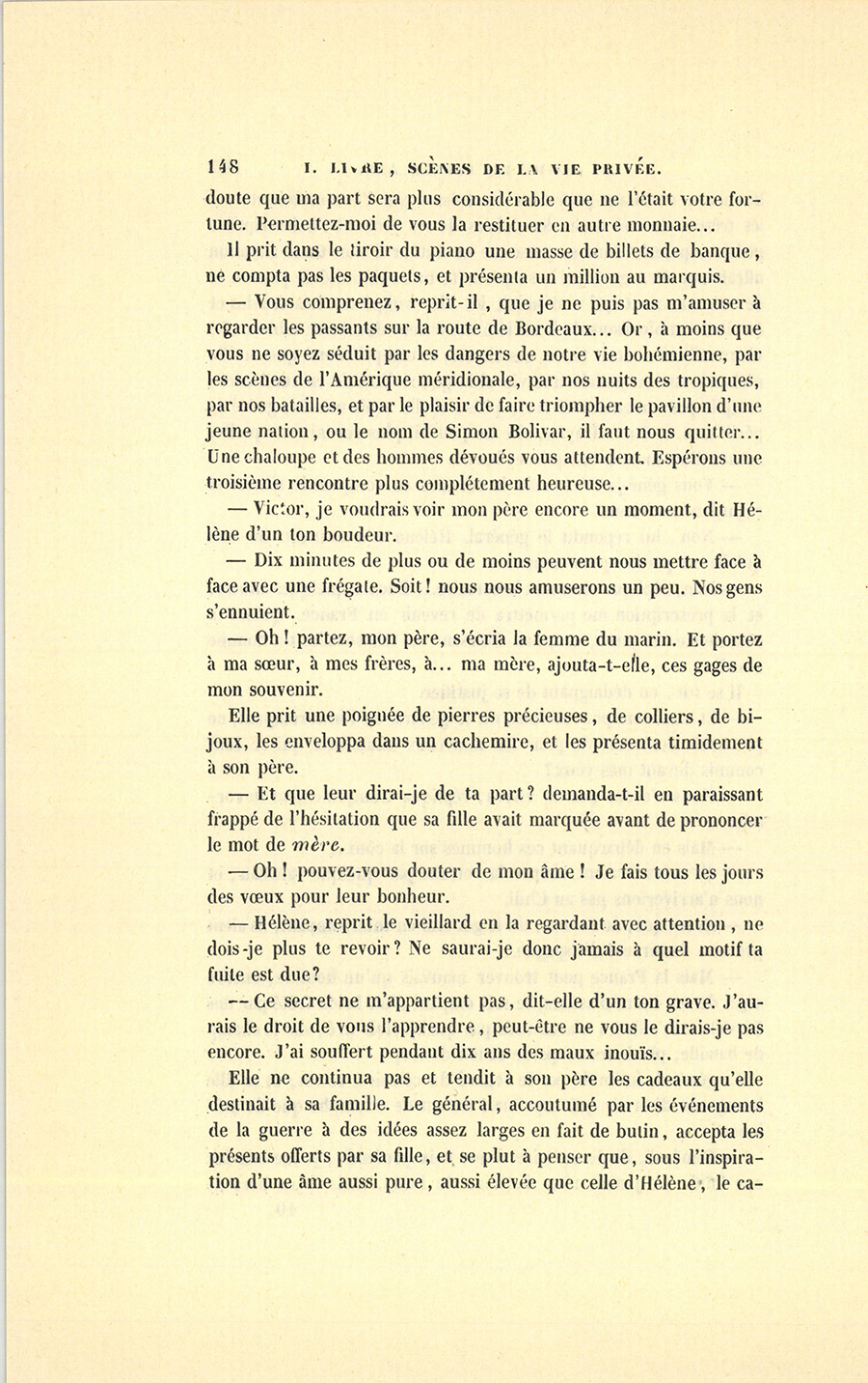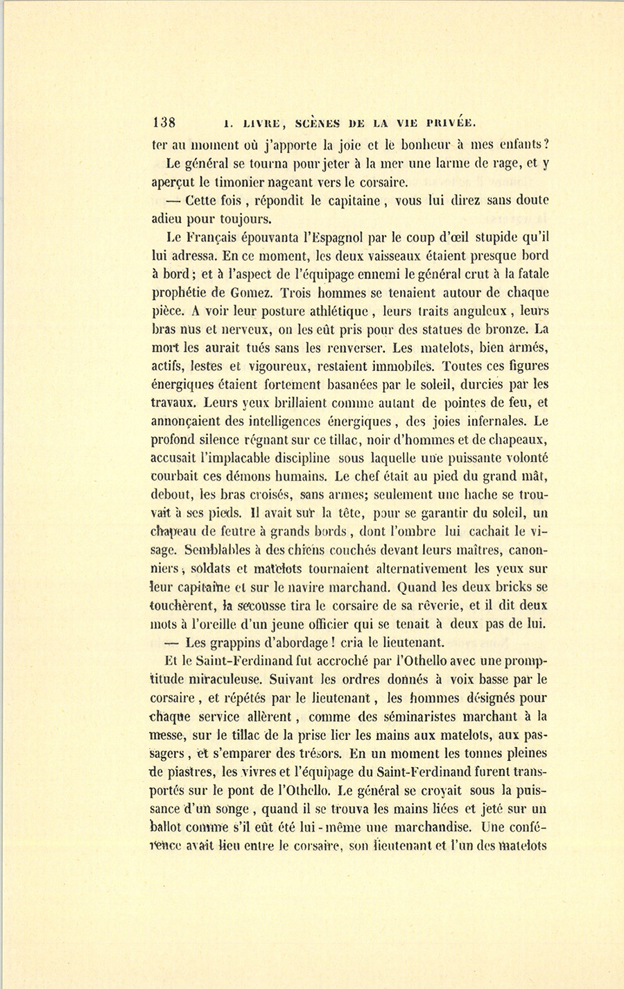 – Général, dit le corsaire d’une voix profonde, je me suis fait une loi de ne jamais rien distraire du butin. Mais il est hors de {p. 148} doute que ma part sera plus considérable que ne l’était votre fortune. Permettez-moi de vous la restituer en autre monnaie…