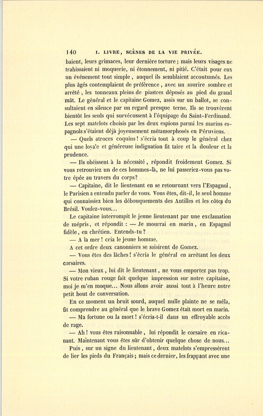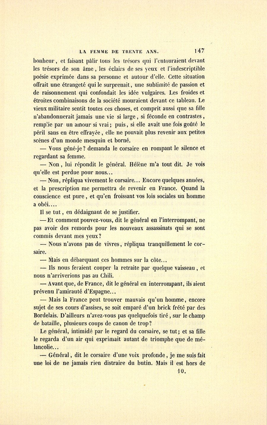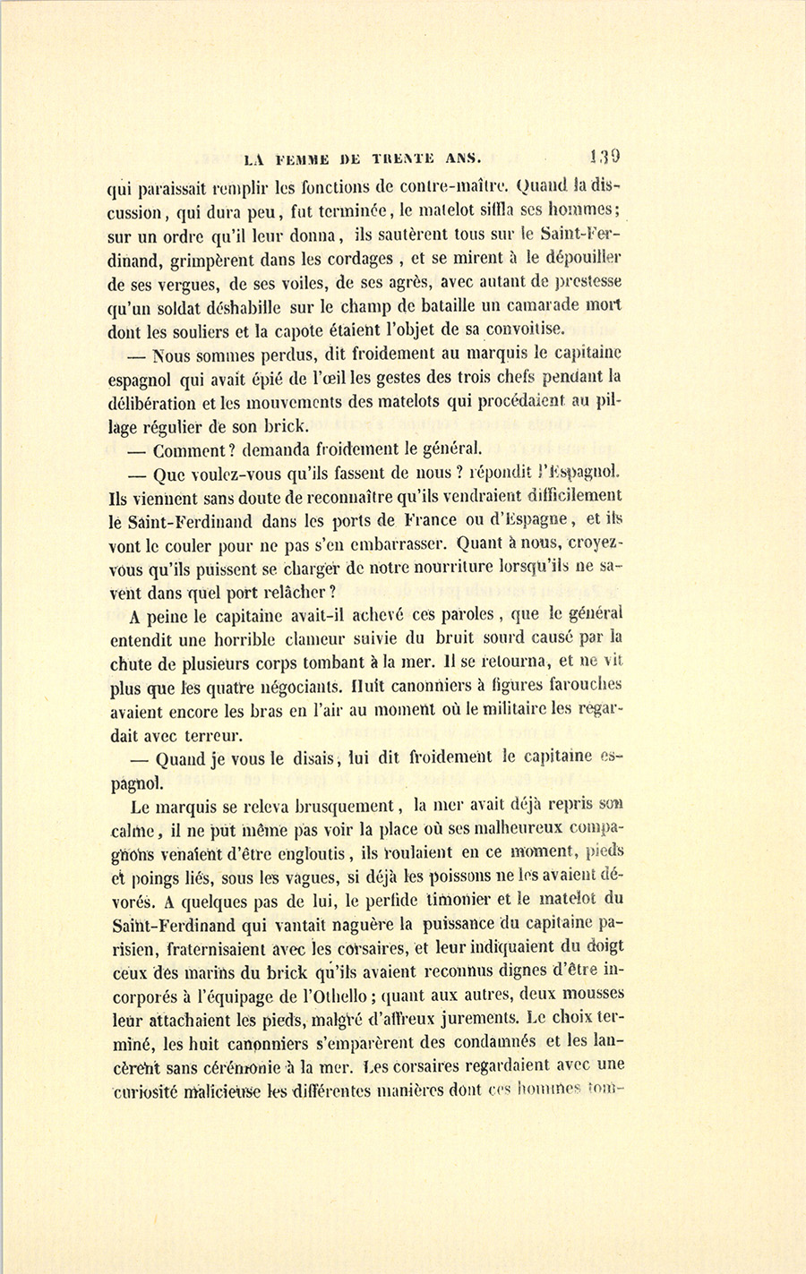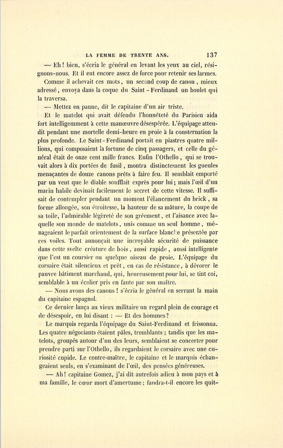 – Général, dit le corsaire d’une voix profonde, je me suis fait une loi de ne jamais rien distraire du butin. Mais il est hors de {p. 148} doute que ma part sera plus considérable que ne l’était votre fortune. Permettez-moi de vous la restituer en autre monnaie…