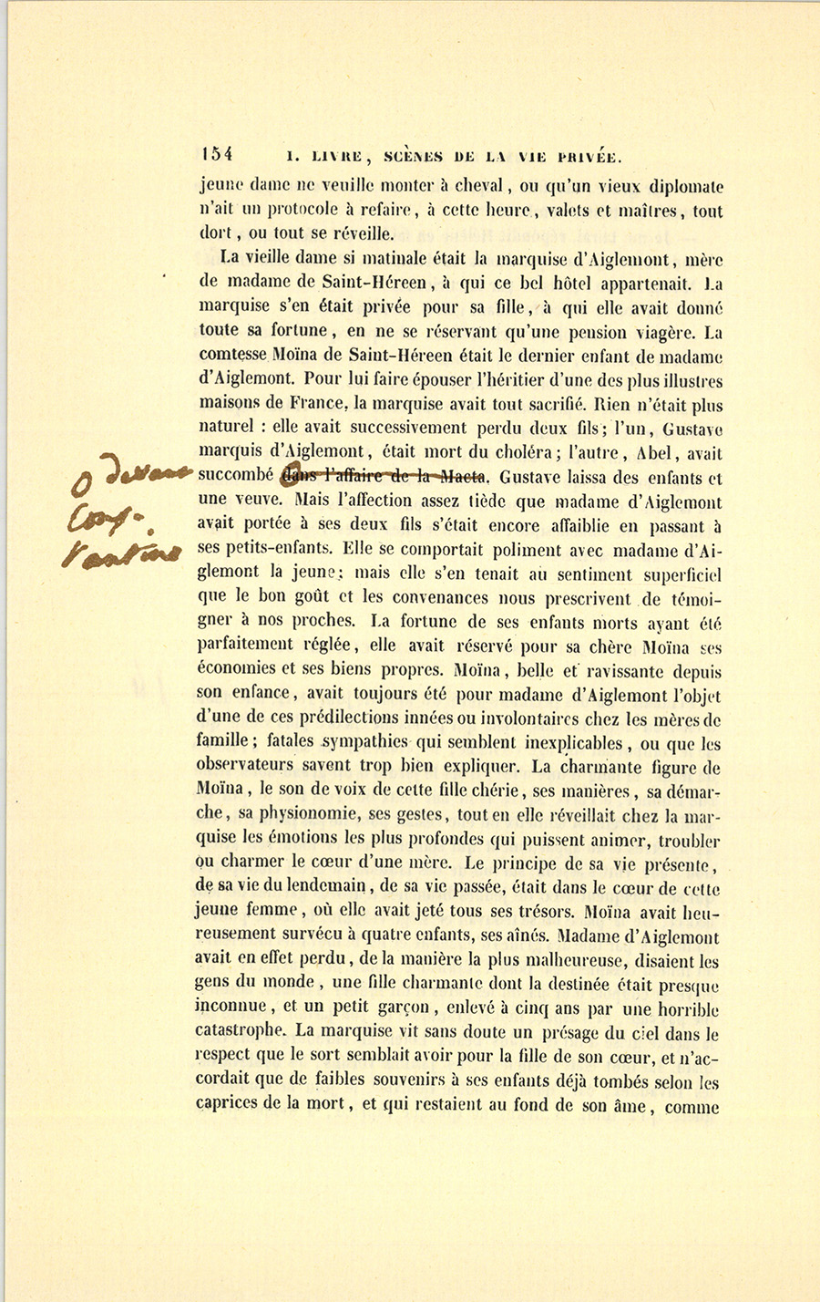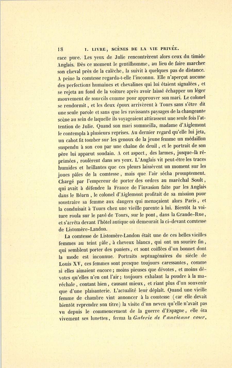 La comtesse de Listomère-Landon était une de ces belles vieilles femmes au teint pâle, à cheveux blancs, qui ont un sourire fin, qui semblent porter des paniers, et sont coiffées d’un bonnet dont la mode est inconnue. Portraits septuagénaires du siècle de Louis XV, ces femmes sont presque toujours caressantes, comme si elles aimaient encore ; moins pieuses que dévotes, et moins dévotes qu’elles n’en ont l’air ; toujours exhalant la poudre à la maréchale, contant bien, causant mieux, et riant plus d’un souvenir que d’une plaisanterie. L’actualité leur déplaît. Quand une vieille femme de chambre vint annoncer à la comtesse (car elle devait bientôt reprendre son titre) la visite d’un neveu qu’elle n’avait pas vu depuis le commencement de la guerre d’Espagne, elle ôta vivement ses lunettes, ferma la Galerie de l’ancienne cour, {p. 19} son livre favori ; puis elle retrouva une sorte d’agilité pour arriver sur son perron au moment où les deux époux en montaient les marches.