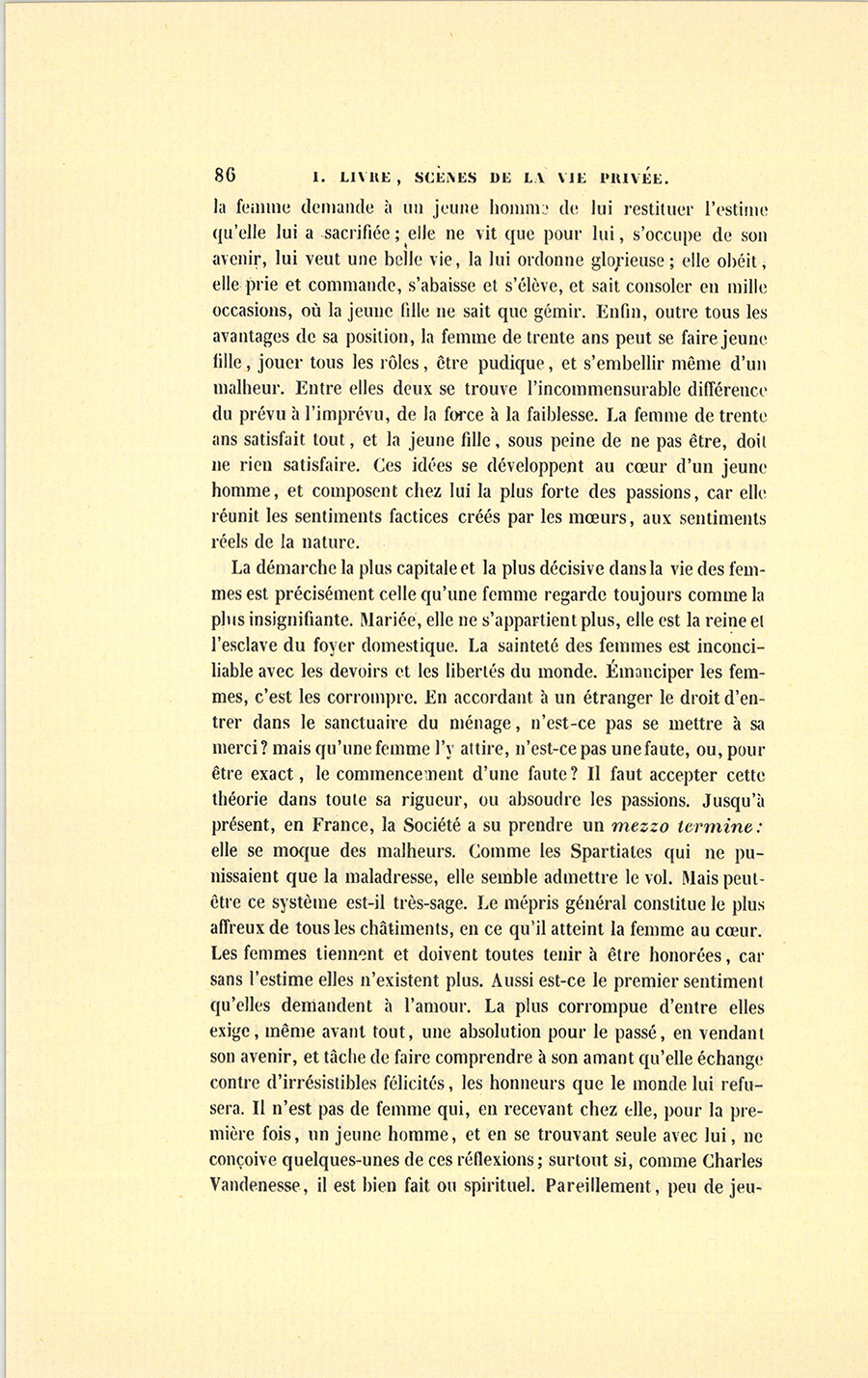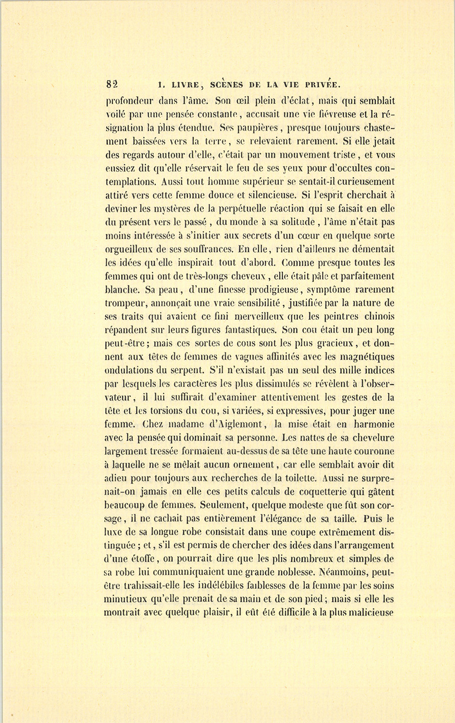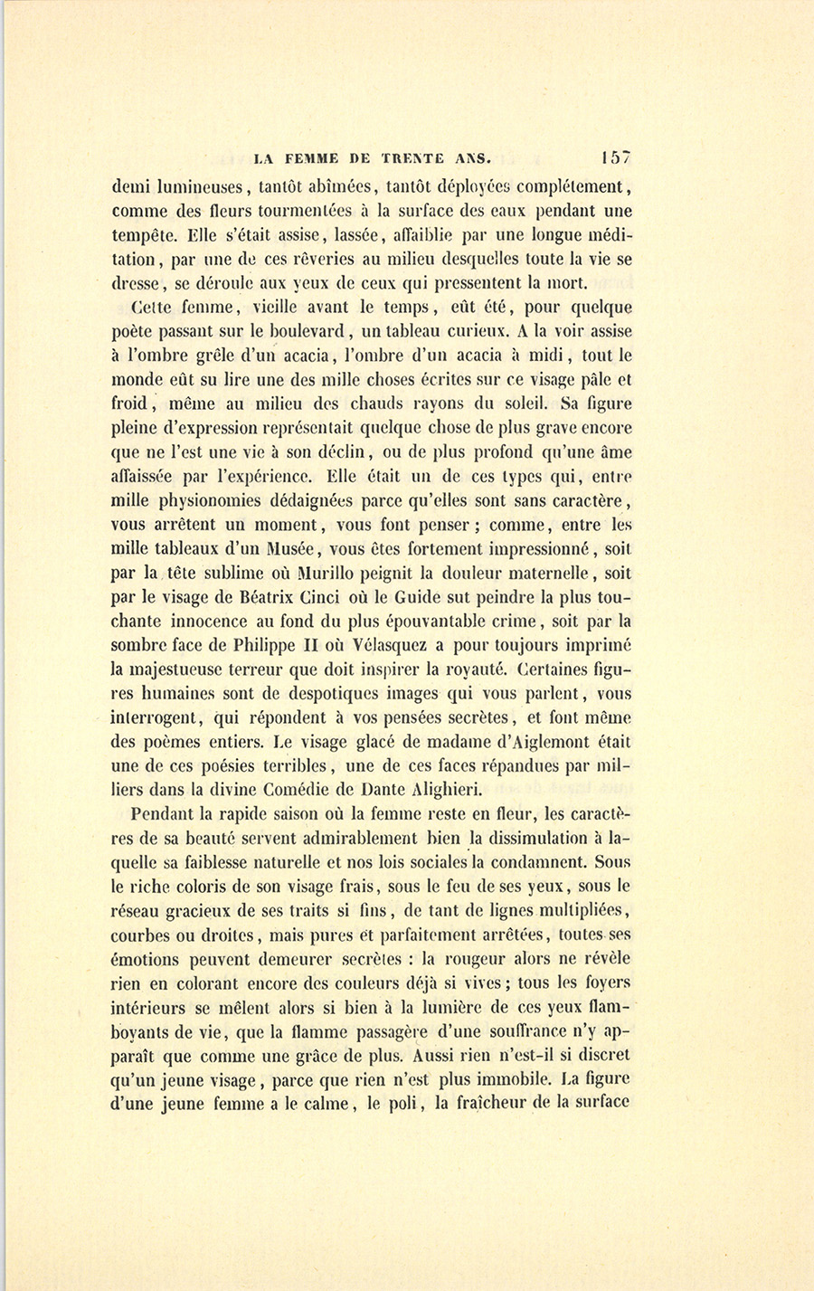 Cette femme, vieille avant le temps, eût été, pour quelque poète passant sur le boulevard, un tableau curieux. À la voir assise à l’ombre grêle d’un acacia, l’ombre d’un acacia à midi, tout le monde eût su lire une des mille choses écrites sur ce visage pâle et froid, même au milieu des chauds rayons du soleil. Sa figure pleine d’expression représentait quelque chose de plus grave encore que ne l’est une vie à son déclin, ou de plus profond qu’une âme affaissée par l’expérience. Elle était un de ces types qui, entre mille physionomies dédaignées parce qu’elles sont sans caractère, vous arrêtent un moment, vous font penser ; comme, entre les mille tableaux d’un Musée, vous êtes fortement impressionné, soit par la tête sublime où Murillo peignit la douleur maternelle, soit par le visage de Béatrix Cinci où le Guide sut peindre la plus touchante innocence au fond du plus épouvantable crime, soit par la sombre face de Philippe II où Vélasquez a pour toujours imprimé la majestueuse terreur que doit inspirer la royauté. Certaines figures humaines sont de despotiques images qui vous parlent, vous interrogent, qui répondent à vos pensées secrètes, et font même des poèmes entiers. Le visage glacé de madame d’Aiglemont était une de ces poésies terribles, une de ces faces répandues par milliers dans la divine Comédie de Dante Alighieri.