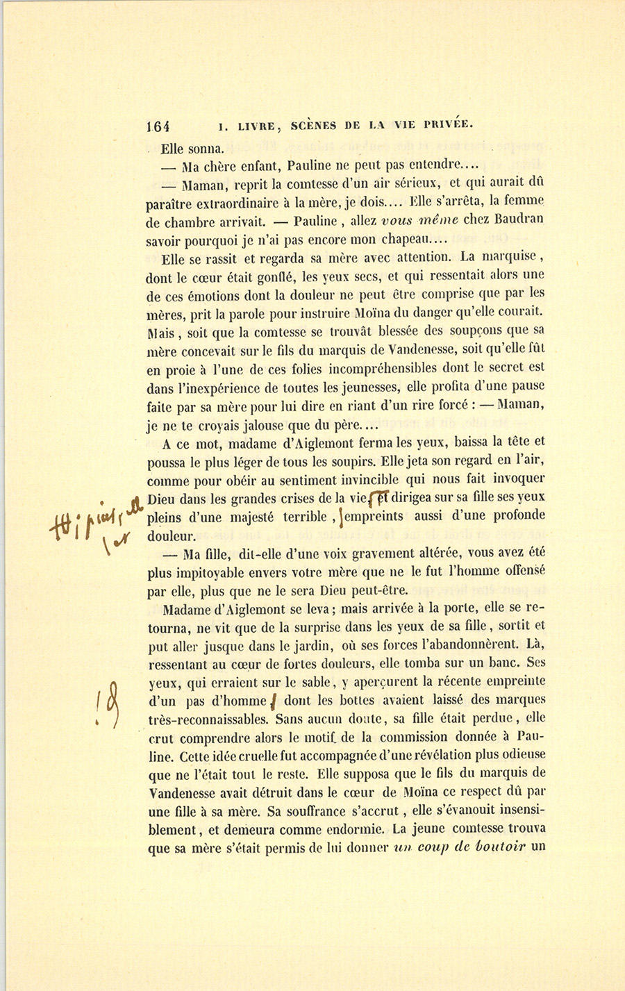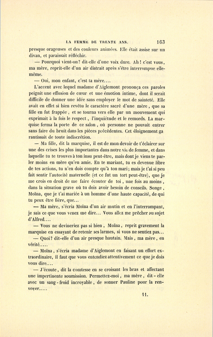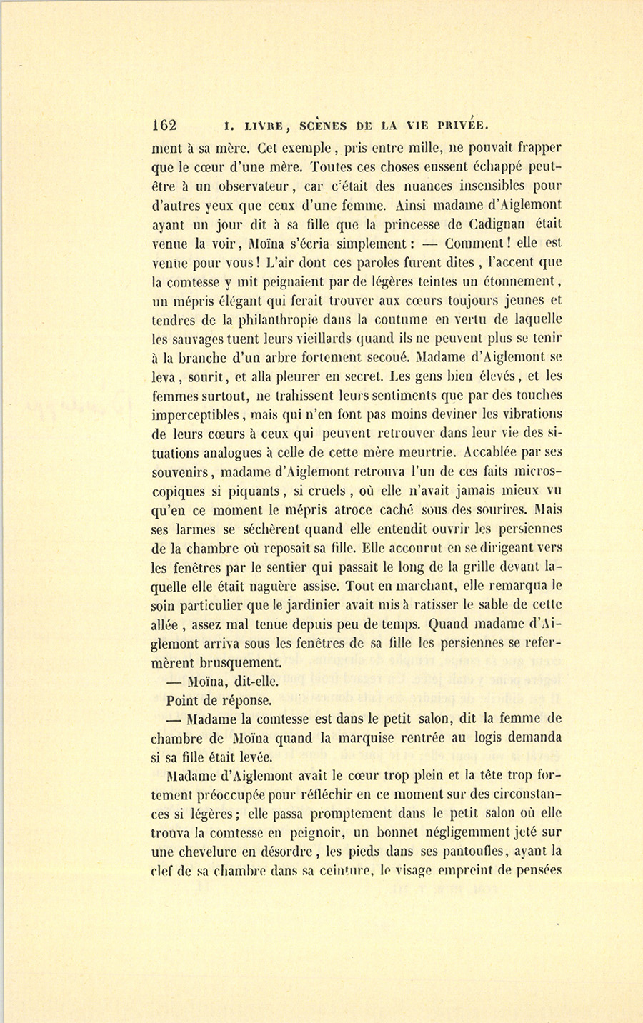 Madame d’Aiglemont avait le cœur trop plein et la tête trop fortement préoccupée pour réfléchir en ce moment sur des circonstances si légères ; elle passa promptement dans le petit salon où elle trouva la comtesse en peignoir, un bonnet négligemment jeté sur une chevelure en désordre, les pieds dans ses pantoufles, ayant la clef de sa chambre dans sa ceinture, le visage empreint de pensées {p. 163} presque orageuses et des couleurs animées. Elle était assise sur un divan, et paraissait réfléchir.