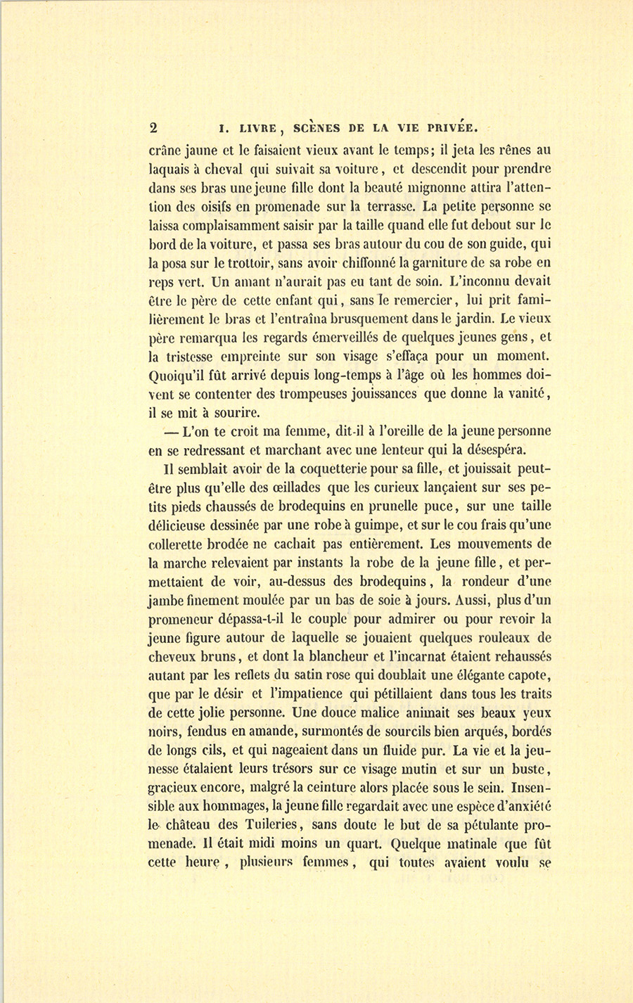 Au commencement du mois d’avril 1813, il y eut un dimanche dont la matinée promettait un de ces beaux jours où les Parisiens voient pour la première fois de l’année leurs pavés sans boue et leur ciel sans nuages. Avant midi, un cabriolet à pompe attelé de deux chevaux fringants déboucha dans la rue de Rivoli par la rue Castiglione, et s’arrêta derrière plusieurs équipages stationnés à la grille nouvellement ouverte au milieu de la terrasse des Feuillants. Cette leste voiture était conduite par un homme en apparence soucieux et maladif ; des cheveux grisonnants couvraient à peine son {p. 2} crâne jaune et le faisaient vieux avant le temps ; il jeta les rênes au laquais à cheval qui suivait sa voiture, et descendit pour prendre dans ses bras une jeune fille dont la beauté mignonne attira l’attention des oisifs en promenade sur la terrasse. La petite personne se laissa complaisamment saisir par la taille quand elle fut debout sur le bord de la voiture, et passa ses bras autour du cou de son guide, qui la posa sur le trottoir, sans avoir chiffonné la garniture de sa robe en reps vert. Un amant n’aurait pas eu tant de soin. L’inconnu devait être le père de cette enfant qui, sans le remercier, lui prit familièrement le bras et l’entraîna brusquement dans le jardin. Le vieux père remarqua les regards émerveillés de quelques jeunes gens, et la tristesse empreinte sur son visage s’effaça pour un moment. Quoiqu’il fût arrivé depuis long-temps à l’âge où les hommes doivent se contenter des trompeuses jouissances que donne la vanité, il se mit à sourire.