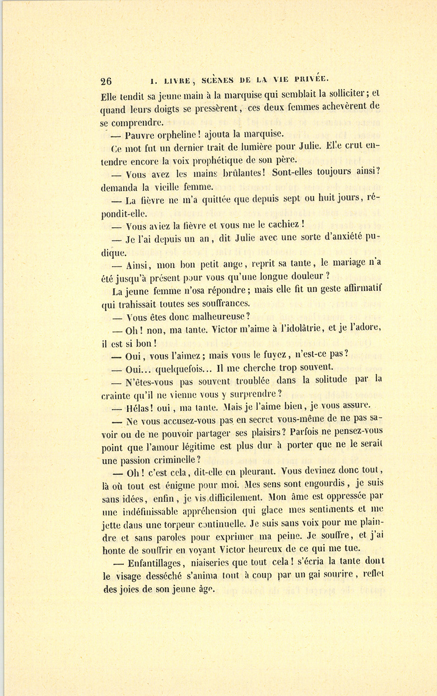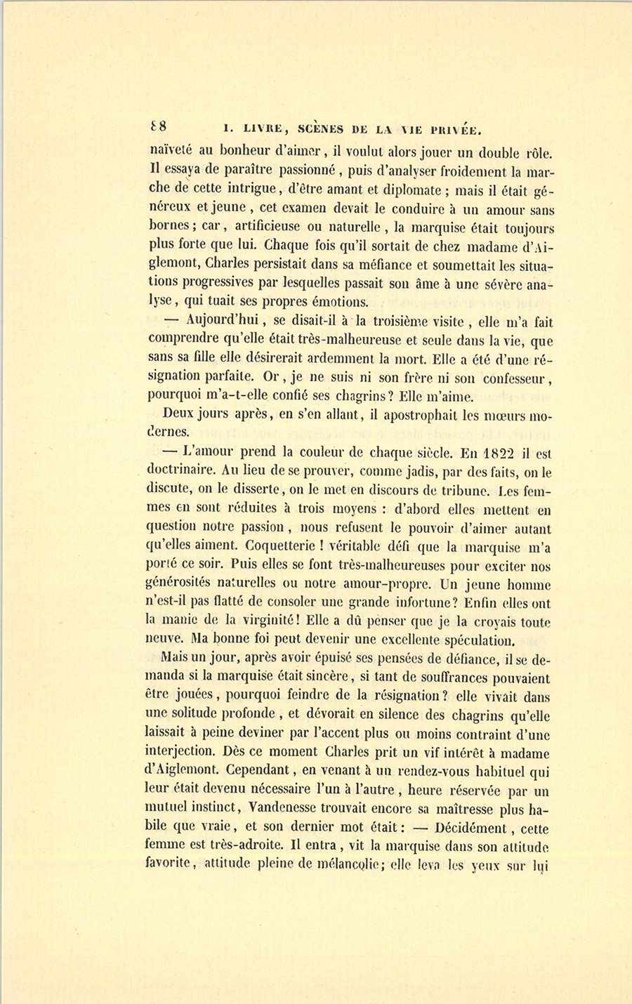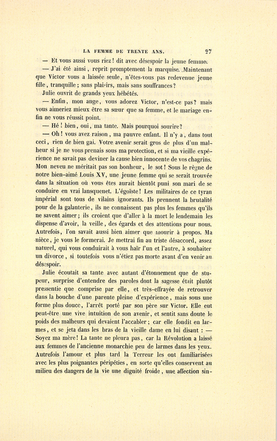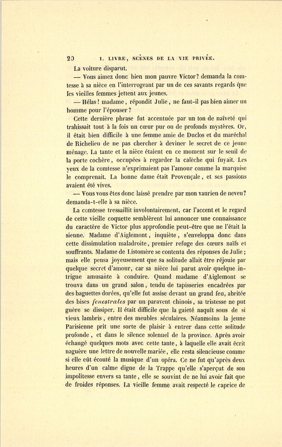 {p. 23} Ces derniers mots réveillèrent la comtesse comme par magie. Elle laissa échapper un geste et un sourire qui surprirent la marquise. Loin de témoigner cette satisfaction instinctive ressentie même par la femme la plus sévère quand elle apprend qu’elle fait un malheureux, le regard de Julie fut terne et froid. Son visage indiquait un sentiment de répulsion voisin de l’horreur. Cette proscription n’était pas celle qu’une femme aimante frappe sur le monde entier au profit d’un seul être ; elle sait alors rire et plaisanter ; non, Julie était en ce moment comme une personne à qui le souvenir d’un danger trop vivement présent en fait ressentir encore la douleur. La tante, bien convaincue que sa nièce n’aimait pas son neveu, fut stupéfaite en découvrant qu’elle n’aimait personne. Elle trembla d’avoir à reconnaître en Julie un cœur désenchanté, une jeune femme à qui l’expérience d’un jour, d’une nuit peut-être, avait suffi pour apprécier la nullité de Victor.