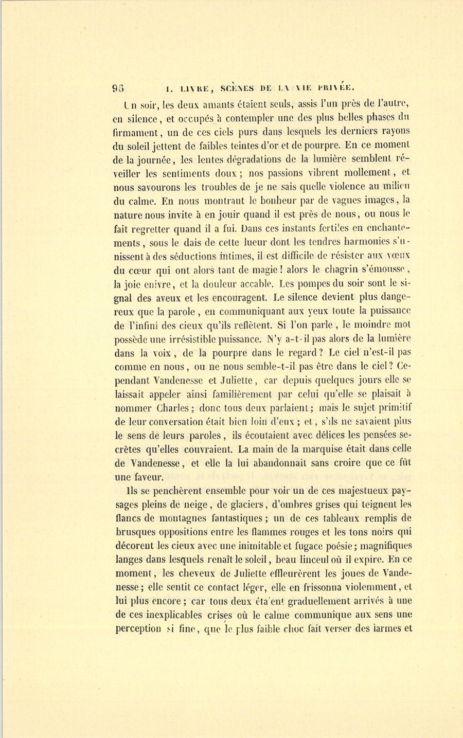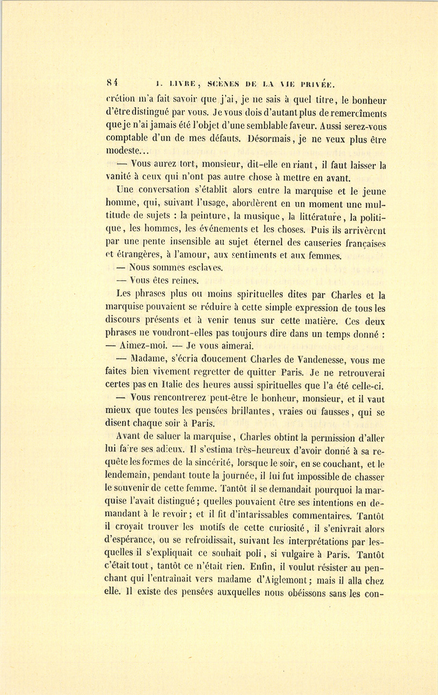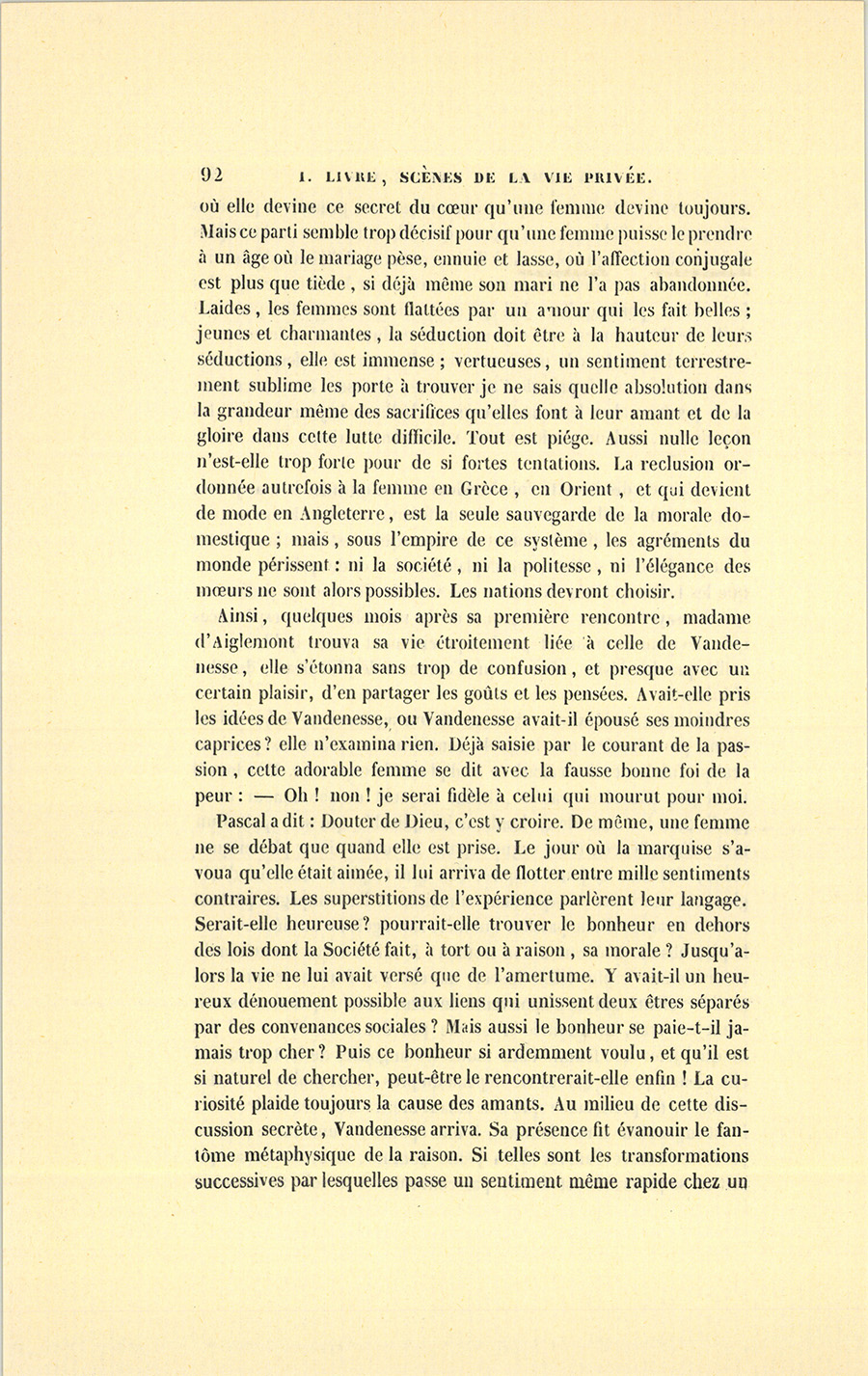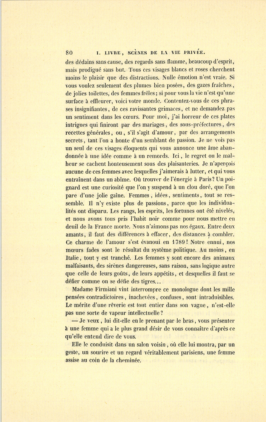 {p. 23} Ces derniers mots réveillèrent la comtesse comme par magie. Elle laissa échapper un geste et un sourire qui surprirent la marquise. Loin de témoigner cette satisfaction instinctive ressentie même par la femme la plus sévère quand elle apprend qu’elle fait un malheureux, le regard de Julie fut terne et froid. Son visage indiquait un sentiment de répulsion voisin de l’horreur. Cette proscription n’était pas celle qu’une femme aimante frappe sur le monde entier au profit d’un seul être ; elle sait alors rire et plaisanter ; non, Julie était en ce moment comme une personne à qui le souvenir d’un danger trop vivement présent en fait ressentir encore la douleur. La tante, bien convaincue que sa nièce n’aimait pas son neveu, fut stupéfaite en découvrant qu’elle n’aimait personne. Elle trembla d’avoir à reconnaître en Julie un cœur désenchanté, une jeune femme à qui l’expérience d’un jour, d’une nuit peut-être, avait suffi pour apprécier la nullité de Victor.