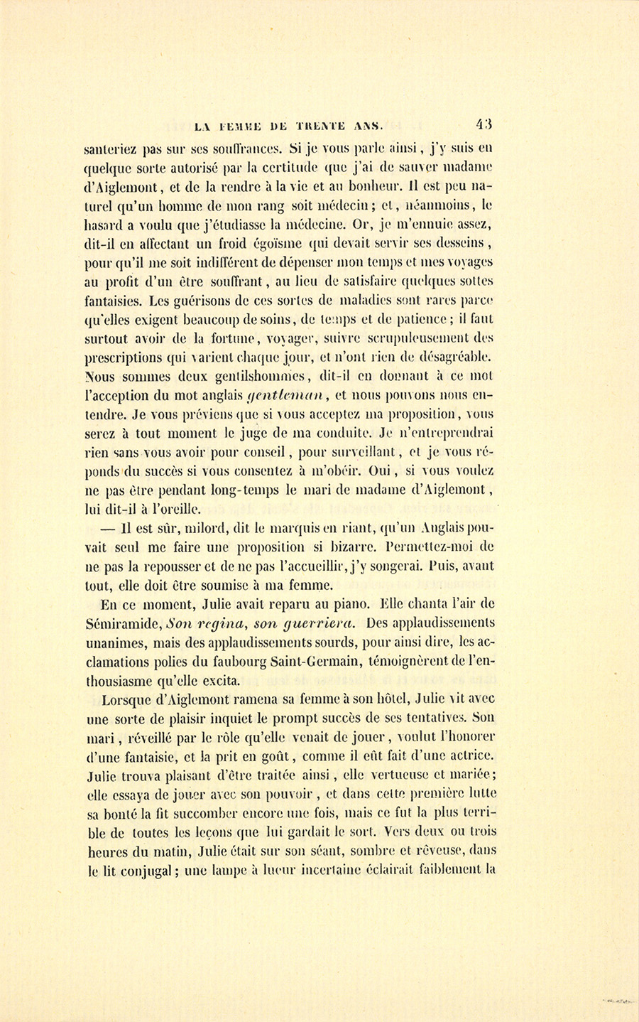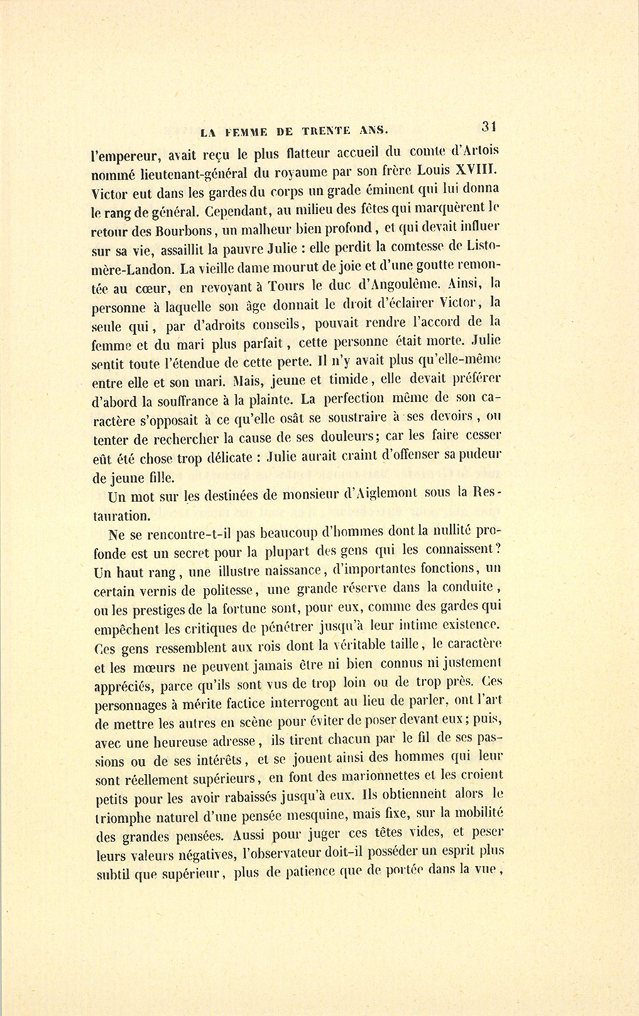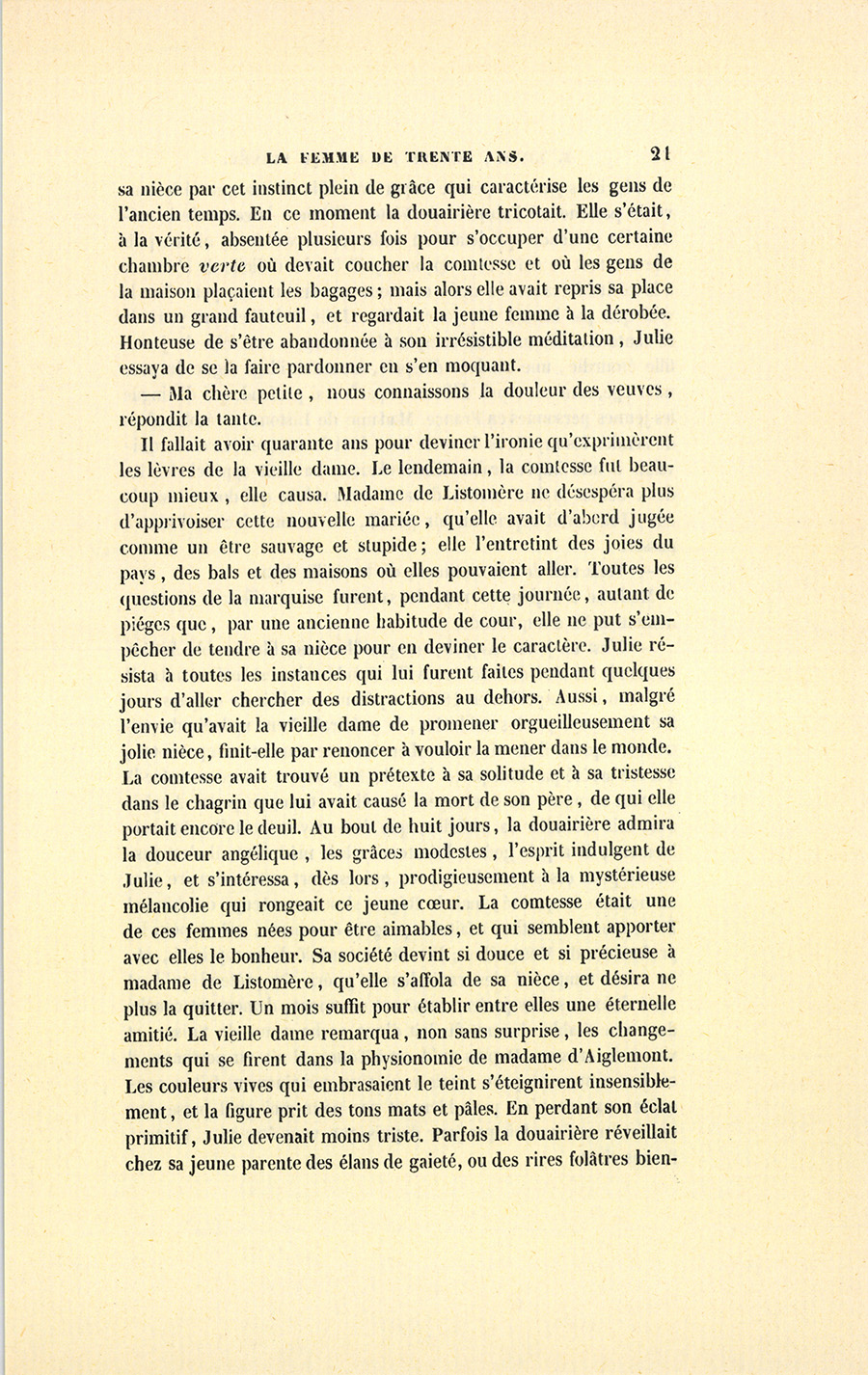 Il fallait avoir quarante ans pour deviner l’ironie qu’exprimèrent les lèvres de la vieille dame. Le lendemain, la comtesse fut beaucoup mieux, elle causa. Madame de Listomère ne désespéra plus d’apprivoiser cette nouvelle mariée, qu’elle avait d’abord jugée comme un être sauvage et stupide ; elle l’entretint des joies du pays, des bals et des maisons où elles pouvaient aller. Toutes les questions de la marquise furent, pendant cette journée, autant de piéges que, par une ancienne habitude de cour, elle ne put s’empêcher de tendre à sa nièce pour en deviner le caractère. Julie résista à toutes les instances qui lui furent faites pendant quelques jours d’aller chercher des distractions au dehors. Aussi, malgré l’envie qu’avait la vieille dame de promener orgueilleusement sa jolie nièce, finit-elle par renoncer à vouloir la mener dans le monde. La comtesse avait trouvé un prétexte à sa solitude et à sa tristesse dans le chagrin que lui avait causé la mort de son père, de qui elle portait encore le deuil. Au bout de huit jours, la douairière admira la douceur angélique, les grâces modestes, l’esprit indulgent de Julie, et s’intéressa, dès lors, prodigieusement à la mystérieuse mélancolie qui rongeait ce jeune cœur. La comtesse était une de ces femmes nées pour être aimables, et qui semblent apporter avec elles le bonheur. Sa société devint si douce et si précieuse à madame de Listomère, qu’elle s’affola de sa nièce, et désira ne plus la quitter. Un mois suffit pour établir entre elles une éternelle amitié. La vieille dame remarqua, non sans surprise, les changements qui se firent dans la physionomie de madame d’Aiglemont. Les couleurs vives qui embrasaient le teint s’éteignirent insensiblement, et la figure prit des tons mats et pâles. En perdant son éclat primitif, Julie devenait moins triste. Parfois la douairière réveillait chez sa jeune parente des élans de gaieté, ou des rires folâtres {p. 22} bientôt réprimés par une pensée importune. Elle devina que ni le souvenir paternel ni l’absence de Victor n’étaient la cause de la mélancolie profonde qui jetait un voile sur la vie de sa nièce ; puis elle eut tant de mauvais soupçons, qu’il lui fut difficile de s’arrêter à la véritable cause du mal, car nous ne rencontrons peut-être le vrai que par hasard. Un jour, enfin, Julie fit briller aux yeux de sa tante étonnée un oubli complet du mariage, une folie de jeune fille étourdie, une candeur d’esprit, un enfantillage digne du premier âge, tout cet esprit délicat, et parfois si profond, qui distingue les jeunes personnes en France. Madame de Listomère résolut alors de sonder les mystères de cette âme dont le naturel extrême équivalait à une impénétrable dissimulation. La nuit approchait, les deux dames étaient assises devant une croisée qui donnait sur la rue, Julie avait repris un air pensif, un homme à cheval vint à passer.