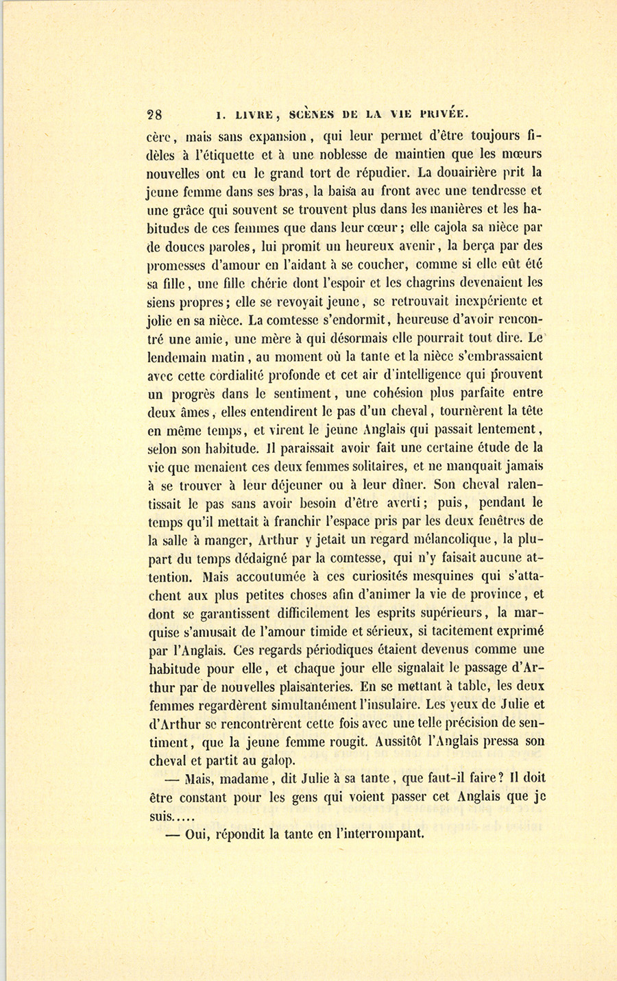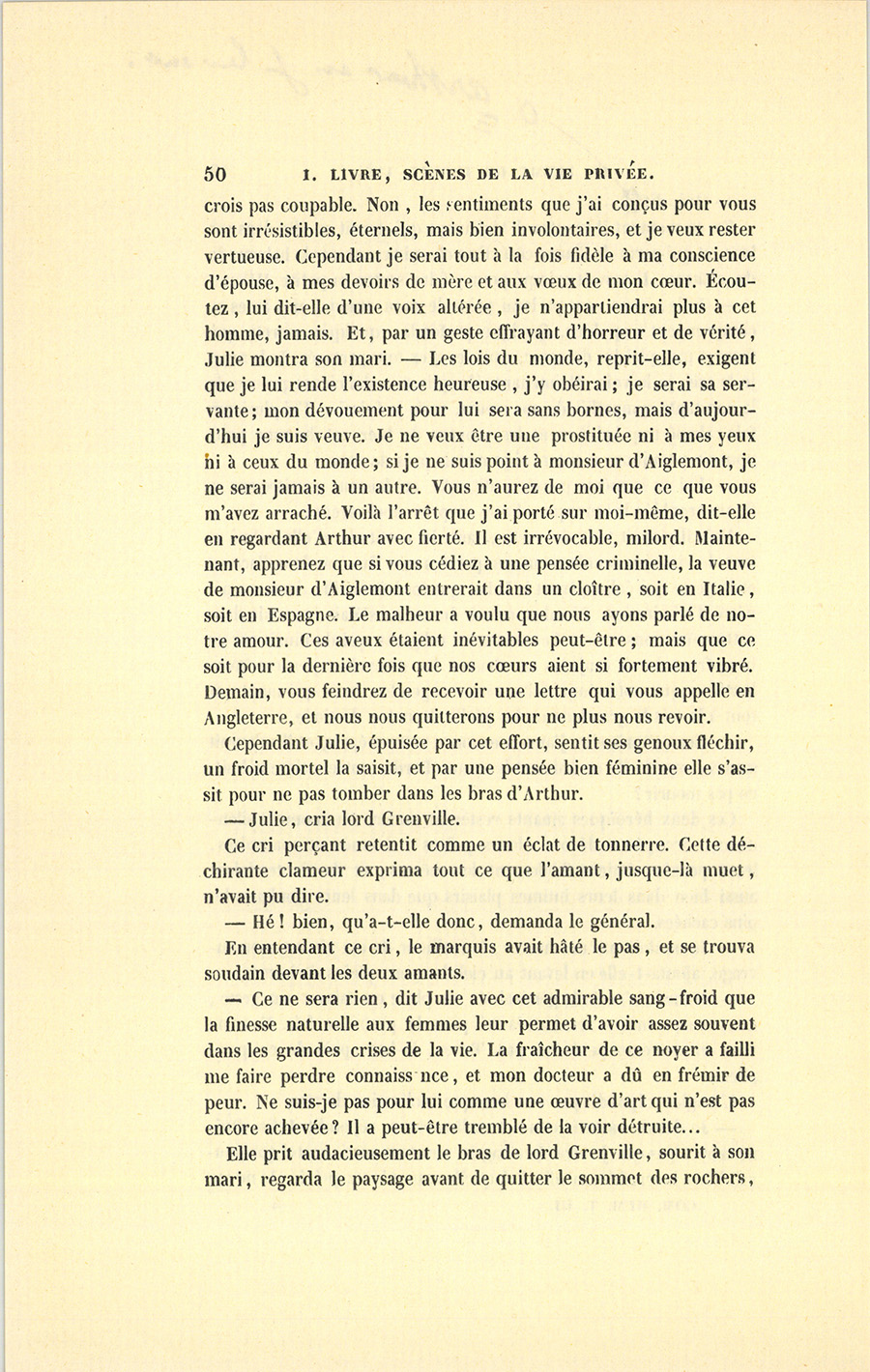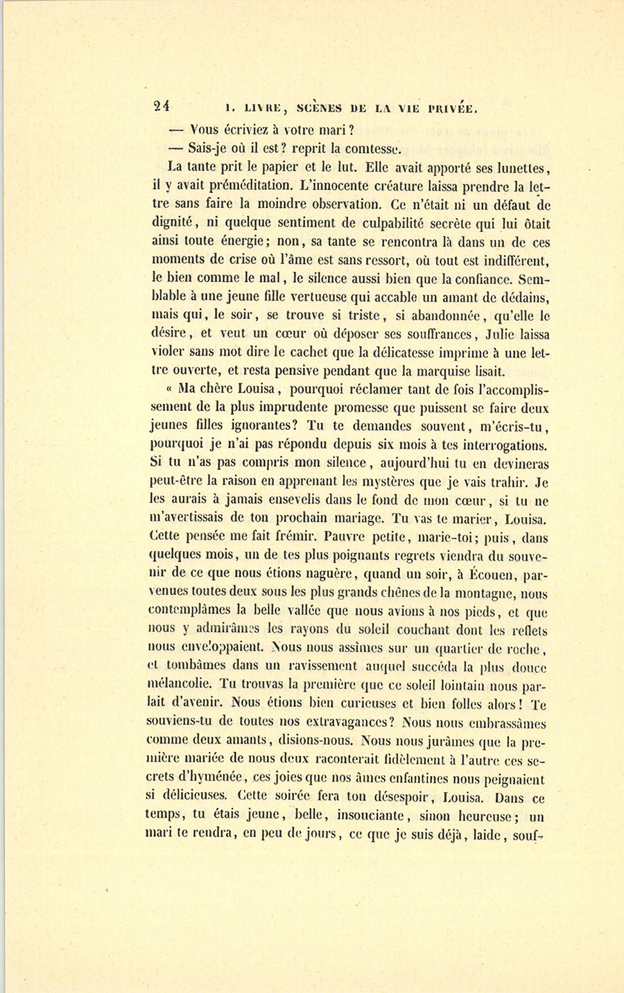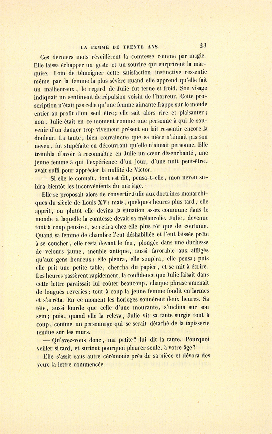 Elle se proposait alors de convertir Julie aux doctrines monarchiques du siècle de Louis XV ; mais, quelques heures plus tard, elle apprit, ou plutôt elle devina la situation assez commune dans le monde à laquelle la comtesse devait sa mélancolie. Julie, devenue tout à coup pensive, se retira chez elle plus tôt que de coutume. Quand sa femme de chambre l’eut déshabillée et l’eut laissée prête à se coucher, elle resta devant le feu, plongée dans une duchesse de velours jaune, meuble antique, aussi favorable aux affligés qu’aux gens heureux ; elle pleura, elle soupira, elle pensa ; puis elle prit une petite table, chercha du papier, et se mit à écrire. Les heures passèrent rapidement, la confidence que Julie faisait dans cette lettre paraissait lui coûter beaucoup, chaque phrase amenait de longues rêveries ; tout à coup la jeune femme fondit en larmes et s’arrêta. En ce moment les horloges sonnèrent deux heures. Sa tête, aussi lourde que celle d’une mourante, s’inclina sur son sein ; puis, quand elle la releva, Julie vit sa tante surgie tout à coup, comme un personnage qui se serait détaché de la tapisserie tendue sur les murs.