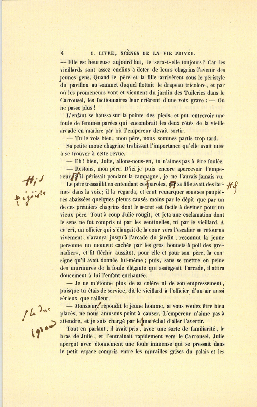 À voir le mouvement qu’elle imprimait à son bras droit, vous eussiez dit qu’elle s’en aidait pour courir. Sa petite main, bien gantée, froissait impatiemment un mouchoir, et ressemblait à la rame d’une barque qui fend les ondes. Le vieillard souriait par moments ; mais parfois aussi des expressions soucieuses attristaient passagèrement sa figure desséchée. Son amour pour cette belle créature lui faisait autant admirer le présent que craindre l’avenir. Il semblait se dire : {p. 4} – Elle est heureuse aujourd’hui, le sera-t-elle toujours ? Car les vieillards sont assez enclins à doter de leurs chagrins l’avenir des jeunes gens. Quand le père et la fille arrivèrent sous le péristyle du pavillon au sommet duquel flottait le drapeau tricolore, et par où les promeneurs vont et viennent du jardin des Tuileries dans le Carrousel, les factionnaires leur crièrent d’une voix grave : – On ne passe plus !