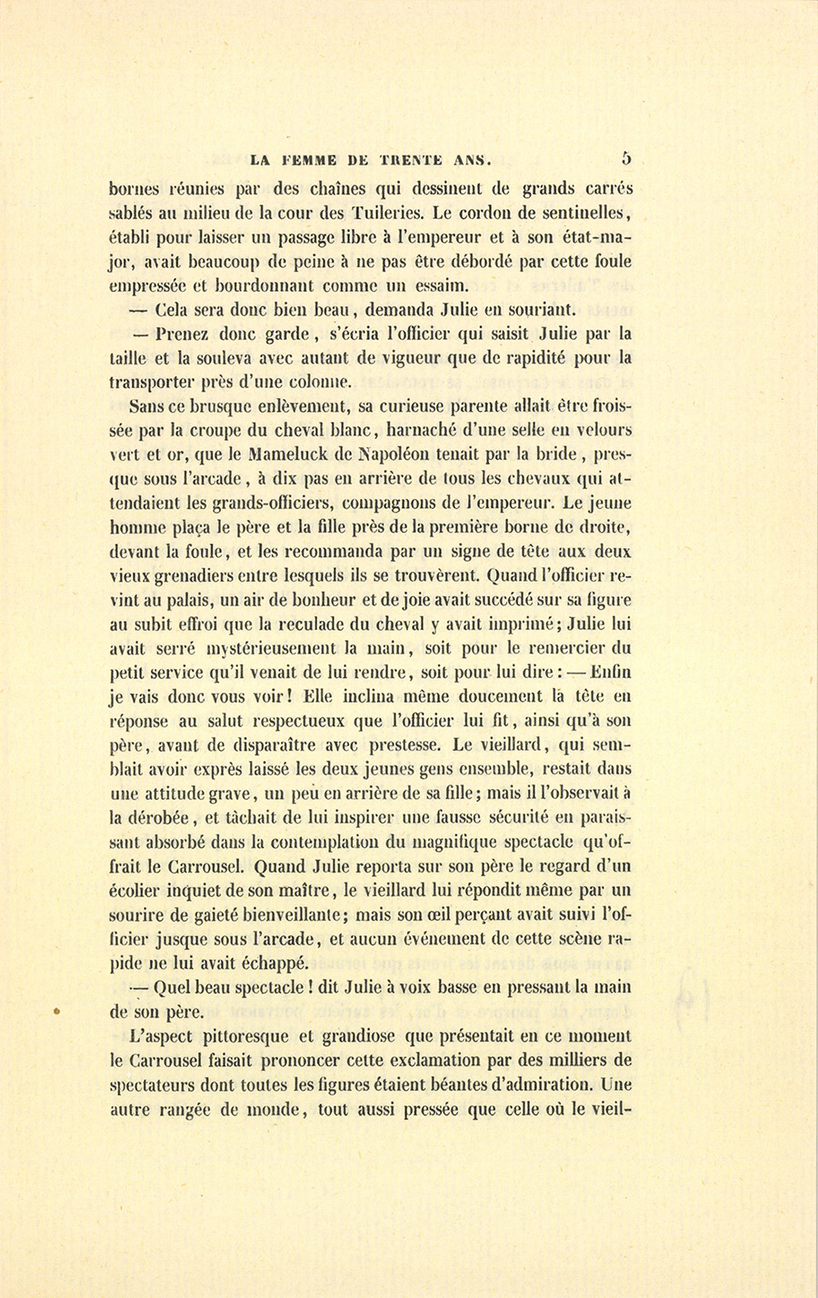 Tout en parlant, il avait pris, avec une sorte de familiarité, le bras de Julie, et l’entraînait rapidement vers le Carrousel. Julie aperçut avec étonnement une foule immense qui se pressait dans le petit espace compris entre les murailles grises du palais et les {p. 5} bornes réunies par des chaînes qui dessinent de grands carrés sablés au milieu de la cour des Tuileries. Le cordon de sentinelles, établi pour laisser un passage libre à l’empereur et à son état-major, avait beaucoup de peine à ne pas être débordé par cette foule empressée et bourdonnant comme un essaim.