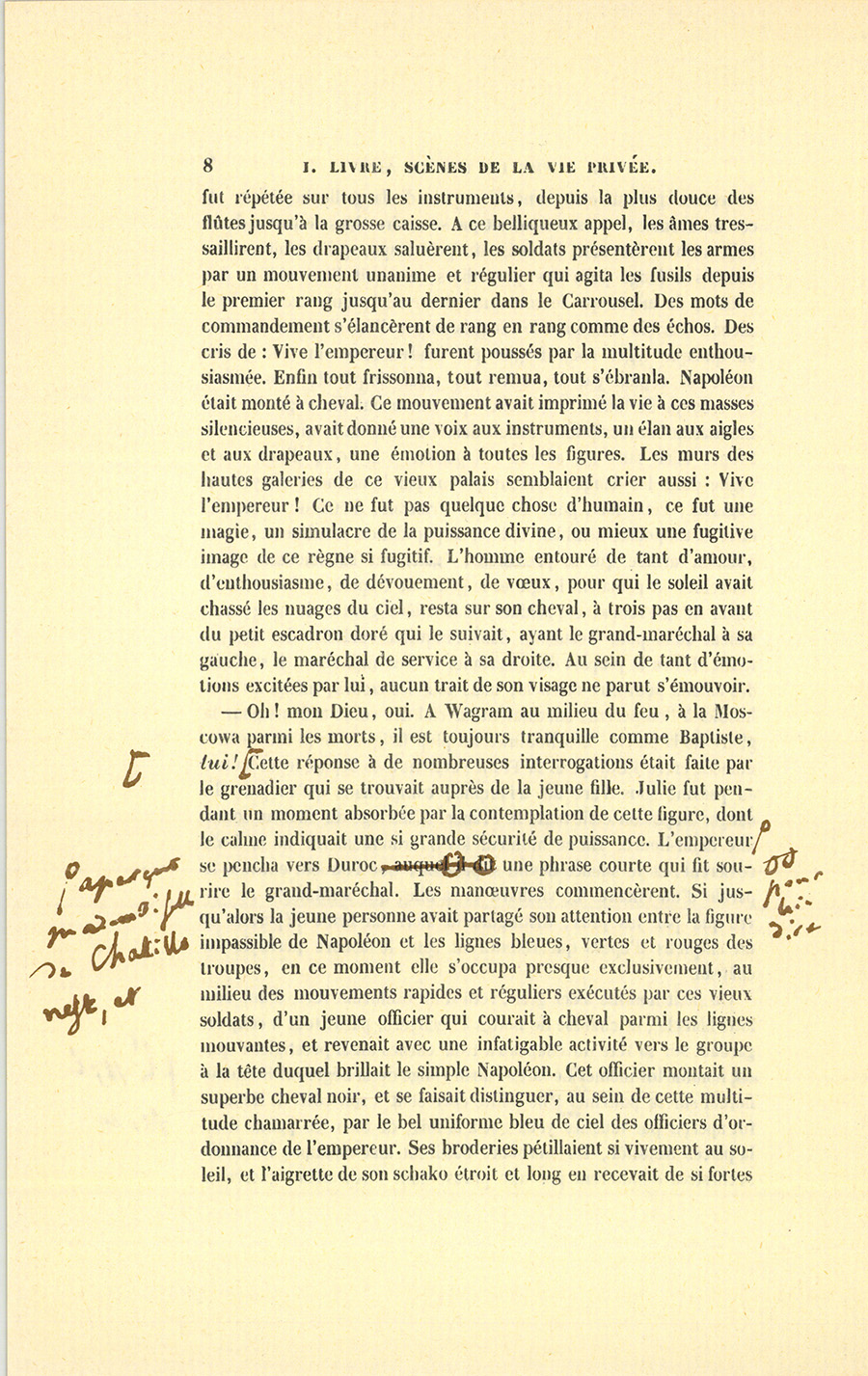 Cette réponse à de nombreuses interrogations était faite par le grenadier qui se trouvait auprès de la jeune fille. Julie fut pendant un moment absorbée par la contemplation de cette figure, dont le calme indiquait une si grande sécurité de puissance. L’empereur aperçut mademoiselle de Chastillonest, et se pencha vers Duroc pour lui dire une phrase courte qui fit sourire le grand-maréchal. Les manœuvres commencèrent. Si jusqu’alors la jeune personne avait partagé son attention entre la figure impassible de Napoléon et les lignes bleues, vertes et rouges des troupes, en ce moment elle s’occupa presque exclusivement, au milieu des mouvements rapides et réguliers exécutés par ces vieux soldats, d’un jeune officier qui courait à cheval parmi les lignes mouvantes, et revenait avec une infatigable activité vers le groupe à la tête duquel brillait le simple Napoléon. Cet officier montait un superbe cheval noir, et se faisait distinguer, au sein de cette multitude chamarrée, par le bel uniforme bleu de ciel des officiers d’ordonnance de l’empereur. Ses broderies pétillaient si vivement au soleil, et l’aigrette de son schako étroit et long en recevait de si fortes {p. 9} lueurs, que les spectateurs durent le comparer à un feu follet, à une âme invisible chargée par l’empereur d’animer, de conduire ces bataillons dont les armes ondoyantes jetaient des flammes, quand, sur un seul signe de ses yeux, ils se brisaient, se rassemblaient, tournoyaient comme les ondes d’un gouffre, ou passaient devant lui comme ces lames longues, droites et hautes que l’Océan courroucé dirige sur ses rivages.
