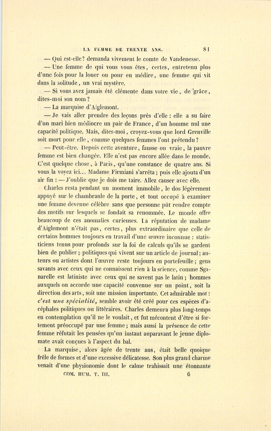 – Le fait est que madame d’Aiglemont n’est jamais seule, disait un fat en appuyant le parti des jeunes dames.