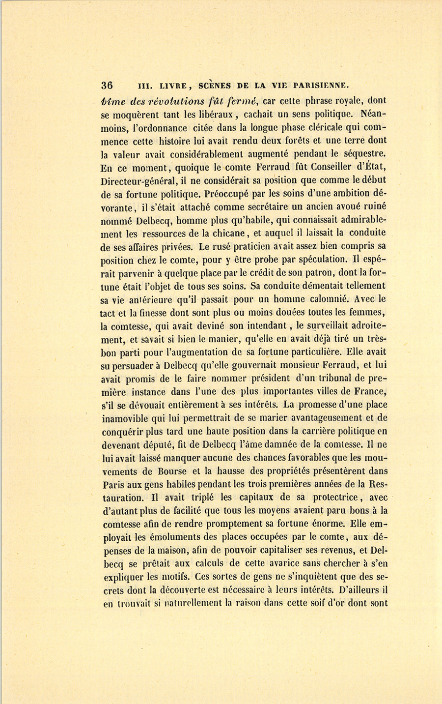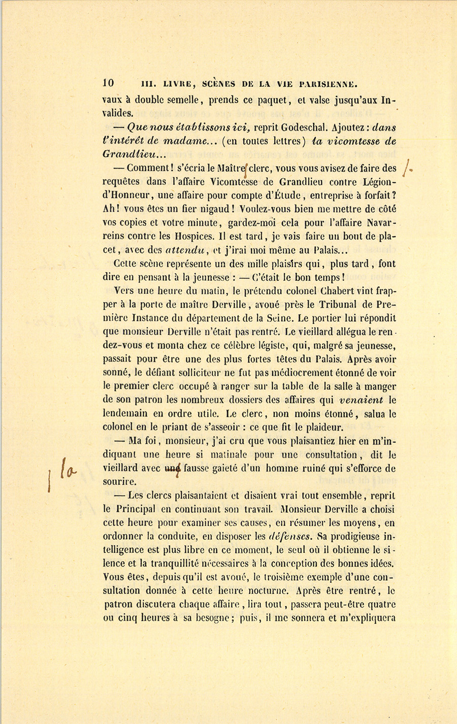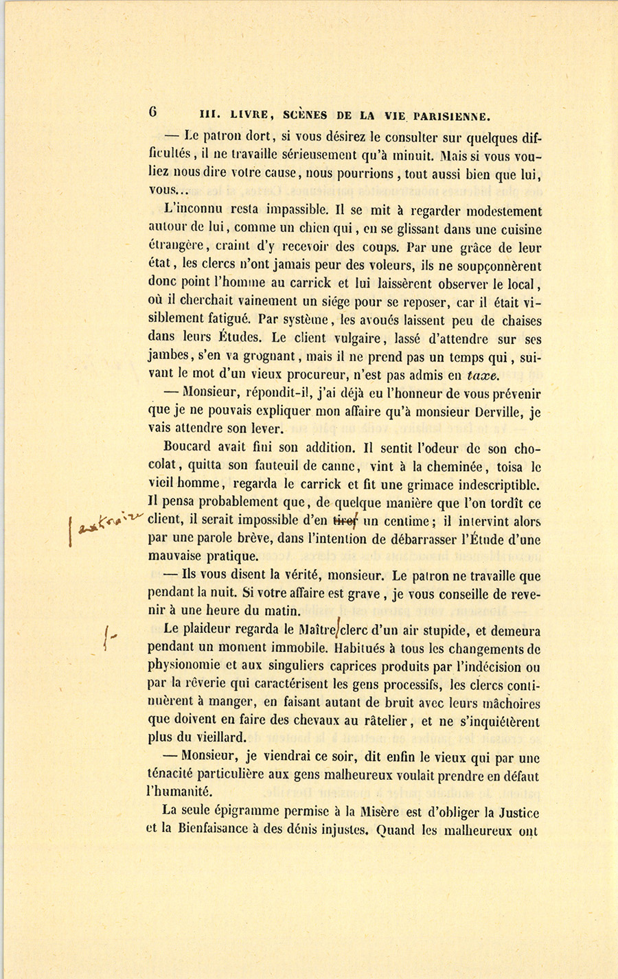 – Quel tour pourrions-nous jouer à ce chinois-là ? dit à voix basse le troisième clerc nommé Godeschal en s’arrêtant au milieu d’un raisonnement qu’il engendrait dans une requête grossoyée par le quatrième clerc et dont les copies étaient faites par deux néophytes venus de province. Puis il continua son improvisation : … Mais, dans sa noble et bienveillante sagesse, Sa Majesté Louis Dix-Huit (mettez en toutes lettres, hé ! Desroches le savant qui faites la Grosse !), au moment où Elle reprit les rênes de son royaume, comprit… (qu’est-ce qu’il comprit, ce gros farceur-là ?) la haute mission à laquelle Elle était appelée par la divine Providence !…… (point admiratif et six points : on est assez religieux au Palais pour nous les passer), et sa première pensée fut, ainsi que le prouve la date de l’ordonnance ci-dessous désignée, de réparer les infortunes causées par les affreux et tristes désastres de nos temps révolutionnaires, en restituant à ses fidèles et nombreux serviteurs (nombreux est une flatterie qui doit plaire au Tribunal) tous leurs biens non vendus, soit qu’ils se trouvassent dans le domaine public, soit qu’ils se trouvassent dans le domaine ordinaire ou extraordinaire de la couronne, soit enfin qu’ils se trouvassent dans les dotations d’établissements publics, car nous sommes et nous nous prétendons habiles à soutenir que tel est l’esprit et le sens de la fameuse et si loyale ordonnance rendue en… – Attendez, dit Godeschal {p. 3} aux trois clercs, cette scélérate de phrase a rempli la fin de ma page. – Eh ! bien, reprit-il en mouillant de sa langue le dos du cahier afin de pouvoir tourner la page épaisse de son papier timbré, eh ! bien, si vous voulez lui faire une farce, il faut lui dire que le patron ne peut parler à ses clients qu’entre deux et trois heures du matin : nous verrons s’il viendra, le vieux malfaiteur ! Et Godeschal reprit la phrase commencée : – rendue en… Y êtes-vous ? demanda-t-il.