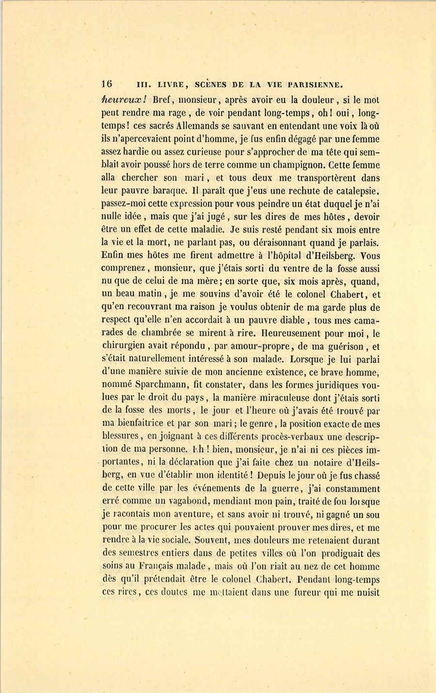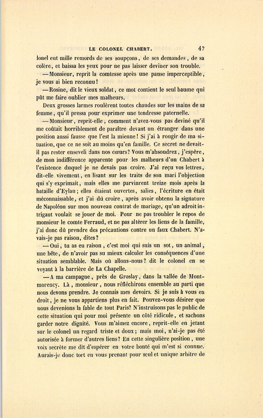 – Monsieur, reprit-elle, comment n’avez-vous pas deviné qu’il me coûtait horriblement de paraître devant un étranger dans une position aussi fausse que l’est la mienne ! Si j’ai à rougir de ma situation, que ce ne soit au moins qu’en famille. Ce secret ne devait-il pas rester enseveli dans nos cœurs ? Vous m’absoudrez, j’espère, de mon indifférence apparente pour les malheurs d’un Chabert à l’existence duquel je ne devais pas croire. J’ai reçu vos lettres, dit-elle vivement, en lisant sur les traits de son mari l’objection qui s’y exprimait, mais elles me parvinrent treize mois après la bataille d’Eylau ; elles étaient ouvertes, salies, l’écriture en était méconnaissable, et j’ai dû croire, après avoir obtenu la signature de Napoléon sur mon nouveau contrat de mariage, qu’un adroit intrigant voulait se jouer de moi. Pour ne pas troubler le repos de monsieur le comte Ferraud, et ne pas altérer les liens de la famille, j’ai donc dû prendre des précautions contre un faux Chabert. N’avais-je pas raison, dites ?