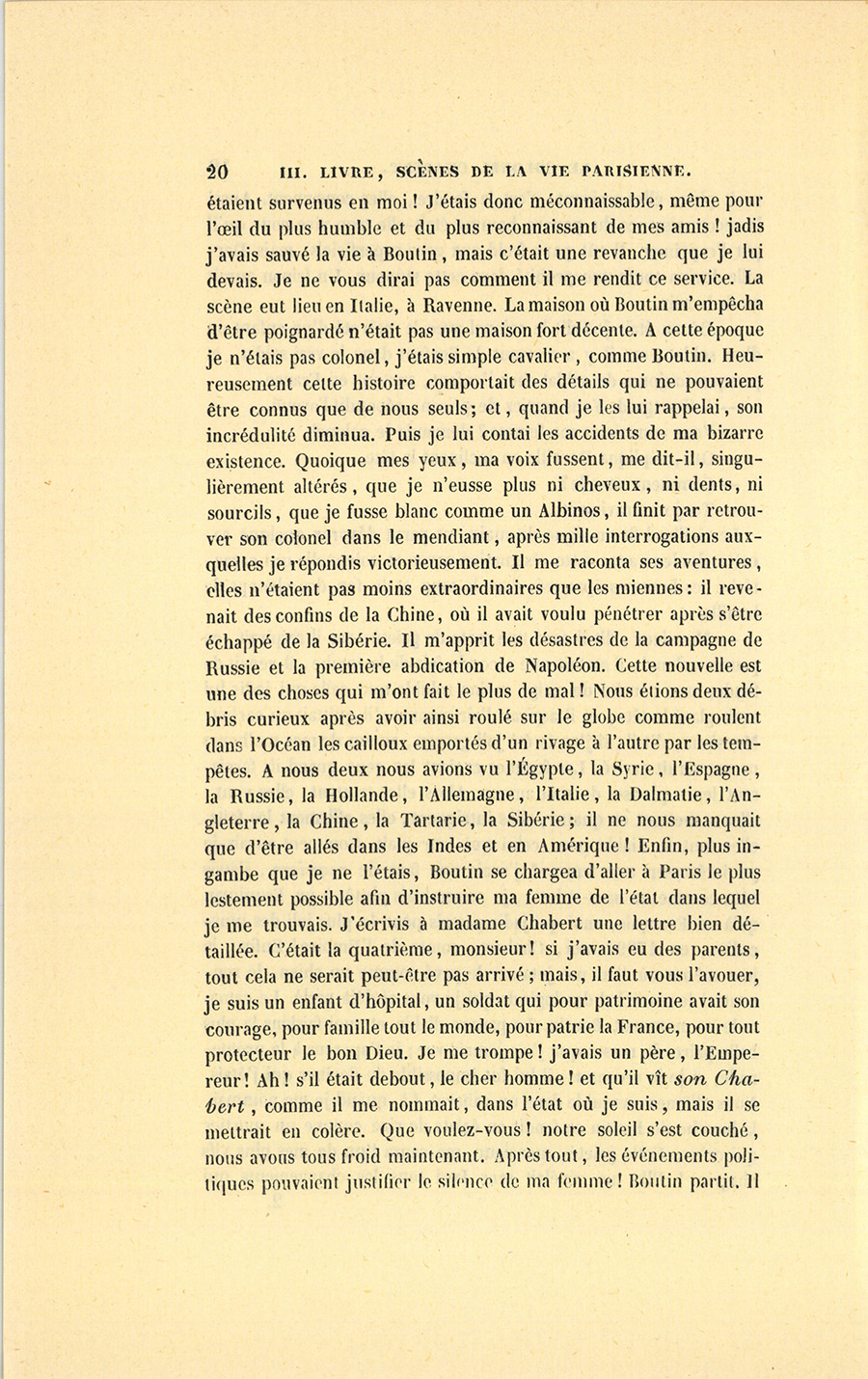 Chabert disparut en effet. Le nourrisseur fit faillite et devint cocher de cabriolet. Peut-être le colonel s’adonna-t-il d’abord à quelque industrie du même genre. Peut-être, semblable à une pierre lancée dans un gouffre, alla-t-il, de cascade en cascade, s’abîmer dans cette boue de haillons qui foisonne à travers les rues de Paris.