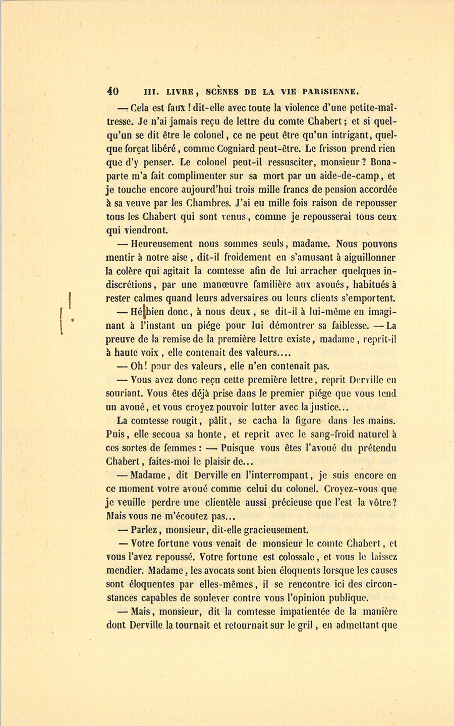 Sur un mot dit par Derville au brigadier, il lui fut permis d’emmener son client dans le Greffe, où Hyacinthe écrivit quelques lignes adressées à la comtesse Ferraud.