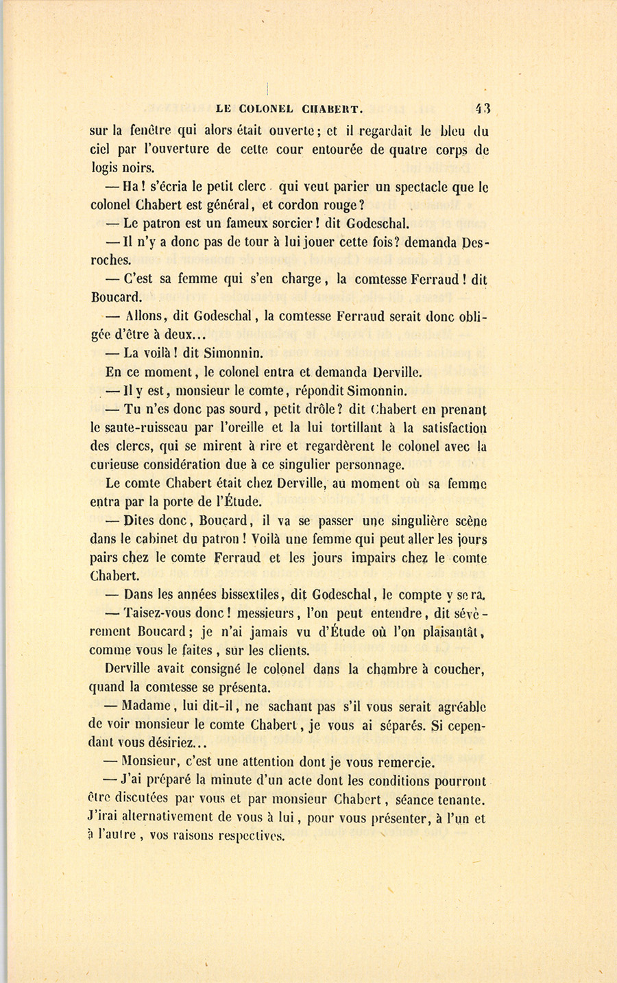 – D’ailleurs, il n’est pas prouvé que ce vieux singe ne se soit pas moqué de nous, dit-il en cessant son argumentation étouffée par le rire des autres clercs. En conscience, le colonel Chabert est bien mort, sa femme est remariée au comte Ferraud, Conseiller d’État. Madame Ferraud est une des clientes de l’Étude !