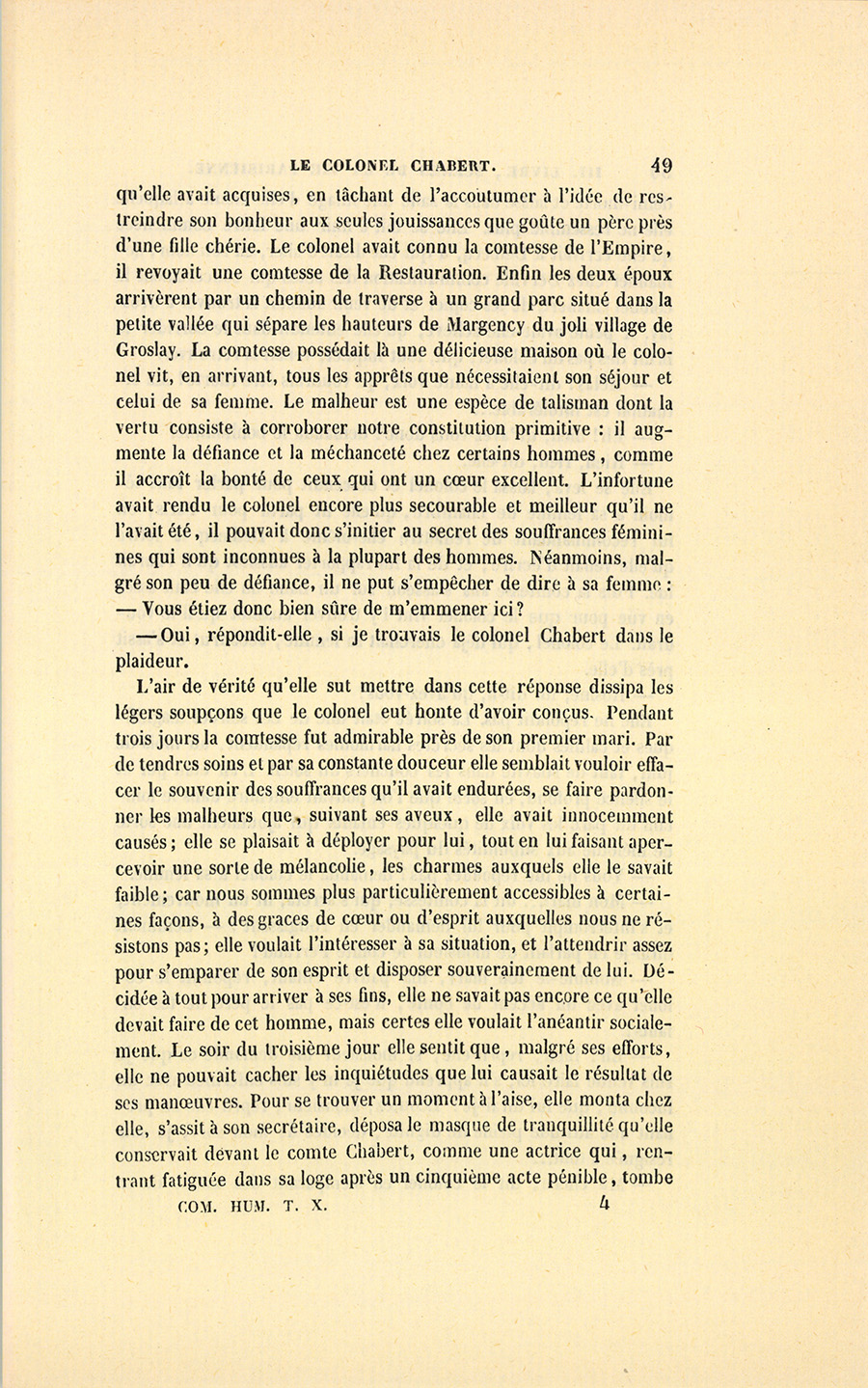 La conversation prit un autre cours, car il était impossible de la continuer long-temps sur ce sujet. Quoique les deux époux revinssent souvent à leur situation bizarre, soit par des allusions, soit sérieusement, ils firent un charmant voyage, se rappelant les événements de leur union passée et les choses de l’Empire. La comtesse sut imprimer un charme doux à ces souvenirs, et répandit dans la conversation une teinte de mélancolie nécessaire pour y maintenir la gravité. Elle faisait revivre l’amour sans exciter aucun désir, et laissait entrevoir à son premier époux toutes les richesses morales {p. 49} qu’elle avait acquises, en tâchant de l’accoutumer à l’idée de restreindre son bonheur aux seules jouissances que goûte un père près d’une fille chérie. Le colonel avait connu la comtesse de l’Empire, il revoyait une comtesse de la Restauration. Enfin les deux époux arrivèrent par un chemin de traverse à un grand parc situé dans la petite vallée qui sépare les hauteurs de Margency du joli village de Groslay. La comtesse possédait là une délicieuse maison où le colonel vit, en arrivant, tous les apprêts que nécessitaient son séjour et celui de sa femme. Le malheur est une espèce de talisman dont la vertu consiste à corroborer notre constitution primitive : il augmente la défiance et la méchanceté chez certains hommes, comme il accroît la bonté de ceux qui ont un cœur excellent. L’infortune avait rendu le colonel encore plus secourable et meilleur qu’il ne l’avait été, il pouvait donc s’initier au secret des souffrances féminines qui sont inconnues à la plupart des hommes. Néanmoins, malgré son peu de défiance, il ne put s’empêcher de dire à sa femme : – Vous étiez donc bien sûre de m’emmener ici ?