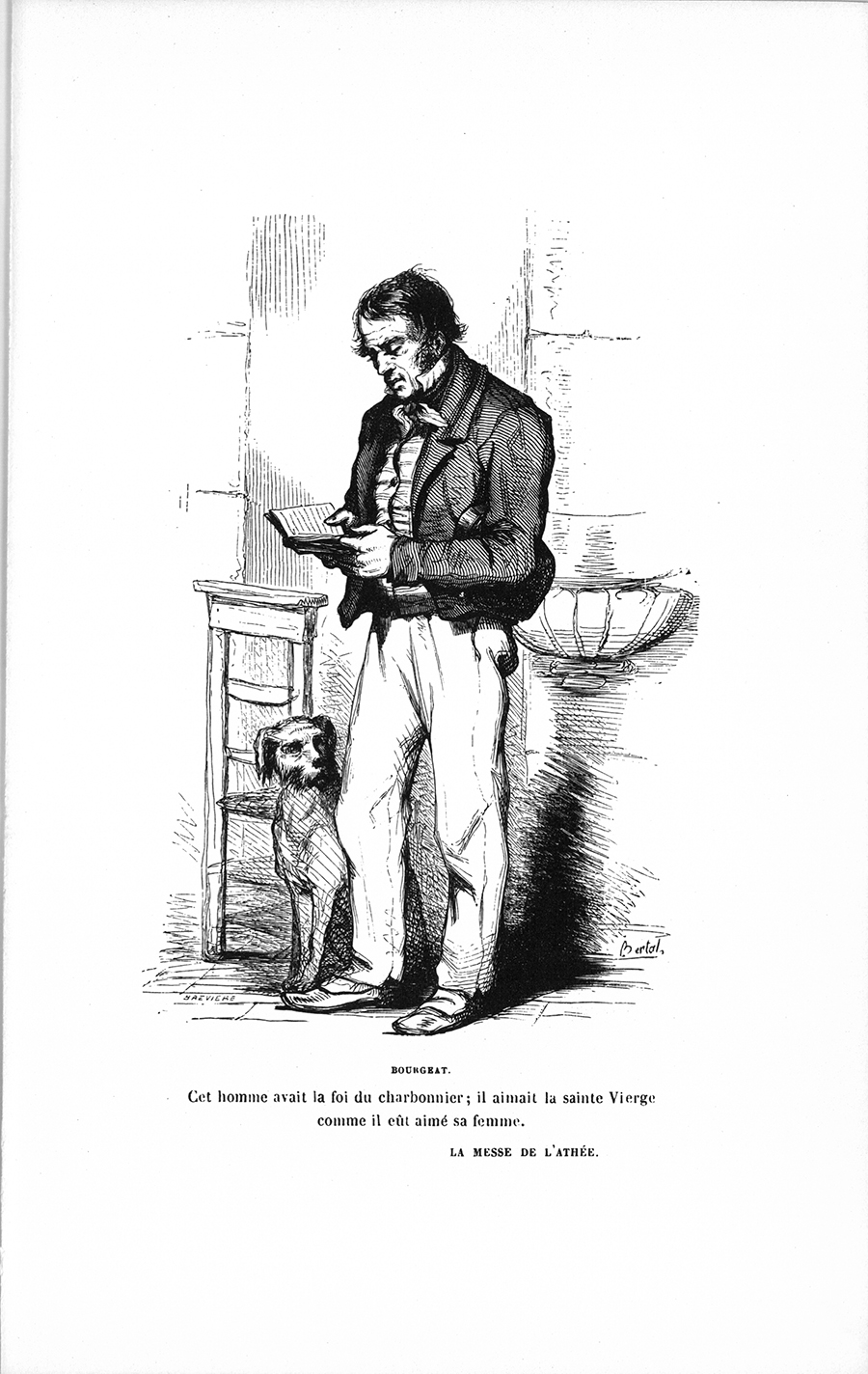 – Bourgeat, reprit après une pause Desplein visiblement ému, mon second père est mort dans mes bras, me laissant tout ce qu’il possédait par un testament qu’il avait fait chez un écrivain public, et daté de l’année où nous étions venus nous loger dans la cour de Rohan. Cet homme avait la foi du charbonnier. Il aimait la sainte Vierge comme il eût aimé sa femme. [ill.] Catholique ardent, il ne m’avait jamais dit un mot sur mon irréligion. Quand il fut en danger, il me pria de ne rien ménager pour qu’il eût les secours de l’Église. Je fis dire tous les jours la messe pour lui. Souvent, pendant la nuit, il me témoignait des craintes sur son avenir, il craignait de ne pas avoir vécu assez saintement. Le pauvre homme ! il travaillait du matin au soir. À qui donc appartiendrait le paradis, s’il y a un paradis ? Il a été administré comme un saint qu’il était, et sa mort fut digne de sa vie. Son convoi ne fut suivi que par moi. Quand j’eus mis en terre mon unique bienfaiteur, je cherchai comment m’acquitter envers lui ; je m’aperçus qu’il n’avait ni famille, ni amis, ni femme, ni enfants. Mais il croyait ! il avait une conviction religieuse, avais-je le droit de la discuter ? Il m’avait timidement parlé des messes dites pour le repos des morts, il ne voulait pas m’imposer ce devoir, en pensant que ce serait faire payer ses services. Aussitôt que j’ai pu établir une fondation, j’ai donné à Saint-Sulpice la {p. 89} somme nécessaire pour y faire dire quatre messes par an. Comme la seule chose que je puisse offrir à Bourgeat est la satisfaction de ses pieux désirs, le jour où se dit cette messe, au commencement de chaque saison, j’y vais en son nom, et récite pour lui les prières voulues. Je dis avec la bonne foi du douteur : « Mon Dieu, s’il est une sphère où tu mettes après leur mort ceux qui ont été parfaits, pense au bon Bourgeat ; et s’il y a quelque chose à souffrir pour lui, donne-moi ses souffrances, afin de le faire entrer plus vite dans ce que l’on appelle le paradis. » Voilà, mon cher, tout ce qu’un homme qui a mes opinions peut se permettre. Dieu doit être un bon diable, il ne saurait m’en vouloir. Je vous le jure, je donnerais ma fortune pour que la croyance de Bourgeat pût m’entrer dans la cervelle.