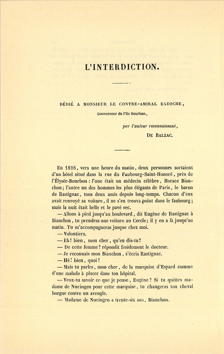 En 1828, vers une heure du matin, deux personnes sortaient d’un hôtel situé dans la rue du Faubourg-Saint-Honoré, près de l’Élysée-Bourbon : l’une était un médecin célèbre, Horace Bianchon ; l’autre un des hommes les plus élégants de Paris, le baron de Rastignac, tous deux amis depuis long-temps. Chacun d’eux avait renvoyé sa voiture, il ne s’en trouva point dans le faubourg ; mais la nuit était belle et le pavé sec.