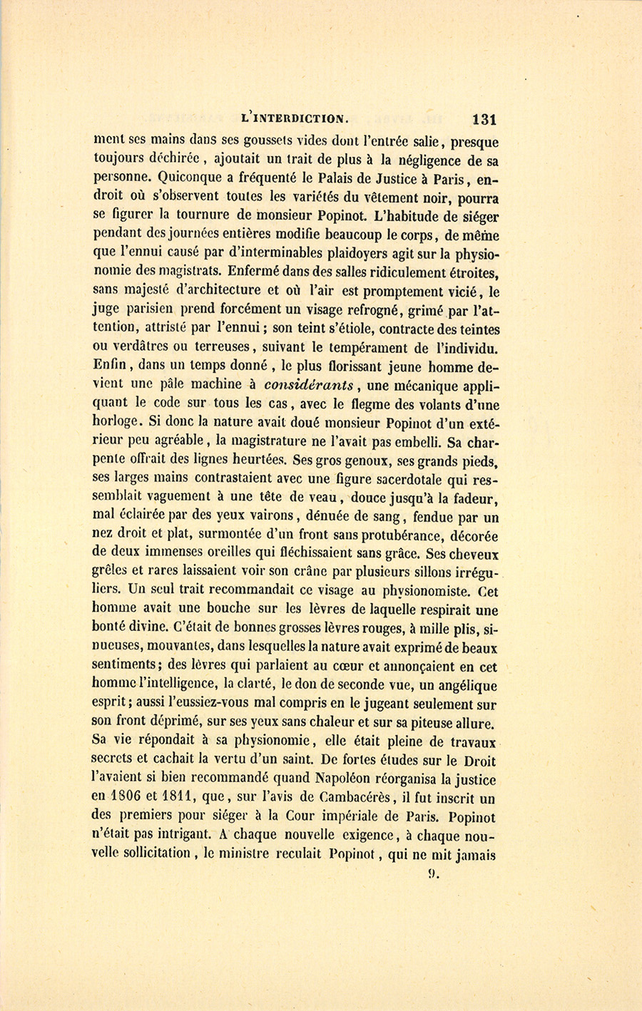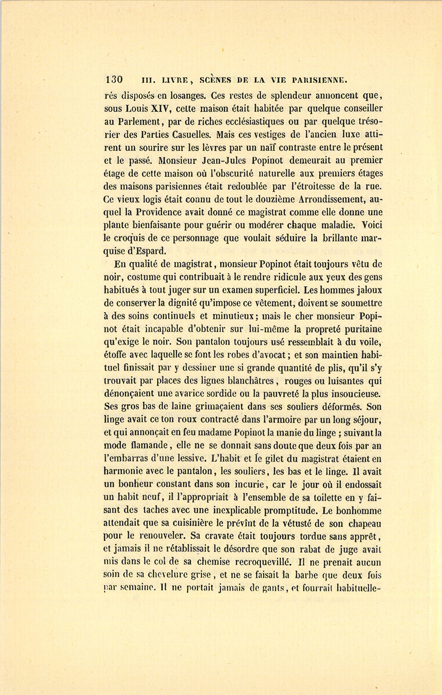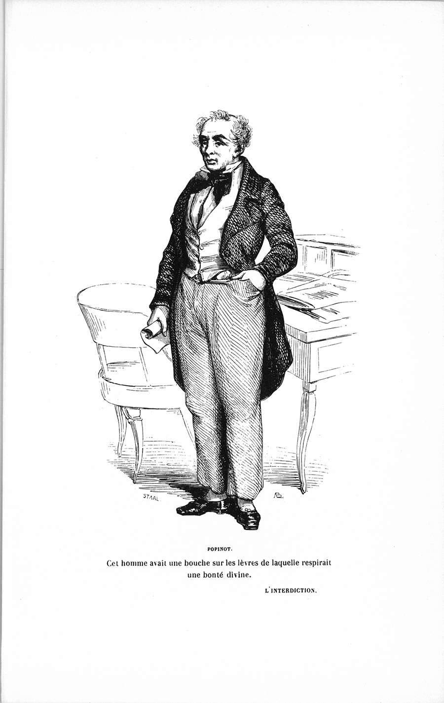 En qualité de magistrat, monsieur Popinot était toujours vêtu de noir, costume qui contribuait à le rendre ridicule aux yeux des gens habitués à tout juger sur un examen superficiel. Les hommes jaloux de conserver la dignité qu’impose ce vêtement, doivent se soumettre à des soins continuels et minutieux ; mais le cher monsieur Popinot était incapable d’obtenir sur lui-même la propreté puritaine qu’exige le noir. Son pantalon toujours usé ressemblait à du voile, étoffe avec laquelle se font les robes d’avocat ; et son maintien habituel finissait par y dessiner une si grande quantité de plis, qu’il s’y trouvait par places des lignes blanchâtres, rouges ou luisantes qui dénonçaient une avarice sordide ou la pauvreté la plus insoucieuse. Ses gros bas de laine grimaçaient dans ses souliers déformés. Son linge avait ce ton roux contracté dans l’armoire par un long séjour, et qui annonçait en feu madame Popinot la manie du linge ; suivant la mode flamande, elle ne se donnait sans doute que deux fois par an l’embarras d’une lessive. L’habit et le gilet du magistrat étaient en harmonie avec le pantalon, les souliers, les bas et le linge. Il avait un bonheur constant dans son incurie, car le jour où il endossait un habit neuf, il l’appropriait à l’ensemble de sa toilette en y faisant des taches avec une inexplicable promptitude. Le bonhomme attendait que sa cuisinière le prévînt de la vétusté de son chapeau pour le renouveler. Sa cravate était toujours tordue sans apprêt, et jamais il ne rétablissait le désordre que son rabat de juge avait mis dans le col de sa chemise recroquevillé. Il ne prenait aucun soin de sa chevelure grise, et ne se faisait la barbe que deux fois par semaine. Il ne portait jamais de gants, et fourrait {p. 131} habituellement ses mains dans ses goussets vides dont l’entrée salie, presque toujours déchirée, ajoutait un trait de plus à la négligence de sa personne. Quiconque a fréquenté le Palais de Justice à Paris, endroit où s’observent toutes les variétés du vêtement noir, pourra se figurer la tournure de monsieur Popinot. L’habitude de siéger pendant des journées entières modifie beaucoup le corps, de même que l’ennui causé par d’interminables plaidoyers agit sur la physionomie des magistrats. Enfermé dans des salles ridiculement étroites, sans majesté d’architecture et où l’air est promptement vicié, le juge parisien prend forcément un visage refrogné, grimé par l’attention, attristé par l’ennui ; son teint s’étiole, contracte des teintes ou verdâtres ou terreuses, suivant le tempérament de l’individu. Enfin, dans un temps donné, le plus florissant jeune homme devient une pâle machine à considérants, une mécanique appliquant le code sur tous les cas, avec le flegme des volants d’une horloge. Si donc la nature avait doué monsieur Popinot d’un extérieur peu agréable, la magistrature ne l’avait pas embelli. Sa charpente offrait des lignes heurtées. Ses gros genoux, ses grands pieds, ses larges mains contrastaient avec une figure sacerdotale qui ressemblait vaguement à une tête de veau, douce jusqu’à la fadeur, mal éclairée par des yeux vairons, dénuée de sang, fendue par un nez droit et plat, surmontée d’un front sans protubérance, décorée de deux immenses oreilles qui fléchissaient sans grâce. Ses cheveux grêles et rares laissaient voir son crâne par plusieurs sillons irréguliers. Un seul trait recommandait ce visage au physionomiste. Cet homme avait une bouche sur les lèvres de laquelle respirait une bonté divine. [ill.] C’était de bonnes grosses lèvres rouges, à mille plis, sinueuses, mouvantes, dans lesquelles la nature avait exprimé de beaux sentiments ; des lèvres qui parlaient au cœur et annonçaient en cet homme l’intelligence, la clarté, le don de seconde vue, un angélique esprit ; aussi l’eussiez-vous mal compris en le jugeant seulement sur son front déprimé, sur ses yeux sans chaleur et sur sa piteuse allure. Sa vie répondait à sa physionomie, elle était pleine de travaux secrets et cachait la vertu d’un saint. De fortes études sur le Droit l’avaient si bien recommandé quand Napoléon réorganisa la justice en 1806 et 1811, que, sur l’avis de Cambacérès, il fut inscrit un des premiers pour siéger à la Cour impériale de Paris. Popinot n’était pas intrigant. À chaque nouvelle exigence, à chaque nouvelle sollicitation, le ministre reculait Popinot, qui ne mit jamais {p. 132} les pieds ni chez l’Archichancelier ni chez le Grand-Juge. De la Cour, il fut exporté sur les listes du Tribunal, puis repoussé jusqu’au dernier échelon par les intrigues des gens actifs et remuants. Il fut nommé Juge-suppléant. Un cri général s’éleva dans le Palais : – Popinot Juge-suppléant ! Cette injustice frappa le monde judiciaire, les avocats, les huissiers, tout le monde, excepté Popinot, qui ne se plaignit point. La première clameur passée, chacun trouva que tout était pour le mieux dans le meilleur des mondes possibles, qui certes doit être le monde judiciaire. Popinot fut Juge-suppléant jusqu’au jour où le plus célèbre Garde des Sceaux de la Restauration vengea les passe-droits faits à cet homme modeste et silencieux par les Grands-Juges de l’Empire. Après avoir été Juge-suppléant pendant douze années, monsieur Popinot devait sans doute mourir simple Juge au Tribunal de la Seine.