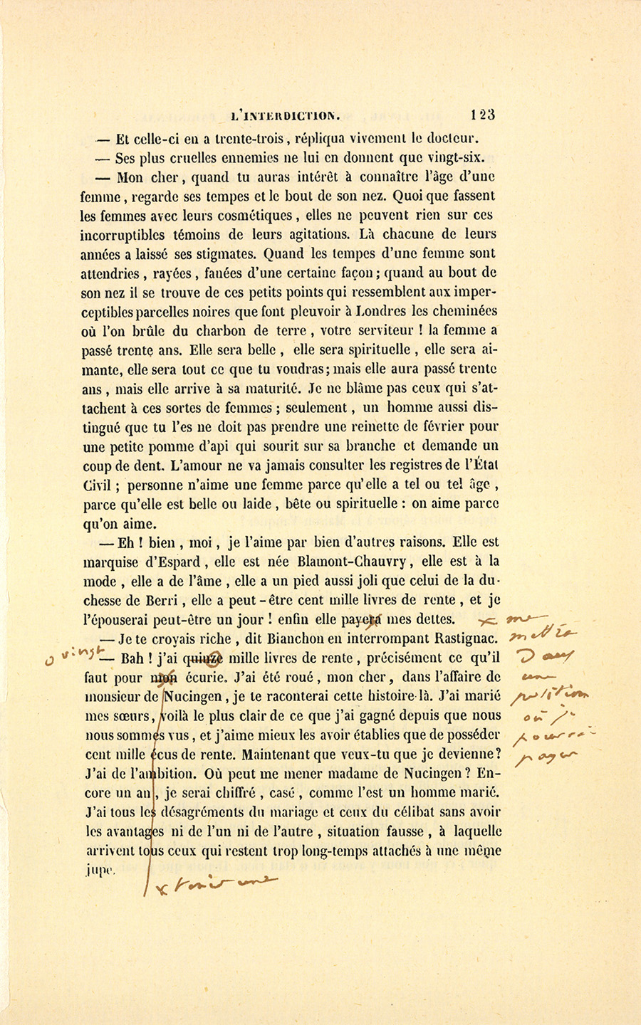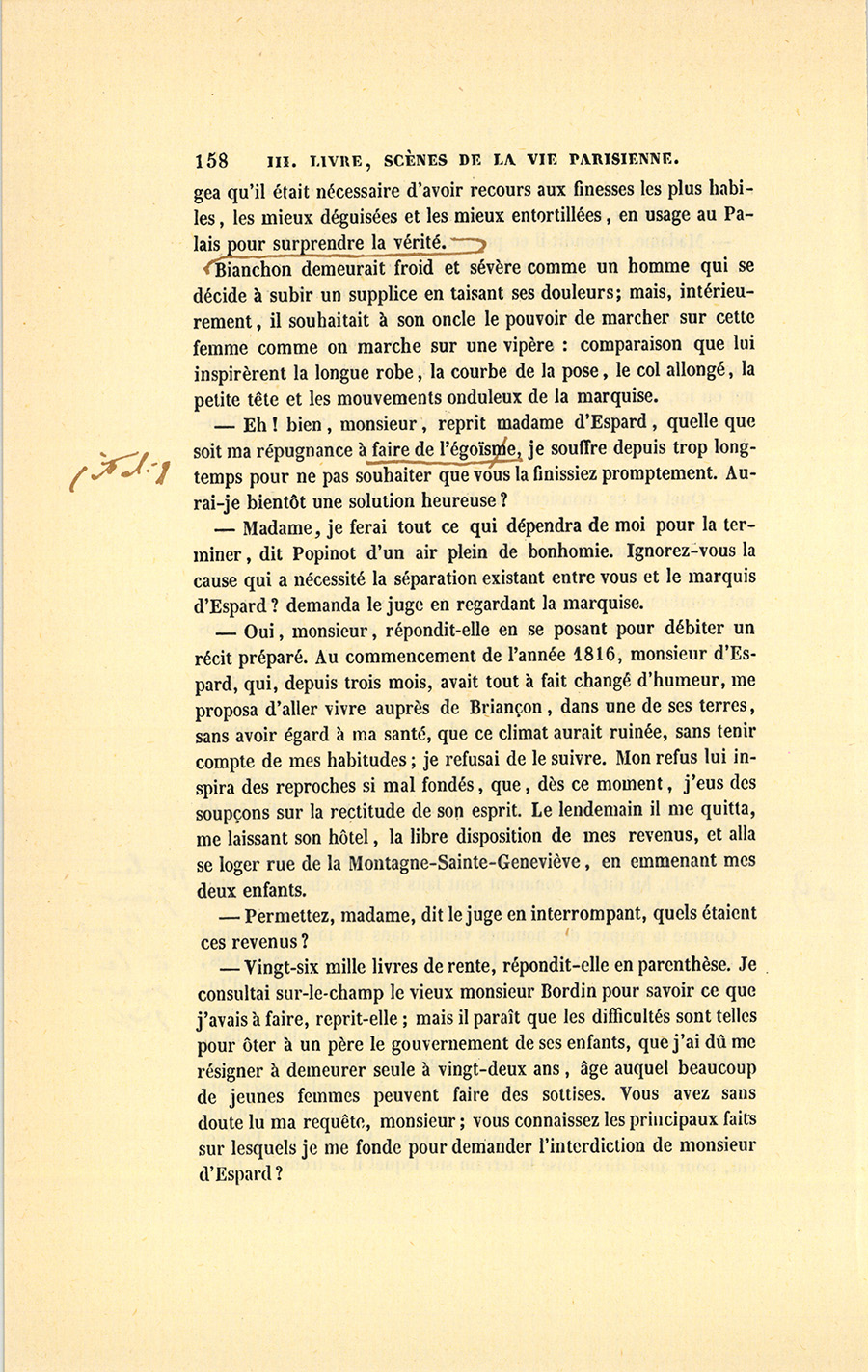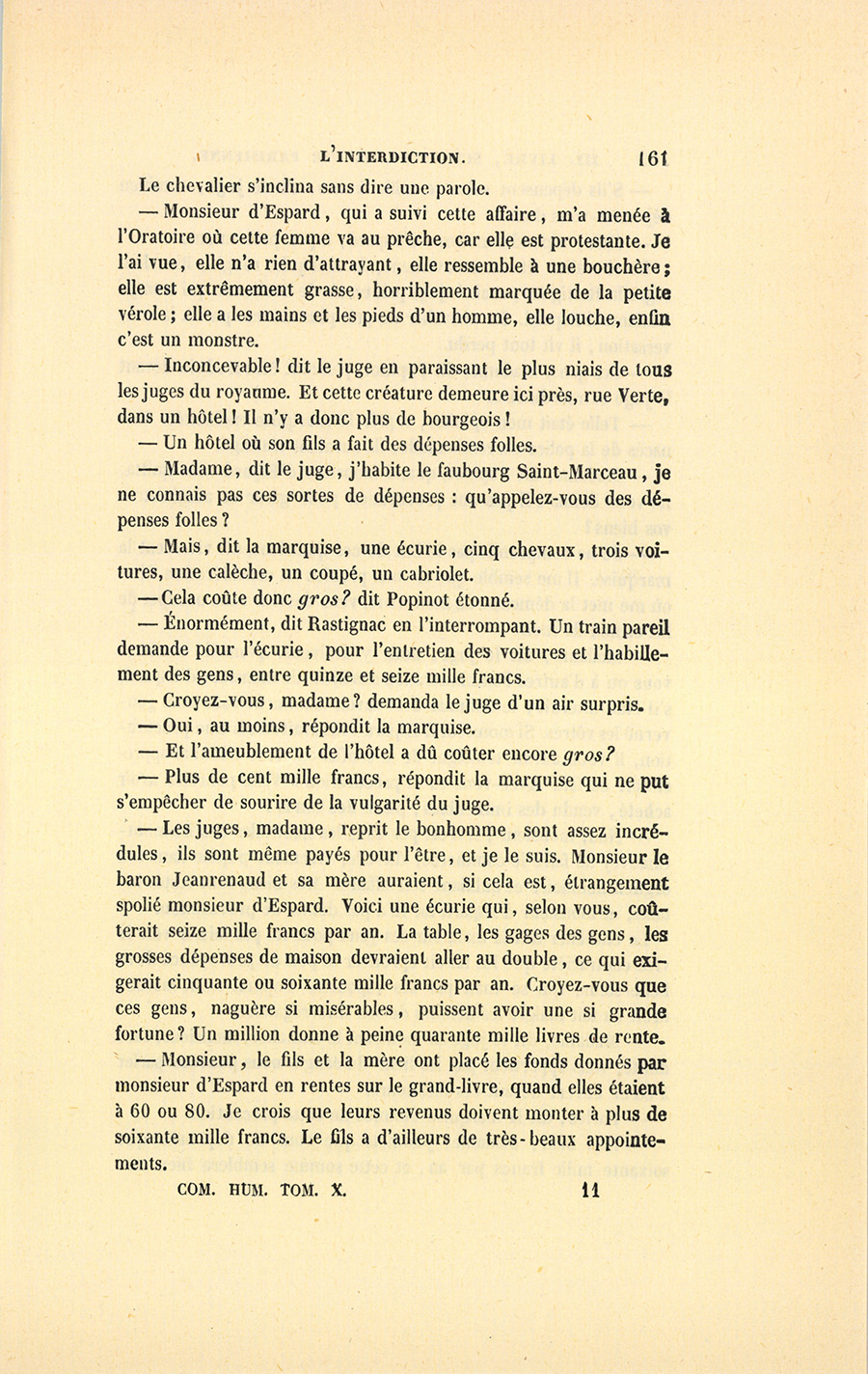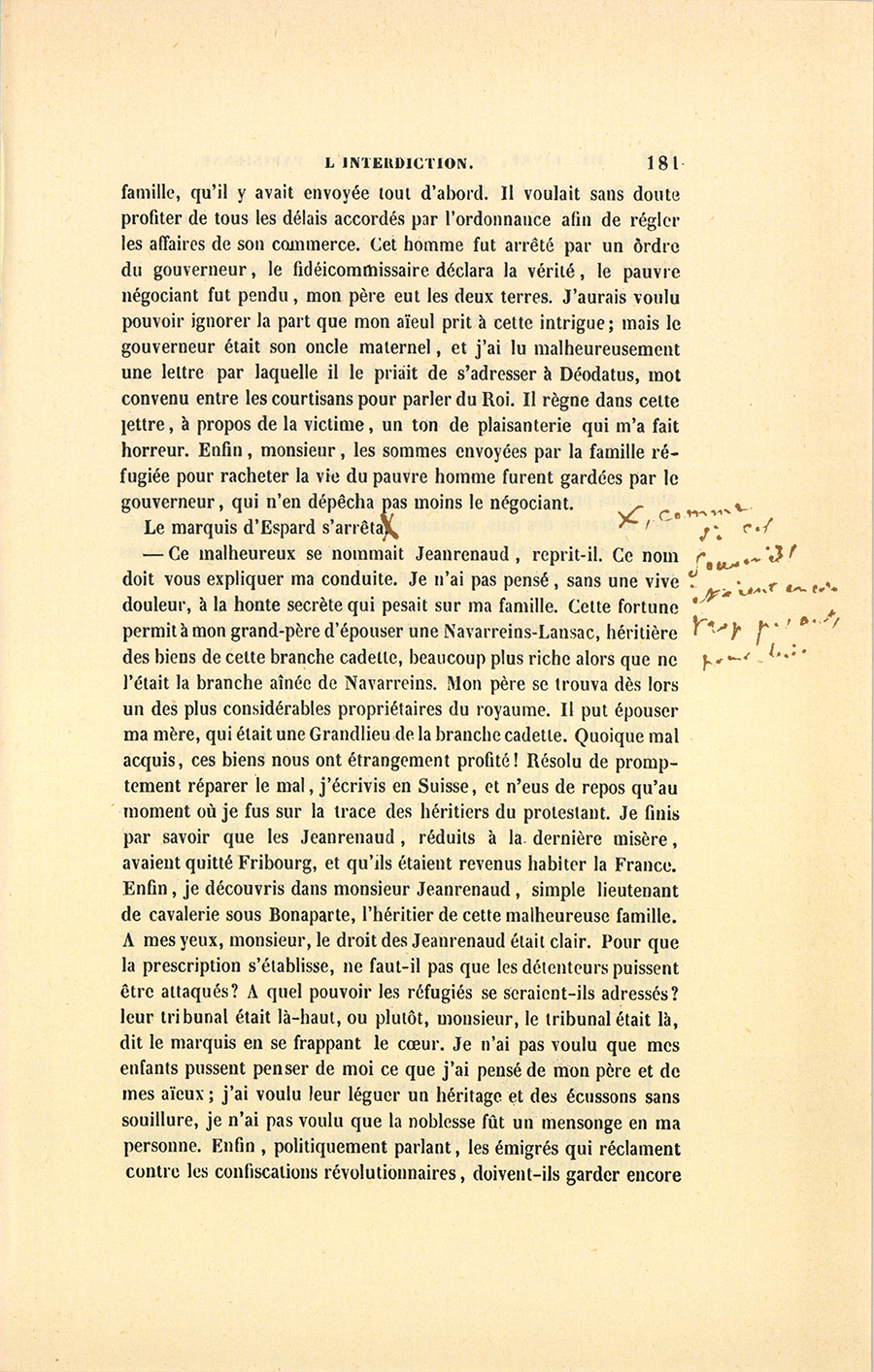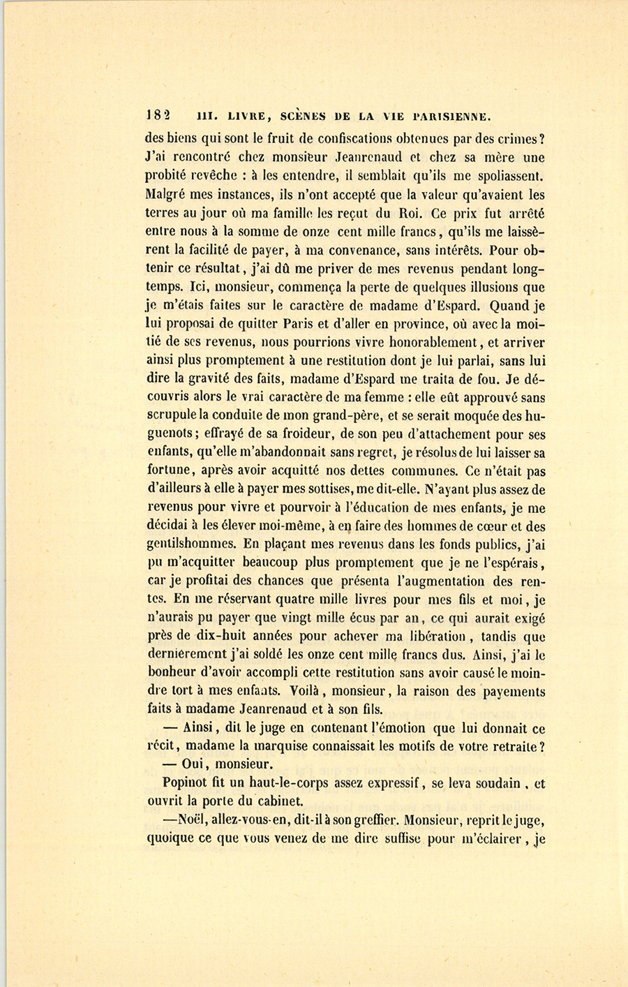– Ce malheureux se nommait Jeanrenaud, reprit-il. Ce nom doit vous expliquer ma conduite. Je n’ai pas pensé, sans une vive douleur, à la honte secrète qui pesait sur ma famille. Cette fortune permit à mon grand-père d’épouser une Navarreins-Lansac, héritière des biens de cette branche cadette, beaucoup plus riche alors que ne l’était la branche aînée de Navarreins. Mon père se trouva dès lors un des plus considérables propriétaires du royaume. Il put épouser ma mère, qui était une Grandlieu de la branche cadette. Quoique mal acquis, ces biens nous ont étrangement profité ! Résolu de promptement réparer le mal, j’écrivis en Suisse, et n’eus de repos qu’au moment où je fus sur la trace des héritiers du protestant. Je finis par savoir que les Jeanrenaud, réduits à la dernière misère, avaient quitté Fribourg, et qu’ils étaient revenus habiter la France. Enfin, je découvris dans monsieur Jeanrenaud, simple lieutenant de cavalerie sous Bonaparte, l’héritier de cette malheureuse famille. À mes yeux, monsieur, le droit des Jeanrenaud était clair. Pour que la prescription s’établisse, ne faut-il pas que les détenteurs puissent être attaqués ? À quel pouvoir les réfugiés se seraient-ils adressés ? leur tribunal était là-haut, ou plutôt, monsieur, le tribunal était là, dit le marquis en se frappant le cœur. Je n’ai pas voulu que mes enfants pussent penser de moi ce que j’ai pensé de mon père et de mes aïeux ; j’ai voulu leur léguer un héritage et des écussons sans souillure, je n’ai pas voulu que la noblesse fût un mensonge en ma personne. Enfin, politiquement parlant, les émigrés qui réclament contre les confiscations révolutionnaires, doivent-ils garder encore {p. 182} des biens qui sont le fruit de confiscations obtenues par des crimes ? J’ai rencontré chez monsieur Jeanrenaud et chez sa mère une probité revêche : à les entendre, il semblait qu’ils me spoliassent. Malgré mes instances, ils n’ont accepté que la valeur qu’avaient les terres au jour où ma famille les reçut du Roi. Ce prix fut arrêté entre nous à la somme de onze cent mille francs, qu’ils me laissèrent la facilité de payer, à ma convenance, sans intérêts. Pour obtenir ce résultat, j’ai dû me priver de mes revenus pendant long-temps. Ici, monsieur, commença la perte de quelques illusions que je m’étais faites sur le caractère de madame d’Espard. Quand je lui proposai de quitter Paris et d’aller en province, où avec la moitié de ses revenus, nous pourrions vivre honorablement, et arriver ainsi plus promptement à une restitution dont je lui parlai, sans lui dire la gravité des faits, madame d’Espard me traita de fou. Je découvris alors le vrai caractère de ma femme : elle eût approuvé sans scrupule la conduite de mon grand-père, et se serait moquée des huguenots ; effrayé de sa froideur, de son peu d’attachement pour ses enfants, qu’elle m’abandonnait sans regret, je résolus de lui laisser sa fortune, après avoir acquitté nos dettes communes. Ce n’était pas d’ailleurs à elle à payer mes sottises, me dit-elle. N’ayant plus assez de revenus pour vivre et pourvoir à l’éducation de mes enfants, je me décidai à les élever moi-même, à en faire des hommes de cœur et des gentilshommes. En plaçant mes revenus dans les fonds publics, j’ai pu m’acquitter beaucoup plus promptement que je ne l’espérais, car je profitai des chances que présenta l’augmentation des rentes. En me réservant quatre mille livres pour mes fils et moi, je n’aurais pu payer que vingt mille écus par an, ce qui aurait exigé près de dix-huit années pour achever ma libération, tandis que dernièrement j’ai soldé les onze cent mille francs dus. Ainsi, j’ai le bonheur d’avoir accompli cette restitution sans avoir causé le moindre tort à mes enfants. Voilà, monsieur, la raison des payements faits à madame Jeanrenaud et à son fils.