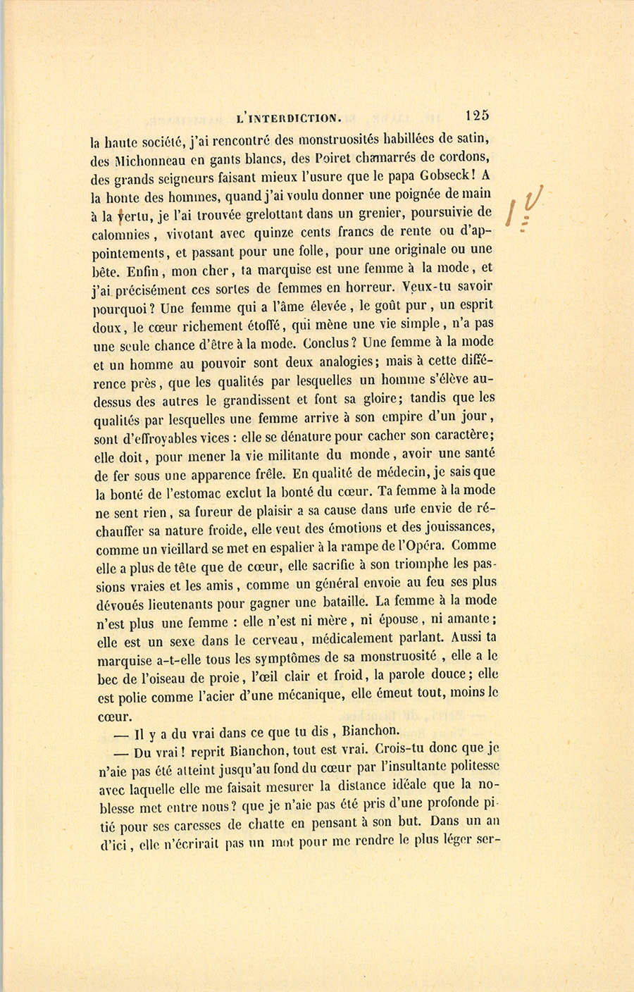 – Oui, depuis ce temps-là, mon cher, j’en ai vu, des marionnettes, des poupées et des pantins ! Je connais un peu les mœurs de ces belles dames de qui vous soignez le corps et ce qu’elles ont de plus précieux, leur enfant, quand elles l’aiment, ou leur visage qu’elles adorent toujours. Vous passez les nuits à leur chevet, vous vous exterminez pour leur sauver la plus légère altération de beauté, n’importe où ; vous avez réussi, vous leur gardez le secret comme si vous étiez mort, elles vous envoient demander votre mémoire et le trouvent horriblement cher. Qui les a sauvées ? la nature ! Loin de vous prôner, elles médisent de vous, en craignant de vous donner pour médecin à leurs bonnes amies. Mon cher, ces femmes de qui vous dites : – « C’est des anges ! » moi, je les ai vues déshabillées des petites mines sous lesquelles elles couvrent leur âme, aussi bien que des chiffons sous lesquels elles déguisent leurs imperfections, sans manières et sans corset : elles ne sont pas belles. Nous avons commencé par voir bien des graviers, bien des saletés sous le flot du monde, quand nous étions échoués sur le roc de la Maison-Vauquer ; ce que nous y avons vu n’était rien. Depuis que je vais dans {p. 125} la haute société, j’ai rencontré des monstruosités habillées de satin, des Michonneau en gants blancs, des Poiret chamarrés de cordons, des grands seigneurs faisant mieux l’usure que le papa Gobseck ! À la honte des hommes, quand j’ai voulu donner une poignée de main à la Vertu, je l’ai trouvée grelottant dans un grenier, poursuivie de calomnies, vivotant avec quinze cents francs de rente ou d’appointements, et passant pour une folle, pour une originale ou une bête. Enfin, mon cher, ta marquise est une femme à la mode, et j’ai précisément ces sortes de femmes en horreur. Veux-tu savoir pourquoi ? Une femme qui a l’âme élevée, le goût pur, un esprit doux, le cœur richement étoffé, qui mène une vie simple, n’a pas une seule chance d’être à la mode. Conclus ? Une femme à la mode et un homme au pouvoir sont deux analogies ; mais à cette différence près, que les qualités par lesquelles un homme s’élève au-dessus des autres le grandissent et font sa gloire ; tandis que les qualités par lesquelles une femme arrive à son empire d’un jour sont d’effroyables vices : elle se dénature pour cacher son caractère ; elle doit, pour mener la vie militante du monde, avoir une santé de fer sous une apparence frêle. En qualité de médecin, je sais que la bonté de l’estomac exclut la bonté du cœur. Ta femme à la mode ne sent rien, sa fureur de plaisir a sa cause dans une envie de réchauffer sa nature froide, elle veut des émotions et des jouissances, comme un vieillard se met en espalier à la rampe de l’Opéra. Comme elle a plus de tête que de cœur, elle sacrifie à son triomphe les passions vraies et les amis, comme un général envoie au feu ses plus dévoués lieutenants pour gagner une bataille. La femme à la mode n’est plus une femme : elle n’est ni mère, ni épouse, ni amante ; elle est un sexe dans le cerveau, médicalement parlant. Aussi ta marquise a-t-elle tous les symptômes de sa monstruosité, elle a le bec de l’oiseau de proie, l’œil clair et froid, la parole douce ; elle est polie comme l’acier d’une mécanique, elle émeut tout, moins le cœur.