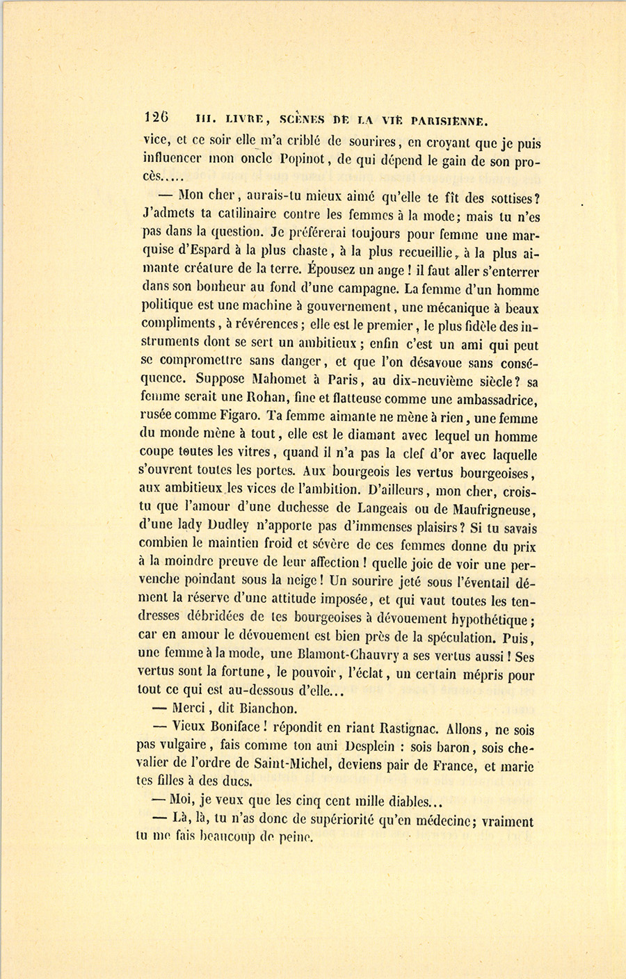– Du vrai ! reprit Bianchon, tout est vrai. Crois-tu donc que je n’aie pas été atteint jusqu’au fond du cœur par l’insultante politesse avec laquelle elle me faisait mesurer la distance idéale que la noblesse met entre nous ? que je n’aie pas été pris d’une profonde pitié pour ses caresses de chatte en pensant à son but. Dans un an d’ici, elle n’écrirait pas un mot pour me rendre le plus léger {p. 126} service, et ce soir elle m’a criblé de sourires, en croyant que je puis influencer mon oncle Popinot, de qui dépend le gain de son procès…