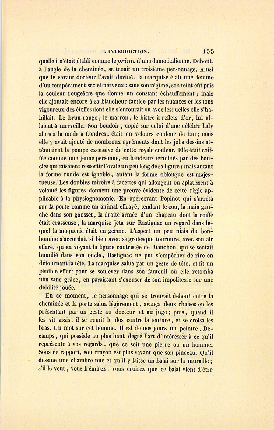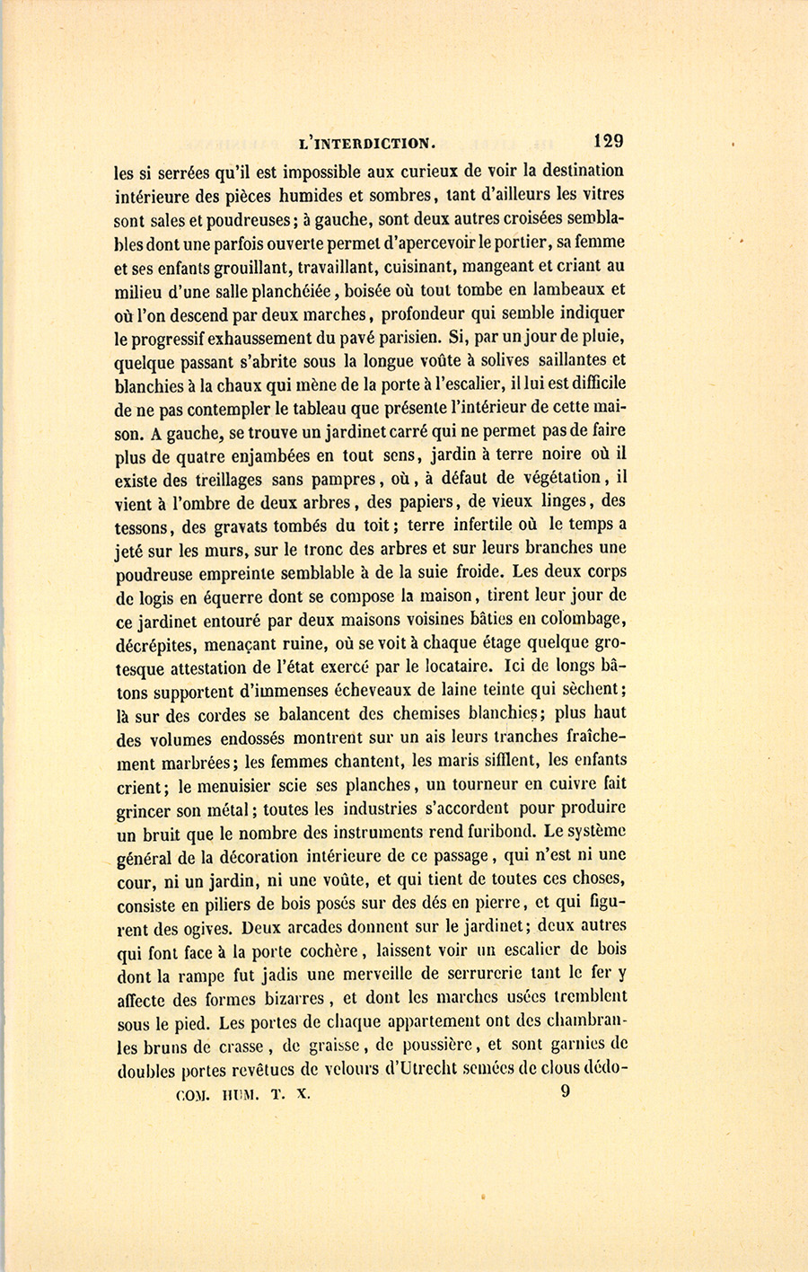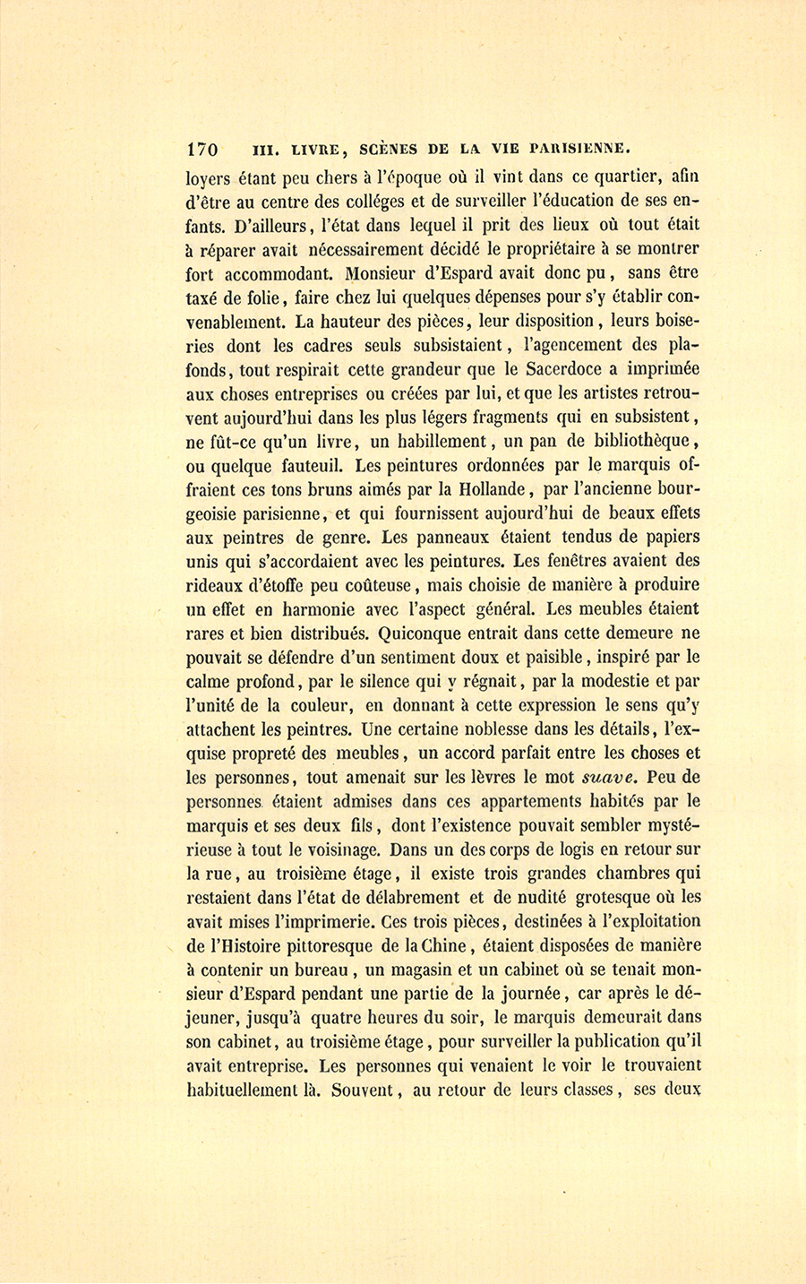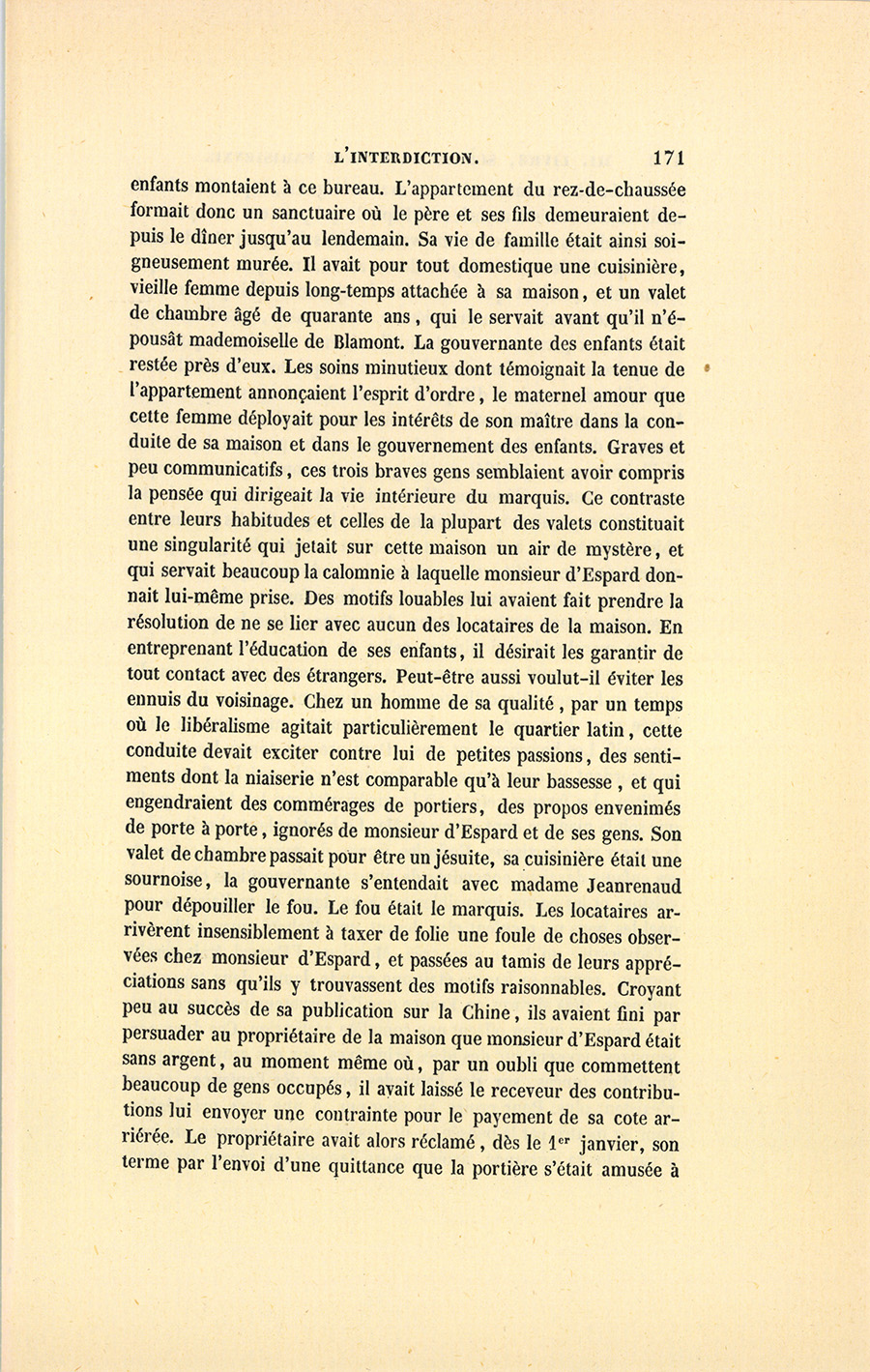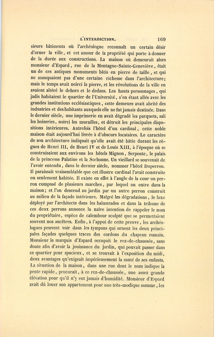Il se rencontre çà et là dans les vieux quartiers de Paris {p. 169} plusieurs bâtiments où l’archéologue reconnaît un certain désir d’orner la ville, et cet amour de la propriété qui porte à donner de la durée aux constructions. La maison où demeurait alors monsieur d’Espard, rue de la Montagne-Sainte-Geneviève, était un de ces antiques monuments bâtis en pierre de taille, et qui ne manquaient pas d’une certaine richesse dans l’architecture ; mais le temps avait noirci la pierre, et les révolutions de la ville en avaient altéré le dehors et le dedans. Les hauts personnages, qui jadis habitaient le quartier de l’Université, s’en étant allés avec les grandes institutions ecclésiastiques, cette demeure avait abrité des industries et des habitants auxquels elle ne fut jamais destinée. Dans le dernier siècle, une imprimerie en avait dégradé les parquets, sali les boiseries, noirci les murailles, et détruit les principales dispositions intérieures. Autrefois l’hôtel d’un cardinal, cette noble maison était aujourd’hui livrée à d’obscurs locataires. Le caractère de son architecture indiquait qu’elle avait été bâtie durant les règnes de Henri III, de Henri IV et de Louis XIII, à l’époque où se construisaient aux environs les hôtels Mignon, Serpente, le palais de la princesse Palatine et la Sorbonne. Un vieillard se souvenait de l’avoir entendu, dans le dernier siècle, nommer l’hôtel Duperron. Il paraissait vraisemblable que cet illustre cardinal l’avait construite ou seulement habitée. Il existe en effet à l’angle de la cour un perron composé de plusieurs marches, par lequel on entre dans la maison ; et l’on descend au jardin par un autre perron construit au milieu de la façade intérieure. Malgré les dégradations, le luxe déployé par l’architecte dans les balustrades et dans la tribune de ces deux perrons annonce la naïve intention de rappeler le nom du propriétaire, espèce de calembour sculpté que se permettaient souvent nos ancêtres. Enfin, à l’appui de cette preuve, les archéologues peuvent voir dans les tympans qui ornent les deux principales façades quelques traces des cordons du chapeau romain. Monsieur le marquis d’Espard occupait le rez-de-chaussée, sans doute afin d’avoir la jouissance du jardin, qui pouvait passer dans ce quartier pour spacieux, et se trouvait à l’exposition du midi, deux avantages qu’exigeait impérieusement la santé de ses enfants. La situation de la maison, dans une rue dont le nom indique la pente rapide, procurait, à ce rez-de-chaussée, une assez grande élévation pour qu’il n’y eut jamais d’humidité. Monsieur d’Espard avait dû louer son appartement pour une très-modique somme, les {p. 170} loyers étant peu chers à l’époque où il vint dans ce quartier, afin d’être au centre des colléges et de surveiller l’éducation de ses enfants. D’ailleurs, l’état dans lequel il prit des lieux où tout était à réparer avait nécessairement décidé le propriétaire à se montrer fort accommodant. Monsieur d’Espard avait donc pu, sans être taxé de folie, faire chez lui quelques dépenses pour s’y établir convenablement. La hauteur des pièces, leur disposition, leurs boiseries dont les cadres seuls subsistaient, l’agencement des plafonds, tout respirait cette grandeur que le Sacerdoce a imprimée aux choses entreprises ou créées par lui, et que les artistes retrouvent aujourd’hui dans les plus légers fragments qui en subsistent, ne fût-ce qu’un livre, un habillement, un pan de bibliothèque, ou quelque fauteuil. Les peintures ordonnées par le marquis offraient ces tons bruns aimés par la Hollande, par l’ancienne bourgeoisie parisienne, et qui fournissent aujourd’hui de beaux effets aux peintres de genre. Les panneaux étaient tendus de papiers unis qui s’accordaient avec les peintures. Les fenêtres avaient des rideaux d’étoffe peu coûteuse, mais choisie de manière à produire un effet en harmonie avec l’aspect général. Les meubles étaient rares et bien distribués. Quiconque entrait dans cette demeure ne pouvait se défendre d’un sentiment doux et paisible, inspiré par le calme profond, par le silence qui y régnait, par la modestie et par l’unité de la couleur, en donnant à cette expression le sens qu’y attachent les peintres. Une certaine noblesse dans les détails, l’exquise propreté des meubles, un accord parfait entre les choses et les personnes, tout amenait sur les lèvres le mot suave. Peu de personnes étaient admises dans ces appartements habités par le marquis et ses deux fils, dont l’existence pouvait sembler mystérieuse à tout le voisinage. Dans un des corps de logis en retour sur la rue, au troisième étage, il existe trois grandes chambres qui restaient dans l’état de délabrement et de nudité grotesque où les avait mises l’imprimerie. Ces trois pièces, destinées à l’exploitation de l’Histoire pittoresque de la Chine, étaient disposées de manière à contenir un bureau, un magasin et un cabinet où se tenait monsieur d’Espard pendant une partie de la journée, car après le déjeuner, jusqu’à quatre heures du soir, le marquis demeurait dans son cabinet, au troisième étage, pour surveiller la publication qu’il avait entreprise. Les personnes qui venaient le voir le trouvaient habituellement là. Souvent, au retour de leurs classes, ses deux {p. 171} enfants montaient à ce bureau. L’appartement du rez-de-chaussée formait donc un sanctuaire où le père et ses fils demeuraient depuis le dîner jusqu’au lendemain. Sa vie de famille était ainsi soigneusement murée. Il avait pour tout domestique une cuisinière, vieille femme depuis long-temps attachée à sa maison, et un valet de chambre âgé de quarante ans, qui le servait avant qu’il n’épousât mademoiselle de Blamont. La gouvernante des enfants était restée près d’eux. Les so