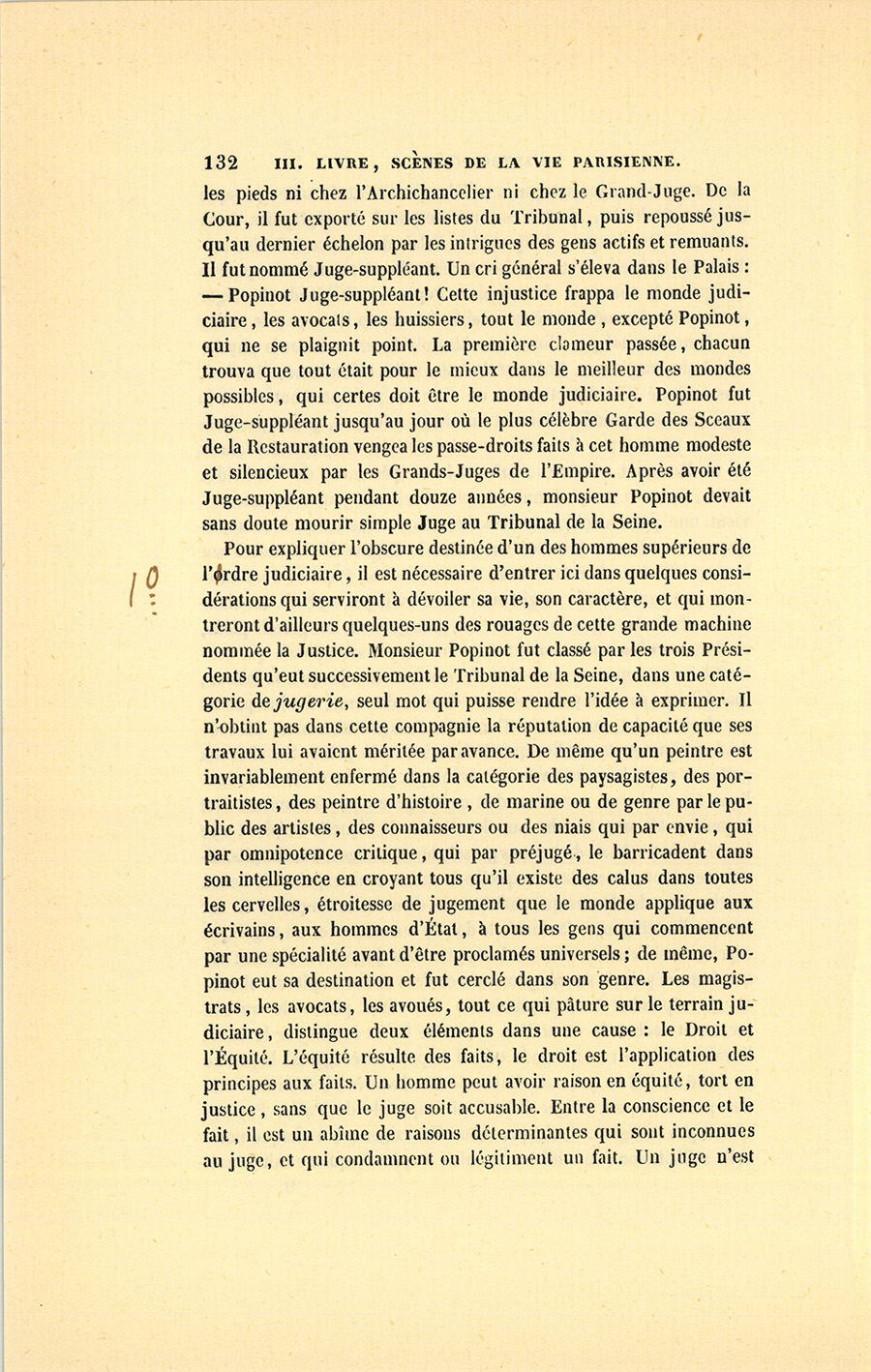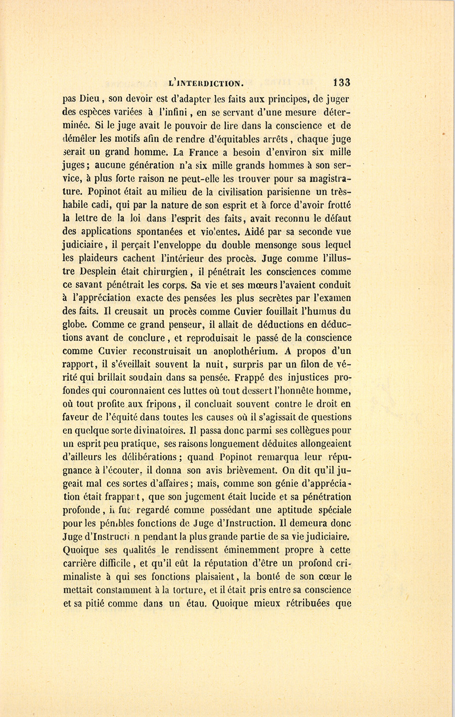 Pour expliquer l’obscure destinée d’un des hommes supérieurs de l’Ordre judiciaire, il est nécessaire d’entrer ici dans quelques considérations qui serviront à dévoiler sa vie, son caractère, et qui montreront d’ailleurs quelques-uns des rouages de cette grande machine nommée la Justice. Monsieur Popinot fut classé par les trois Présidents qu’eut successivement le Tribunal de la Seine, dans une catégorie de jugerie, seul mot qui puisse rendre l’idée à exprimer. Il n’obtint pas dans cette compagnie la réputation de capacité que ses travaux lui avaient méritée par avance. De même qu’un peintre est invariablement enfermé dans la catégorie des paysagistes, des portraitistes, des peintres1 d’histoire, de marine ou de genre par le public des artistes, des connaisseurs ou des niais qui par envie, qui par omnipotence critique, qui par préjugé, le barricadent dans son intelligence en croyant tous qu’il existe des calus dans toutes les cervelles, étroitesse de jugement que le monde applique aux écrivains, aux hommes d’État, à tous les gens qui commencent par une spécialité avant d’être proclamés universels ; de même, Popinot eut sa destination et fut cerclé dans son genre. Les magistrats, les avocats, les avoués, tout ce qui pâture sur le terrain judiciaire, distingue deux éléments dans une cause : le Droit et l’Équité. L’équité résulte des faits, le droit est l’application des principes aux faits. Un homme peut avoir raison en équité, tort en justice, sans que le juge soit accusable. Entre la conscience et le fait, il est un abîme de raisons déterminantes qui sont inconnues au juge, et qui condamnent ou légitiment un fait. Un juge n’est {p. 133} pas Dieu, son devoir est d’adapter les faits aux principes, de juger des espèces variées à l’infini, en se servant d’une mesure déterminée. Si le juge avait le pouvoir de lire dans la conscience et de démêler les motifs afin de rendre d’équitables arrêts, chaque juge serait un grand homme. La France a besoin d’environ six mille juges ; aucune génération n’a six mille grands hommes à son service, à plus forte raison ne peut-elle les trouver pour sa magistrature. Popinot était au milieu de la civilisation parisienne un très-habile cadi, qui par la nature de son esprit et à force d’avoir frotté la lettre de la loi dans l’esprit des faits, avait reconnu le défaut des applications spontanées et violentes. Aidé par sa seconde vue judiciaire, il perçait l’enveloppe du double mensonge sous lequel les plaideurs cachent l’intérieur des procès. Juge comme l’illustre Desplein était chirurgien, il pénétrait les consciences comme ce savant pénétrait les corps. Sa vie et ses mœurs l’avaient conduit à l’appréciation exacte des pensées les plus secrètes par l’examen des faits. Il creusait un procès comme Cuvier fouillait l’humus du globe. Comme ce grand penseur, il allait de déductions en déductions avant de conclure, et reproduisait le passé de la conscience comme Cuvier reconstruisait un anoplothérium. À propos d’un rapport, il s’éveillait souvent la nuit, surpris par un filon de vérité qui brillait soudain dans sa pensée. Frappé des injustices profondes qui couronnaient ces luttes où tout dessert l’honnête homme, où tout profite aux fripons, il concluait souvent contre le droit en faveur de l’équité dans toutes les causes où il s’agissait de questions en quelque sorte divinatoires. Il passa donc parmi ses collègues pour un esprit peu pratique, ses raisons longuement déduites allongeaient d’ailleurs les délibérations ; quand Popinot remarqua leur répugnance à l’écouter, il donna son avis brièvement. On dit qu’il jugeait mal ces sortes d’affaires ; mais, comme son génie d’appréciation était frappant, que son jugement était lucide et sa pénétration profonde, il fut regardé comme possédant une aptitude spéciale pour les pénibles fonctions de Juge d’Instruction. Il demeura donc Juge d’Instruction pendant la plus grande partie de sa vie judiciaire. Quoique ses qualités le rendissent éminemment propre à cette carrière difficile, et qu’il eût la réputation d’être un profond criminaliste à qui ses fonctions plaisaient, la bonté de son cœur le mettait constamment à la torture, et il était pris entre sa conscience et sa pitié comme dans un étau. Quoique mieux rétribuées que {p. 134} celles de Juge civil, les fonctions de Juge d’Instruction ne tentent personne ; elles sont trop assujettissantes. Popinot, homme de modestie et de vertueux savoir, sans ambition, travailleur infatigable, ne se plaignit pas de sa destination : il fit au bien public le sacrifice de ses goûts, de sa compatissance, et se laissa déporter dans les lagunes de l’Instruction criminelle, où il sut être à la fois sévère et bienfaisant. Parfois, son greffier remettait au prévenu de l’argent pour acheter du tabac, ou pour avoir un vêtement chaud en hiver, en le reconduisant du cabinet du juge à la Souricière, prison temporaire où l’on tient les prévenus à la disposition de l’instructeur. Il savait être juge inflexible et homme charitable. Aussi nul n’obtenait-il plus facilement que lui des aveux sans recourir aux ruses judiciaires. Il avait d’ailleurs la finesse de l’observateur. Cet homme, d’une bonté niaise en apparence, simple et distrait, devinait les ruses des Crispins du bagne, déjouait les filles les plus astucieuses, et faisait fléchir les scélérats. Des circonstances peu communes avaient aiguisé sa perspicacité ; mais pour les dire, besoin est de pénétrer dans sa vie intime : car le juge était en lui le côté social ; un autre homme plus grand et moins connu se trouvait en lui.