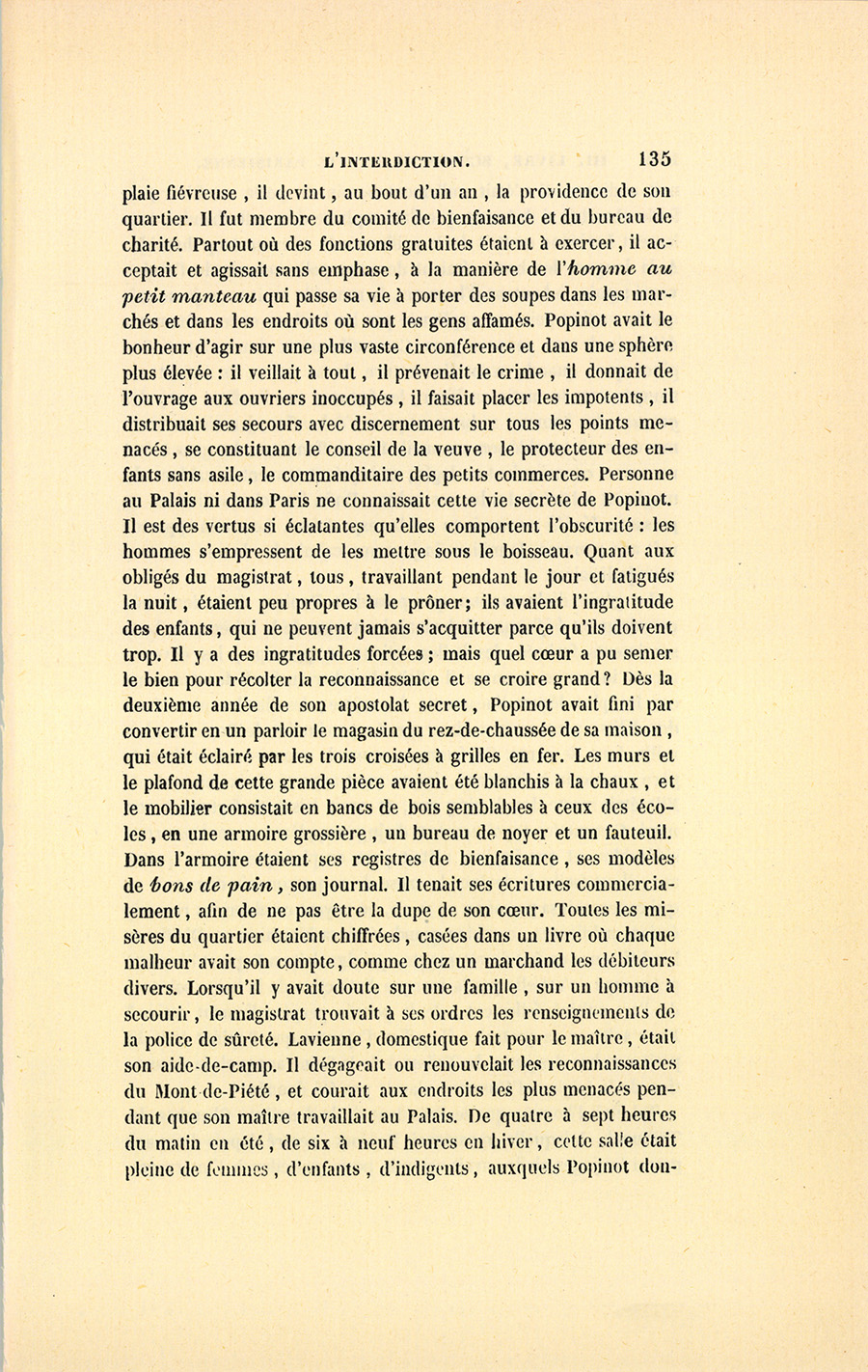 Douze ans avant le jour où cette histoire commence, en 1816, par cette terrible disette qui coïncida fatalement avec le séjour des soi-disant Alliés en France, Popinot fut nommé président de la commission extraordinaire instituée pour distribuer des secours aux indigents de son quartier au moment où il projetait d’abandonner la rue du Fouarre, dont l’habitation ne lui déplaisait pas moins qu’à sa femme. Ce grand jurisconsulte, ce profond criminaliste, de qui la supériorité paraissait à ses collègues une aberration, avait depuis cinq ans aperçu les résultats judiciaires sans en voir les causes. En montant dans les greniers, en apercevant les misères, en étudiant les nécessités cruelles qui conduisent graduellement les pauvres à des actions blâmables, en mesurant enfin leurs longues luttes, il fut saisi de compassion. Ce juge devint alors le saint Vincent-de-Paul de ces grands enfants, de ces ouvriers souffrants. Sa transformation ne fut pas tout à coup complète. La bienfaisance a son entraînement comme les vices ont le leur. La Charité dévore la bourse d’un saint comme la Roulette mange les biens du joueur, graduellement. Popinot alla d’infortune en infortune, d’aumône en aumône ; puis, quand il eut soulevé tous les haillons qui forment à cette misère publique comme un appareil sous lequel s’envenime une {p. 135} plaie fiévreuse, il devint, au bout d’un an, la providence de son quartier. Il fut membre du comité de bienfaisance et du bureau de charité. Partout où des fonctions gratuites étaient à exercer, il acceptait et agissait sans emphase, à la manière de l’homme au petit manteau qui passe sa vie à porter des soupes dans les marchés et dans les endroits où sont les gens affamés. Popinot avait le bonheur d’agir sur une plus vaste circonférence et dans une sphère plus élevée : il veillait à tout, il prévenait le crime, il donnait de l’ouvrage aux ouvriers inoccupés, il faisait placer les impotents, il distribuait ses secours avec discernement sur tous les points menacés, se constituant le conseil de la veuve, le protecteur des enfants sans asile, le commanditaire des petits commerces. Personne au Palais ni dans Paris ne connaissait cette vie secrète de Popinot. Il est des vertus si éclatantes qu’elles comportent l’obscurité : les hommes s’empressent de les mettre sous le boisseau. Quant aux obligés du magistrat, tous, travaillant pendant le jour et fatigués la nuit, étaient peu propres à le prôner ; ils avaient l’ingratitude des enfants, qui ne peuvent jamais s’acquitter parce qu’ils doivent trop. Il y a des ingratitudes forcées ; mais quel cœur a pu semer le bien pour récolter la reconnaissance et se croire grand ? Dès la deuxième année de son apostolat secret, Popinot avait fini par convertir en un parloir le magasin du rez-de-chaussée de sa maison, qui était éclairé par les trois croisées à grilles en fer. Les murs et le plafond de cette grande pièce avaient été blanchis à la chaux, et le mobilier consistait en bancs de bois semblables à ceux des écoles, en une armoire grossière, un bureau de noyer et un fauteuil. Dans l’armoire étaient ses registres de bienfaisance, ses modèles de bons de pain, son journal. Il tenait ses écritures commercialement, afin de ne pas être la dupe de son cœur. Toutes les misères du quartier étaient chiffrées, casées dans un livre où chaque malheur avait son compte, comme chez un marchand les débiteurs divers. Lorsqu’il y avait doute sur une famille, sur un homme à secourir, le magistrat trouvait à ses ordres les renseignements de la police de sûreté. Lavienne, domestique fait pour le maître, était son aide-de-camp. Il dégageait ou renouvelait les reconnaissances du Mont-de-Piété, et courait aux endroits les plus menacés pendant que son maître travaillait au Palais. De quatre à sept heures du matin en été, de six à neuf heures en hiver, cette salle était pleine de femmes, d’enfants, d’indigents, auxquels Popinot {p. 136} donnait audience. Il n’était nullement besoin de poêle en hiver ; la foule abondait si drûment que l’atmosphère devenait chaude ; seulement Lavienne mettait de la paille sur le carreau trop humide. À la longue, les bancs étaient devenus polis comme de l’acajou verni ; puis, à hauteur d’homme, la muraille avait reçu je ne sais quelle sombre peinture appliquée par les haillons et les vêtements délabrés de ces pauvres gens. Ces malheureux aimaient tant Popinot que, quand, avant l’ouverture de sa porte, ils étaient attroupés vers le matin en hiver, les femmes se chauffant avec des gueux, les hommes se brassant pour s’échauffer, jamais un murmure n’avait troublé son sommeil. Les chiffonniers, les gens à état nocturne connaissaient ce logis, et voyaient souvent le cabinet du magistrat éclairé à des heures indues. Enfin les voleurs disaient en passant : Voilà sa maison, et la respectaient. Le matin appartenait aux pauvres, le milieu du jour aux criminels, le soir aux travaux judiciaires.