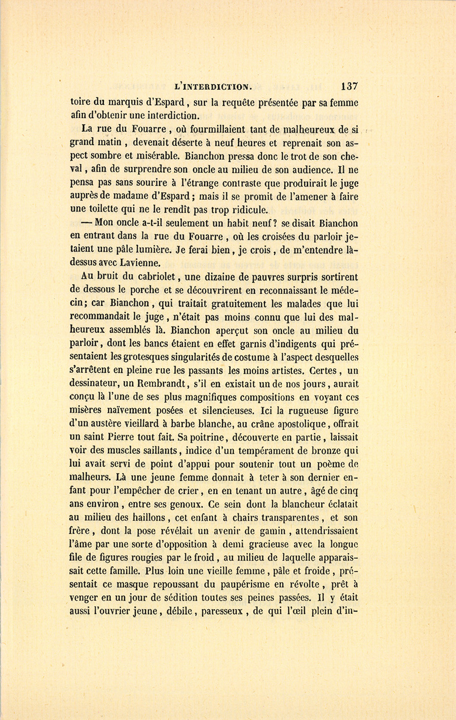 La rue du Fouarre, où fourmillaient tant de malheureux de si grand matin, devenait déserte à neuf heures et reprenait son aspect sombre et misérable. Bianchon pressa donc le trot de son cheval, afin de surprendre son oncle au milieu de son audience. Il ne pensa pas sans sourire à l’étrange contraste que produirait le juge auprès de madame d’Espard ; mais il se promit de l’amener à faire une toilette qui ne le rendît pas trop ridicule.