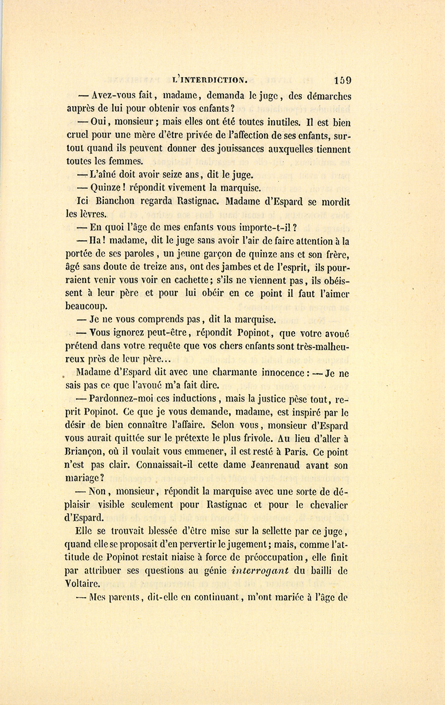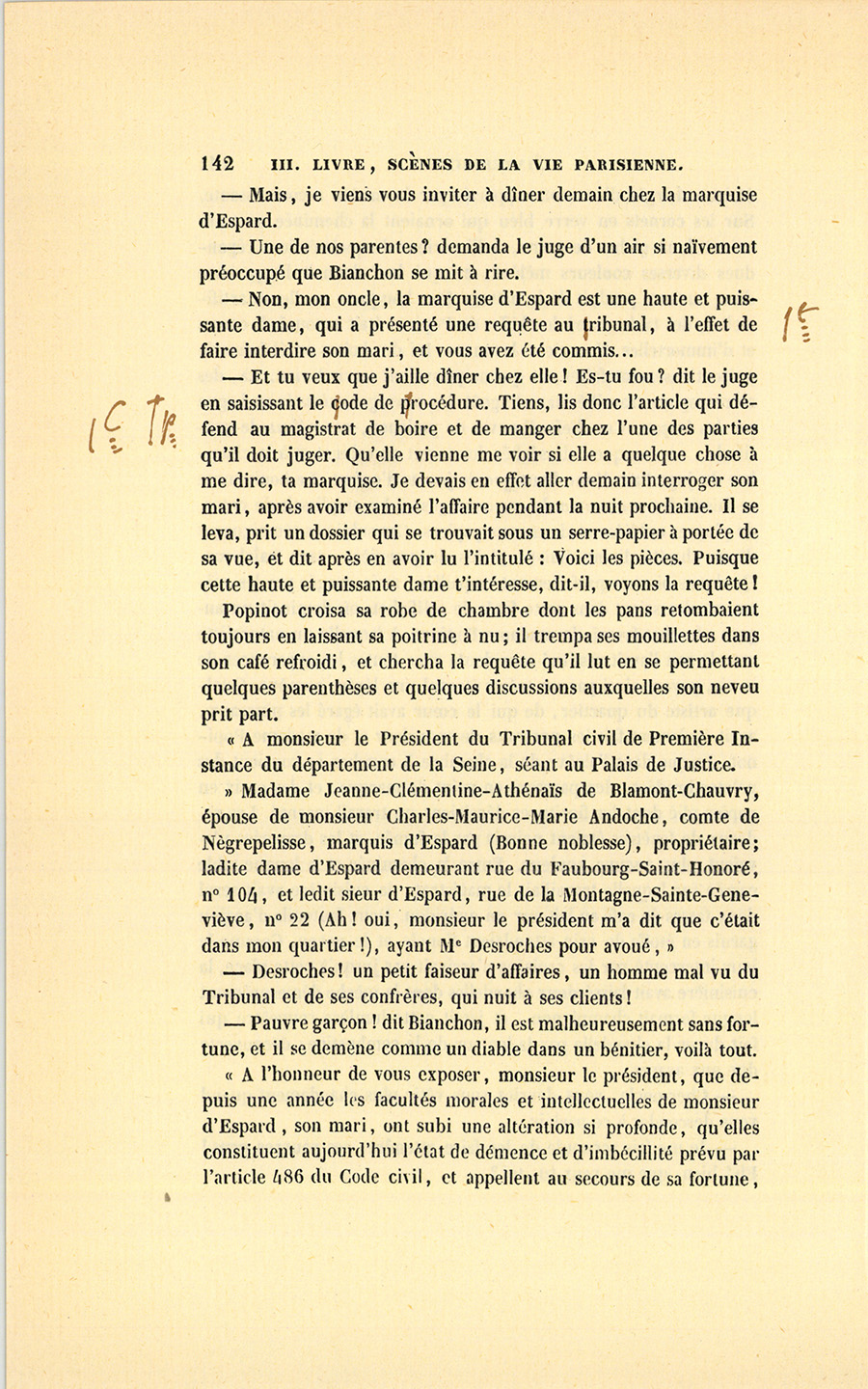 Tel était l’homme que le Président de la deuxième Chambre du Tribunal, à laquelle appartenait Popinot, rentré depuis deux ans parmi les juges civils, avait commis pour procéder à {p. 137} l’interrogatoire du marquis d’Espard, sur la requête présentée par sa femme afin d’obtenir une interdiction.