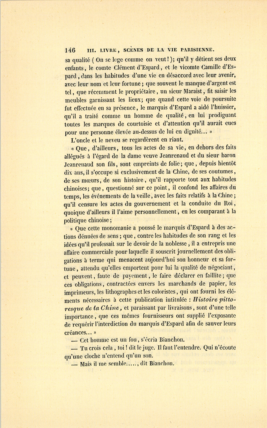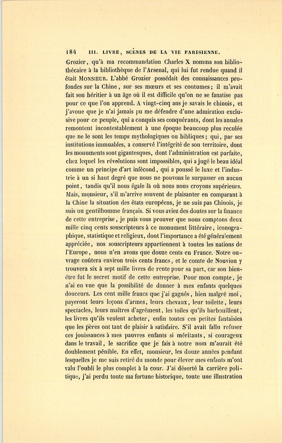 – Je l’espère, répondit le marquis ; mais j’attendrai que mon plus jeune fils ait fini ses études, et que le caractère de mes enfants soit entièrement formé, avant de les introduire dans le monde et près de leur mère ; d’ailleurs, après leur avoir donné la solide instruction qu’ils possèdent, je veux la compléter en les faisant voyager dans les capitales de l’Europe afin de leur faire voir les hommes et les choses, et les habituer à parler les langues qu’ils ont apprises. Monsieur, dit-il en faisant asseoir le juge dans le salon, je ne pouvais vous entretenir de la publication sur la Chine devant un vieil ami de ma famille, le comte de Nouvion, revenu de l’émigration sans aucune espèce de fortune, et avec qui j’ai fait cette affaire, moins pour moi que pour lui. Sans lui confier les motifs de ma retraite, je lui dis que j’étais ruiné comme lui, mais que j’avais assez d’argent pour entreprendre une spéculation dans laquelle il pouvait s’employer utilement. Mon précepteur fut l’abbé {p. 184} Grozier, qu’à ma recommandation Charles X nomma son bibliothécaire à la bibliothèque de l’Arsenal, qui lui fut rendue quand il était Monsieur. L’abbé Grozier possédait des connaissances profondes sur la Chine, sur ses mœurs et ses coutumes ; il m’avait fait son héritier à un âge où il est difficile qu’on ne se fanatise pas pour ce que l’on apprend. À vingt-cinq ans je savais le chinois, et j’avoue que je n’ai jamais pu me défendre d’une admiration exclusive pour ce peuple, qui a conquis ses conquérants, dont les annales remontent incontestablement à une époque beaucoup plus reculée que ne le sont les temps mythologiques ou bibliques ; qui, par ses institutions immuables, a conservé l’intégrité de son territoire, dont les monuments sont gigantesques, dont l’administration est parfaite, chez lequel les révolutions sont impossibles, qui a jugé le beau idéal comme un principe d’art infécond, qui a poussé le luxe et l’industrie à un si haut degré que nous ne pouvons le surpasser en aucun point, tandis qu’il nous égale là où nous nous croyons supérieurs. Mais, monsieur, s’il m’arrive souvent de plaisanter en comparant à la Chine la situation des états européens, je ne suis pas Chinois, je suis un gentilhomme français. Si vous aviez des doutes sur la finance de cette entreprise, je puis vous prouver que nous comptons deux mille cinq cents souscripteurs à ce monument littéraire, iconographique, statistique et religieux, dont l’importance a été généralement appréciée, nos souscripteurs appartiennent à toutes les nations de l’Europe, nous n’en avons que douze cents en France. Notre ouvrage coûtera environ trois cents francs, et le comte de Nouvion y trouvera six à sept mille livres de rente pour sa part, car son bien-être fut le secret motif de cette entreprise. Pour mon compte, je n’ai en vue que la possibilité de donner à mes enfants quelques douceurs. Les cent mille francs que j’ai gagnés, bien malgré moi, payeront leurs leçons d’armes, leurs chevaux, leur toilette, leurs spectacles, leurs maîtres d’agrément, les toiles qu’ils barbouillent, les livres qu’ils veulent acheter, enfin toutes ces petites fantaisies que les pères ont tant de plaisir à satisfaire. S’il avait fallu refuser ces jouissances à mes pauvres enfants si méritants, si courageux dans le travail, le sacrifice que je fais à notre nom m’aurait été doublement pénible. En effet, monsieur, les douze années pendant lesquelles je me suis retiré du monde pour élever mes enfants m’ont valu l’oubli le plus complet à la cour. J’ai déserté la carrière politique, j’ai perdu toute ma fortune historique, toute une illustration {p. 185} nouvelle que je pouvais léguer à mes enfants ; mais notre maison n’aura rien perdu, mes fils seront des hommes distingués. Si la pairie m’a manqué, ils la conquerront noblement en se consacrant aux affaires de leur pays, et lui rendront de ces services qui ne s’oublient pas. Tout en purifiant le passé de notre maison, je lui assurais un glorieux avenir : n’est-ce pas avoir accompli une belle tâche quoique secrète et sans gloire ? Avez-vous maintenant, monsieur, quelques autres éclaircissements à me demander ?