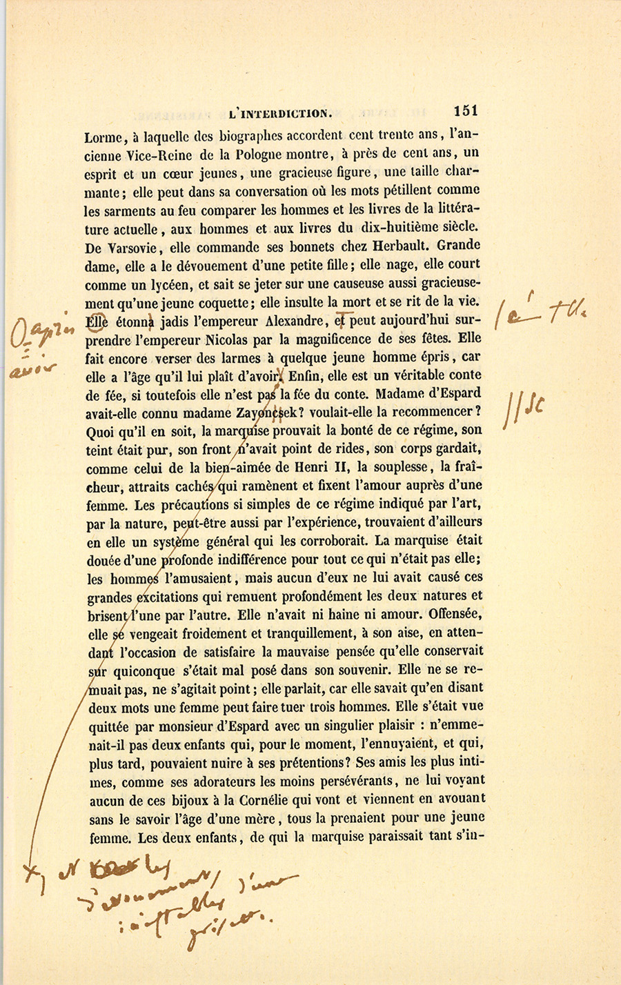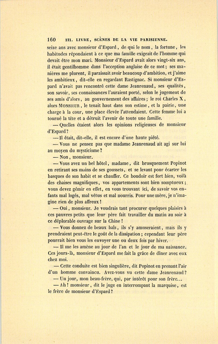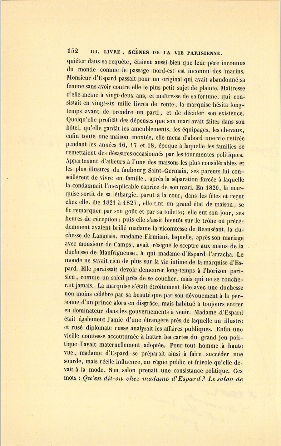 Qu’aucune raison, même prise parmi celles que la morale et la loi réprouvent également, ne peut justifier l’empire que la dame veuve Jeanrenaud a pris sur le marquis d’Espard, qui, d’ailleurs, la voit très-rarement ; ni expliquer son étrange affection pour ledit sieur baron Jeanrenaud, avec qui ses communications {p. 144} sont peu fréquentes : cependant leur autorité se trouve être si grande, que chaque fois qu’ils ont besoin d’argent, fût-ce même pour satisfaire de simples fantaisies, cette dame ou son fils…