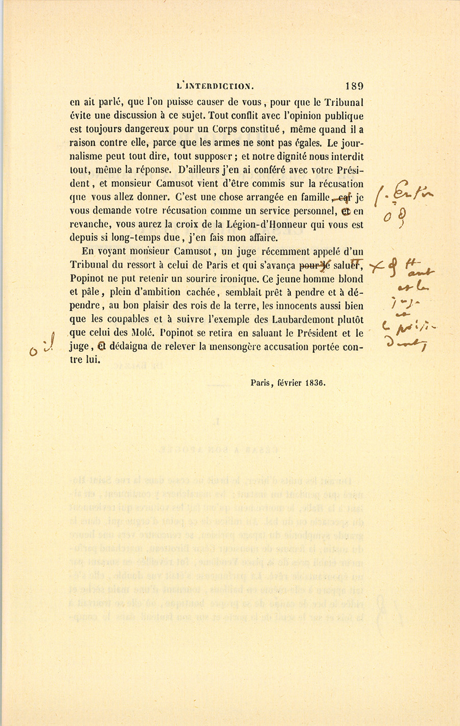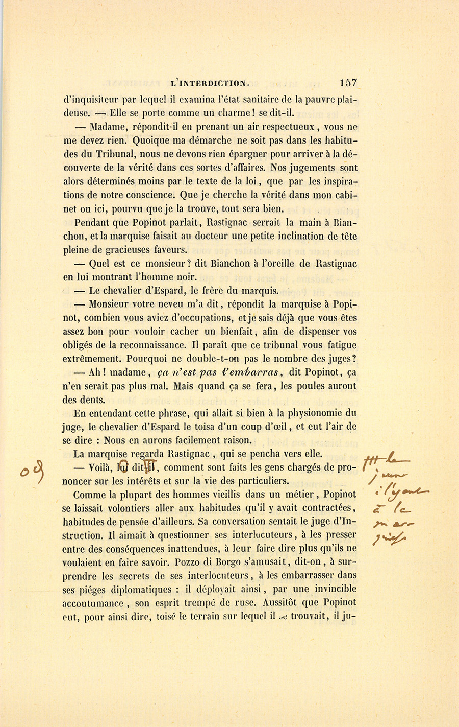 – Monsieur le marquis, ajouta Popinot en le saluant, je suis heureux d’avoir à vous dire que, dès les premiers mots de cet interrogatoire, j’avais jugé mon greffier inutile. Puis il s’approcha du marquis, l’entraîna dans l’embrasure d’une croisée et lui dit : {p. 188} – Il est temps que vous rentriez chez vous, monsieur ; je crois qu’en cette affaire madame la marquise a subi des influences que vous devez combattre dès aujourd’hui.