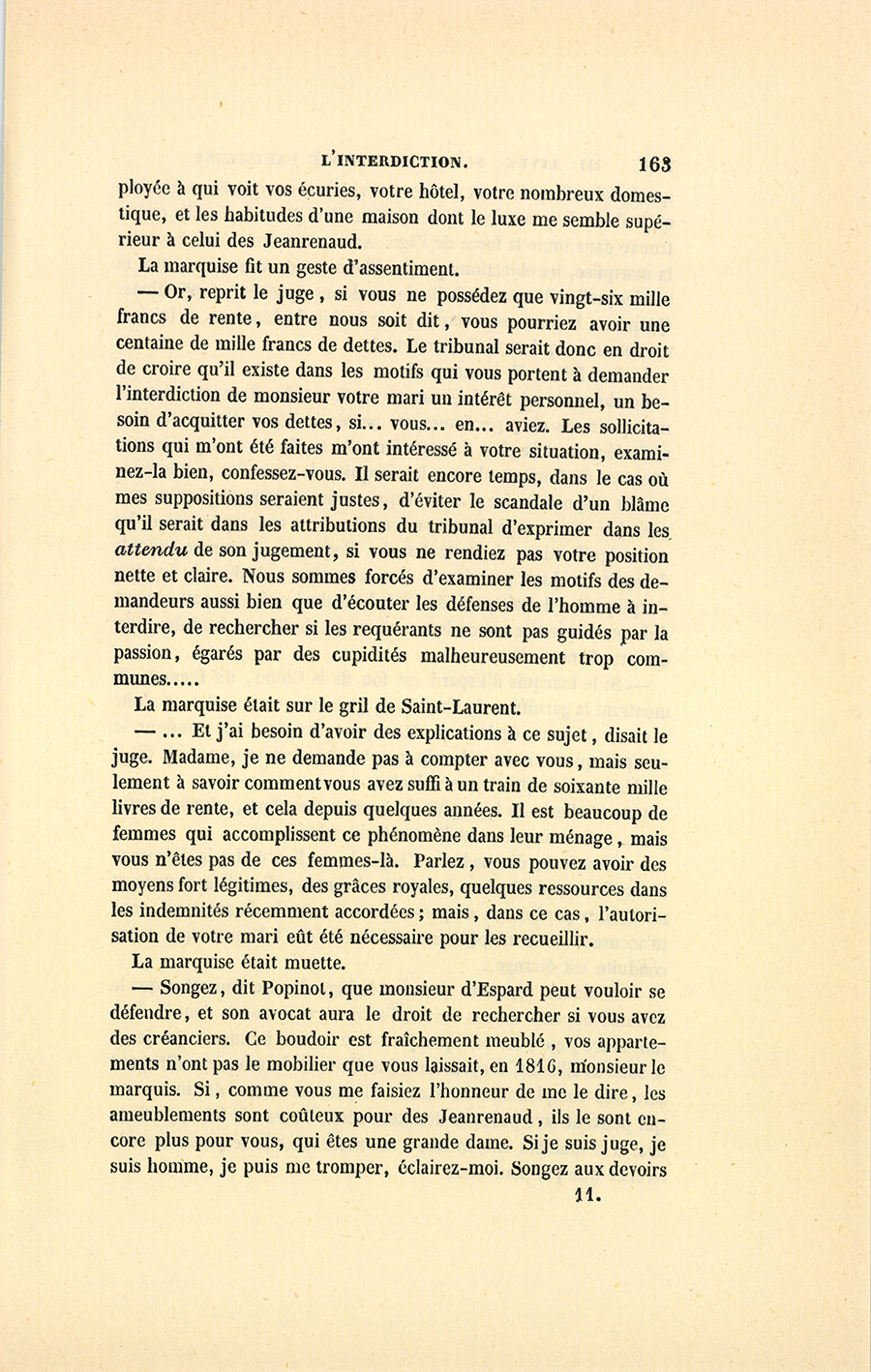 – Madame, dit le juge, les sommes que monsieur le marquis vous a remises vous sont légitimement dues, quoiqu’elles vous aient été données en vertu d’un principe de probité très-étendu. Si les gens qui possèdent des biens confisqués de quelque manière que ce soit, même par des manœuvres perfides, étaient, après cent cinquante ans, obligés à des restitutions, il se trouverait en France peu de propriétés légitimes. Les biens de Jacques Cœur ont enrichi vingt familles nobles, les confiscations abusives prononcées par les Anglais au profit de leurs adhérents, quand l’Anglais possédait une partie de la France, ont fait la fortune de plusieurs maisons princières. Notre législation permet à monsieur le marquis de disposer de ses revenus à titre gratuit, sans qu’il puisse être accusé de dissipation. L’interdiction {p. 187} d’un homme se base sur l’absence de toute raison dans ses actes ; mais ici la cause des remises qui vous sont faites est puisée dans les motifs les plus sacrés, les plus honorables. Ainsi vous pouvez tout garder sans remords et laisser le monde mal interpréter cette belle action. À Paris, la vertu la plus pure est l’objet des plus sales calomnies. Il est malheureux que l’état actuel de notre société rende la conduite de monsieur le marquis sublime. Je voudrais, pour l’honneur de notre pays, que de semblables actes y fussent trouvés tout simples ; mais les mœurs sont telles que je suis forcé, par comparaison, de regarder monsieur d’Espard comme un homme auquel il faudrait décerner une couronne au lieu de le menacer d’un jugement d’interdiction. Pendant tout le cours d’une longue vie judiciaire, je n’ai rien vu ni entendu qui m’ait plus ému que ce que je viens de voir et d’entendre. Mais il n’y a rien d’extraordinaire à trouver la vertu sous sa plus belle forme alors qu’elle est mise en pratique par des hommes qui appartiennent à la classe la plus élevée. Après m’être expliqué de cette manière, j’espère, monsieur le marquis, que vous serez certain de mon silence, et que vous n’aurez aucune inquiétude sur le jugement à intervenir, s’il y a jugement.