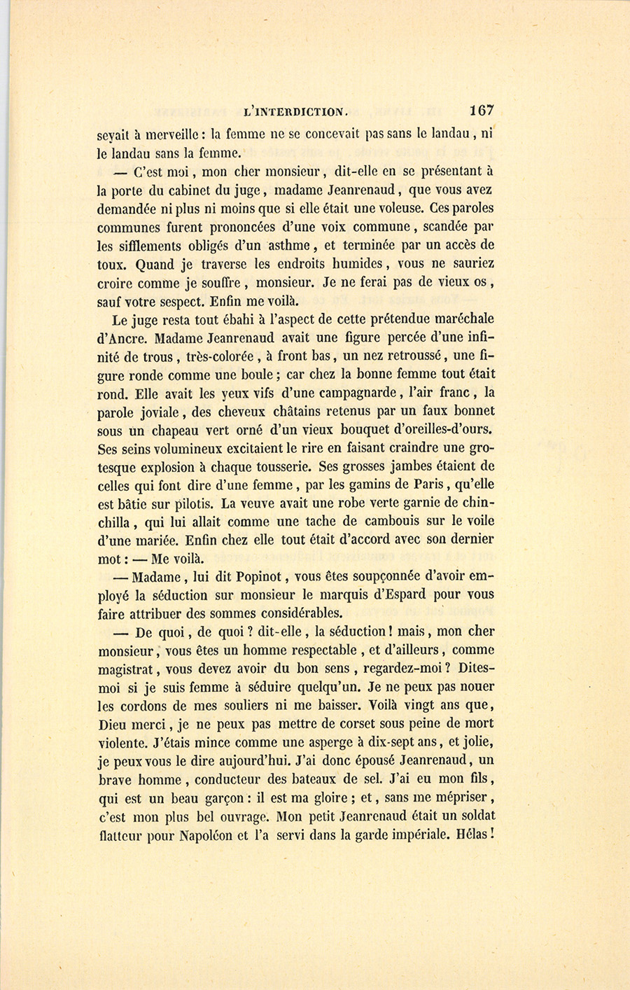 – De quoi, de quoi ? dit-elle, la séduction ! mais, mon cher monsieur, vous êtes un homme respectable, et d’ailleurs, comme magistrat, vous devez avoir du bon sens, regardez-moi ? Dites-moi si je suis femme à séduire quelqu’un. Je ne peux pas nouer les cordons de mes souliers ni me baisser. Voilà vingt ans que, Dieu merci, je ne peux pas mettre de corset sous peine de mort violente. J’étais mince comme une asperge à dix-sept ans, et jolie, je peux vous le dire aujourd’hui. J’ai donc épousé Jeanrenaud, un brave homme, conducteur des bateaux de sel. J’ai eu mon fils, qui est un beau garçon : il est ma gloire ; et, sans me mépriser, c’est mon plus bel ouvrage. Mon petit Jeanrenaud était un soldat flatteur pour Napoléon et l’a servi dans la garde impériale. Hélas ! {p. 168} la mort de mon homme, qui a péri noyé, m’a fait une révolution : j’ai eu la petite vérole, je suis restée deux ans dans ma chambre sans bouger, et j’en suis sortie grosse comme vous voyez, laide à perpétuité et malheureuse comme les pierres… Voilà mes séductions !