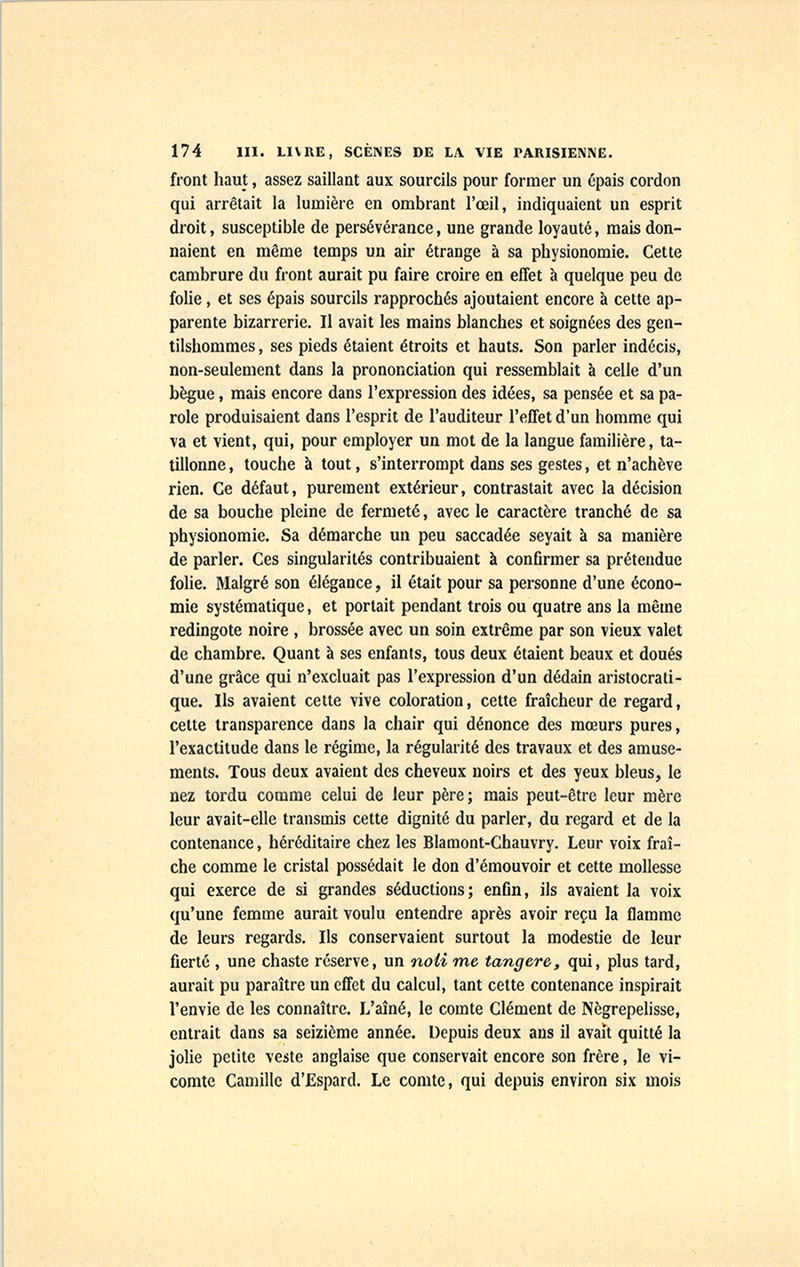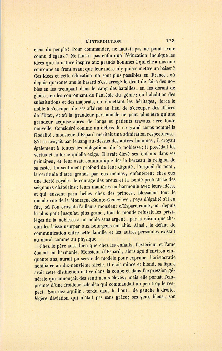 Chez le père aussi bien que chez les enfants, l’extérieur et l’âme étaient en harmonie. Monsieur d’Espard, alors âgé d’environ cinquante ans, aurait pu servir de modèle pour exprimer l’aristocratie nobiliaire au dix-neuvième siècle. Il était mince et blond, sa figure avait cette distinction native dans la coupe et dans l’expression générale qui annonçait des sentiments élevés ; mais elle portait l’empreinte d’une froideur calculée qui commandait un peu trop le respect. Son nez aquilin, tordu dans le bout, de gauche à droite, légère déviation qui n’était pas sans grâce ; ses yeux bleus, son {p. 174} front haut, assez saillant aux sourcils pour former un épais cordon qui arrêtait la lumière en ombrant l’œil, indiquaient un esprit droit, susceptible de persévérance, une grande loyauté, mais donnaient en même temps un air étrange à sa physionomie. Cette cambrure du front aurait pu faire croire en effet à quelque peu de folie, et ses épais sourcils rapprochés ajoutaient encore à cette apparente bizarrerie. Il avait les mains blanches et soignées des gentilshommes, ses pieds étaient étroits et hauts. Son parler indécis, non-seulement dans la prononciation qui ressemblait à celle d’un bègue, mais encore dans l’expression des idées, sa pensée et sa parole produisaient dans l’esprit de l’auditeur l’effet d’un homme qui va et vient, qui, pour employer un mot de la langue familière, tatillonne, touche à tout, s’interrompt dans ses gestes, et n’achève rien. Ce défaut, purement extérieur, contrastait avec la décision de sa bouche pleine de fermeté, avec le caractère tranché de sa physionomie. Sa démarche un peu saccadée seyait à sa manière de parler. Ces singularités contribuaient à confirmer sa prétendue folie. Malgré son élégance, il était pour sa personne d’une économie systématique, et portait pendant trois ou quatre ans la même redingote noire, brossée avec un soin extrême par son vieux valet de chambre. Quant à ses enfants, tous deux étaient beaux et doués d’une grâce qui n’excluait pas l’expression d’un dédain aristocratique. Ils avaient cette vive coloration, cette fraîcheur de regard, cette transparence dans la chair qui dénonce des mœurs pures, l’exactitude dans le régime, la régularité des travaux et des amusements. Tous deux avaient des cheveux noirs et des yeux bleus, le nez tordu comme celui de leur père ; mais peut-être leur mère leur avait-elle transmis cette dignité du parler, du regard et de la contenance, héréditaire chez les Blamont-Chauvry. Leur voix fraîche comme le cristal possédait le don d’émouvoir et cette mollesse qui exerce de si grandes séductions ; enfin, ils avaient la voix qu’une femme aurait voulu entendre après avoir reçu la flamme de leurs regards. Ils conservaient surtout la modestie de leur fierté, une chaste réserve, un noli me tangere, qui, plus tard, aurait pu paraître un effet du calcul, tant cette contenance inspirait l’envie de les connaître. L’aîné, le comte Clément de Nègrepelisse, entrait dans sa seizième année. Depuis deux ans il avait quitté la jolie petite veste anglaise que conservait encore son frère, le vicomte Camille d’Espard. Le comte, qui depuis environ six mois {p. 175} n’allait plus au collége Henri IV, était vêtu comme un jeune homme adonné aux premiers bonheurs que procure l’élégance. Son père n’avait pas voulu lui faire faire inutilement une année de philosophie, il tâchait de donner à ses connaissances une sorte de lien par l’étude des mathématiques transcendantes. En même temps le marquis lui apprenait les langues orientales, le droit diplomatique de l’Europe, le blason, et l’histoire aux grandes sources, l’histoire dans les chartes, dans les pièces authentiques, dans les recueils d’ordonnances. Camille était entré récemment en Rhétorique.