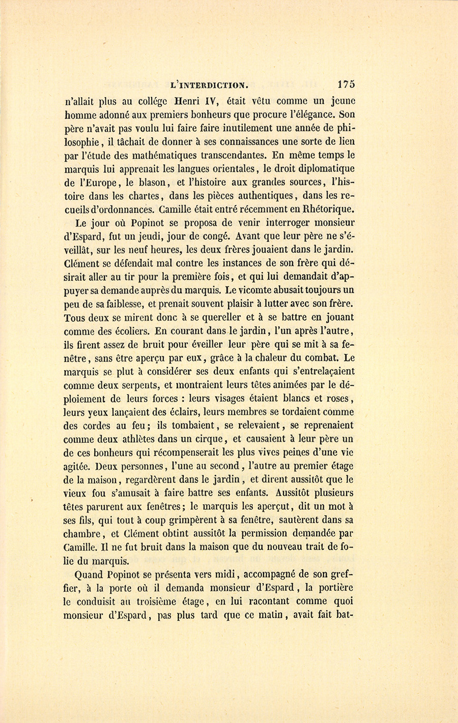 Le jour où Popinot se proposa de venir interroger monsieur d’Espard, fut un jeudi, jour de congé. Avant que leur père ne s’éveillât, sur les neuf heures, les deux frères jouaient dans le jardin. Clément se défendait mal contre les instances de son frère qui désirait aller au tir pour la première fois, et qui lui demandait d’appuyer sa demande auprès du marquis. Le vicomte abusait toujours un peu de sa faiblesse, et prenait souvent plaisir à lutter avec son frère. Tous deux se mirent donc à se quereller et à se battre en jouant comme des écoliers. En courant dans le jardin, l’un après l’autre, ils firent assez de bruit pour éveiller leur père qui se mit à sa fenêtre, sans être aperçu par eux, grâce à la chaleur du combat. Le marquis se plut à considérer ses deux enfants qui s’entrelaçaient comme deux serpents, et montraient leurs têtes animées par le déploiement de leurs forces : leurs visages étaient blancs et roses, leurs yeux lançaient des éclairs, leurs membres se tordaient comme des cordes au feu ; ils tombaient, se relevaient, se reprenaient comme deux athlètes dans un cirque, et causaient à leur père un de ces bonheurs qui récompenserait les plus vives peines d’une vie agitée. Deux personnes, l’une au second, l’autre au premier étage de la maison, regardèrent dans le jardin, et dirent aussitôt que le vieux fou s’amusait à faire battre ses enfants. Aussitôt plusieurs têtes parurent aux fenêtres ; le marquis les aperçut, dit un mot à ses fils, qui tout à coup grimpèrent à sa fenêtre, sautèrent dans sa chambre, et Clément obtint aussitôt la permission demandée par Camille. Il ne fut bruit dans la maison que du nouveau trait de folie du marquis.