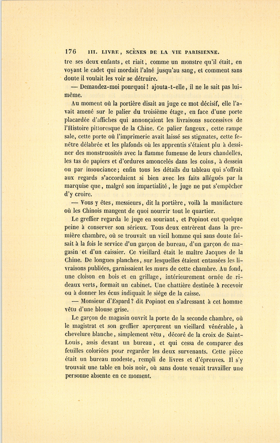 Au moment où la portière disait au juge ce mot décisif, elle l’avait amené sur le palier du troisième étage, en face d’une porte placardée d’affiches qui annonçaient les livraisons successives de l’Histoire pittoresque de la Chine. Ce palier fangeux, cette rampe sale, cette porte où l’imprimerie avait laissé ses stigmates, cette fenêtre délabrée et les plafonds où les apprentis s’étaient plu à dessiner des monstruosités avec la flamme fumeuse de leurs chandelles, les tas de papiers et d’ordures amoncelés dans les coins, à dessein ou par insouciance ; enfin tous les détails du tableau qui s’offrait aux regards s’accordaient si bien avec les faits allégués par la marquise que, malgré son impartialité, le juge ne put s’empêcher d’y croire.