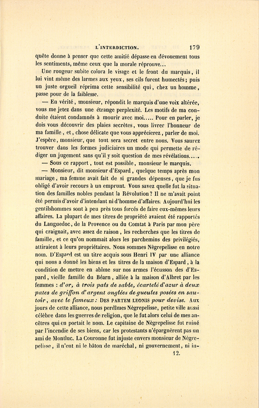 – Monsieur, dit monsieur d’Espard, quelque temps après mon mariage, ma femme avait fait de si grandes dépenses, que je fus obligé d’avoir recours à un emprunt. Vous savez quelle fut la situation des familles nobles pendant la Révolution ? Il ne m’avait point été permis d’avoir d’intendant ni d’homme d’affaires. Aujourd’hui les gentilshommes sont à peu près tous forcés de faire eux-mêmes leurs affaires. La plupart de mes titres de propriété avaient été rapportés du Languedoc, de la Provence ou du Comtat à Paris par mon père qui craignait, avec assez de raison, les recherches que les titres de famille, et ce qu’on nommait alors les parchemins des privilégiés, attiraient à leurs propriétaires. Nous sommes Nègrepelisse en notre nom. D’Espard est un titre acquis sous Henri IV par une alliance qui nous a donné les biens et les titres de la maison d’Espard, à la condition de mettre en abîme sur nos armes l’écusson des d’Espard, vieille famille du Béarn, alliée à la maison d’Albret par les femmes : d’or, à trois pals de sable, écartelé d’azur à deux pates de griffon d’argent onglées de gueules posées en sautoir, avec le fameux : Des partem leonis pour devise. Aux jours de cette alliance, nous perdîmes Nègrepelisse, petite ville aussi célèbre dans les guerres de religion, que le fut alors celui de mes ancêtres qui en portait le nom. Le capitaine de Nègrepelisse fut ruiné par l’incendie de ses biens, car les protestants n’épargnèrent pas un ami de Montluc. La Couronne fut injuste envers monsieur de Nègrepelisse, il n’eut ni le bâton de maréchal, ni gouvernement, ni {p. 180} indemnités ; le roi Charles IX, qui l’aimait, mourut sans avoir pu le récompenser ; Henri IV moyenna bien son mariage avec mademoiselle d’Espard, et lui procura les domaines de cette maison ; mais tous les biens des Nègrepelisse avaient déjà passé dans les mains des créanciers. Mon bisaïeul le marquis d’Espard fut, comme moi, mis assez jeune à la tête de ses affaires par la mort de son père, lequel après avoir dissipé la fortune de sa femme, ne lui laissa que les terres substituées de la maison d’Espard, mais grevées d’un douaire. Le jeune marquis d’Espard se trouva donc d’autant plus gêné qu’il avait une charge à la cour. Particulièrement bien vu de Louis XIV, la faveur du roi fut un brevet de fortune. Ici, monsieur, fut faite sur notre écusson une tache inconnue, horrible, une tache de boue et de sang, que je suis occupé à laver. Je découvris ce secret dans les titres relatifs à la terre de Nègrepelisse, et dans des liasses de correspondances.
