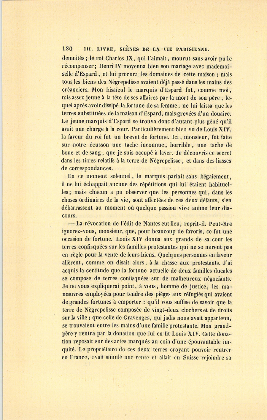 – La révocation de l’édit de Nantes eut lieu, reprit-il. Peut-être ignorez-vous, monsieur, que, pour beaucoup de favoris, ce fut une occasion de fortune. Louis XIV donna aux grands de sa cour les terres confisquées sur les familles protestantes qui ne se mirent pas en règle pour la vente de leurs biens. Quelques personnes en faveur allèrent, comme on disait alors, à la chasse aux protestants. J’ai acquis la certitude que la fortune actuelle de deux familles ducales se compose de terres confisquées sur de malheureux négociants. Je ne vous expliquerai point, à vous, homme de justice, les manœuvres employées pour tendre des piéges aux réfugiés qui avaient de grandes fortunes à emporter : qu’il vous suffise de savoir que la terre de Nègrepelisse composée de vingt-deux clochers et de droits sur la ville ; que celle de Gravenges, qui jadis nous avait appartenu, se trouvaient entre les mains d’une famille protestante. Mon grand-père y rentra par la donation que lui en fit Louis XIV. Cette donation reposait sur des actes marqués au coin d’une épouvantable iniquité. Le propriétaire de ces deux terres croyant pouvoir rentrer en France, avait simulé une vente et allait en Suisse rejoindre sa {p. 181} famille, qu’il y avait envoyée tout d’abord. Il voulait sans doute profiter de tous les délais accordés par l’ordonnance afin de régler les affaires de son commerce. Cet homme fut arrêté par un ordre du gouverneur, le fidéicommissaire déclara la vérité, le pauvre négociant fut pendu, mon père eut les deux terres. J’aurais voulu pouvoir ignorer la part que mon aïeul prit à cette intrigue ; mais le gouverneur était son oncle maternel, et j’ai lu malheureusement une lettre par laquelle il le priait de s’adresser à Déodatus, mot convenu entre les courtisans pour parler du Roi. Il règne dans cette lettre, à propos de la victime, un ton de plaisanterie qui m’a fait horreur. Enfin, monsieur, les sommes envoyées par la famille réfugiée pour racheter la vie du pauvre homme furent gardées par le gouverneur, qui n’en dépêcha pas moins le négociant.