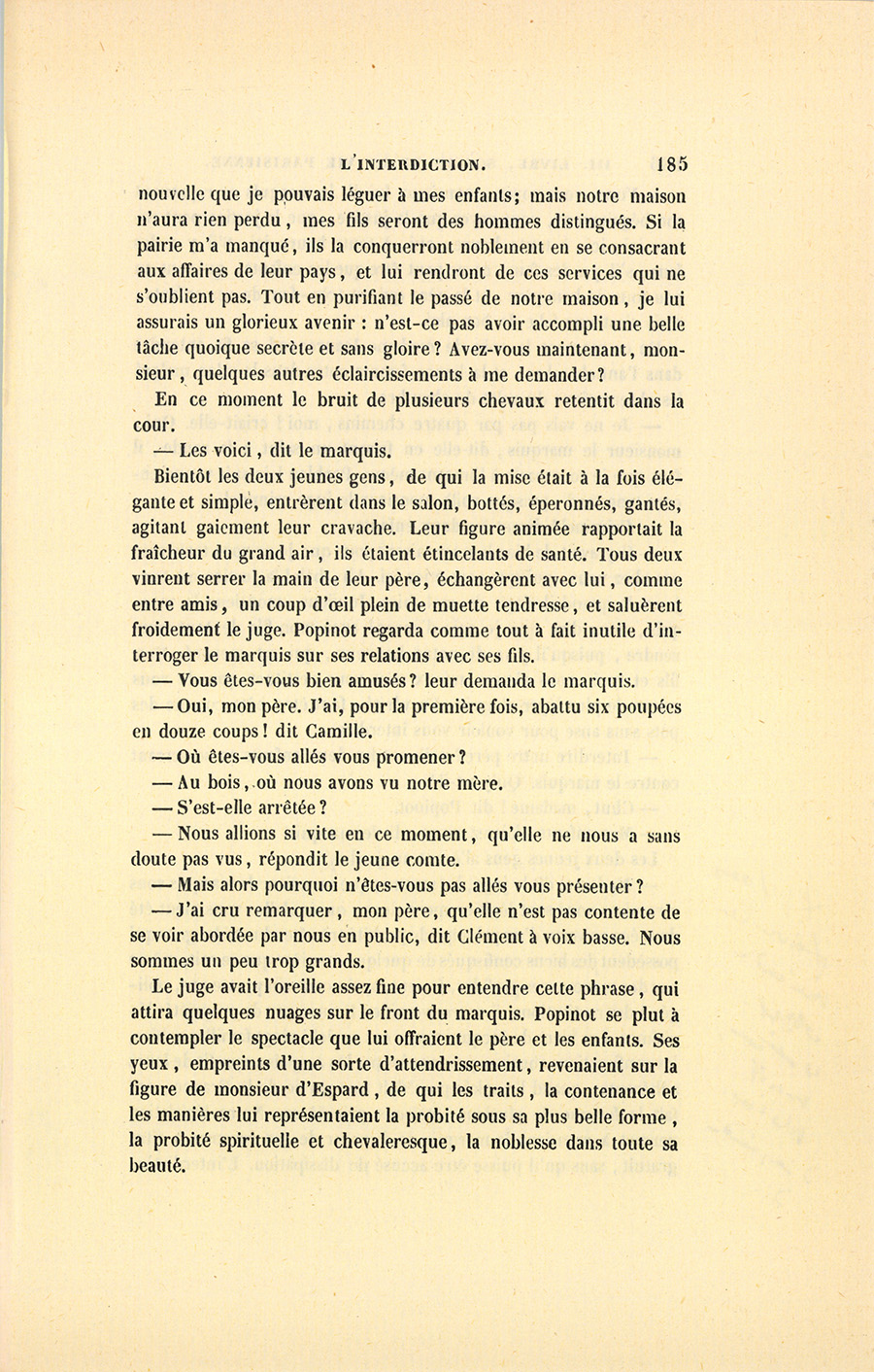 Bientôt les deux jeunes gens, de qui la mise était à la fois élégante et simple, entrèrent dans le salon, bottés, éperonnés, gantés, agitant gaiement leur cravache. Leur figure animée rapportait la fraîcheur du grand air, ils étaient étincelants de santé. Tous deux vinrent serrer la main de leur père, échangèrent avec lui, comme entre amis, un coup d’œil plein de muette tendresse, et saluèrent froidement le juge. Popinot regarda comme tout à fait inutile d’interroger le marquis sur ses relations avec ses fils.