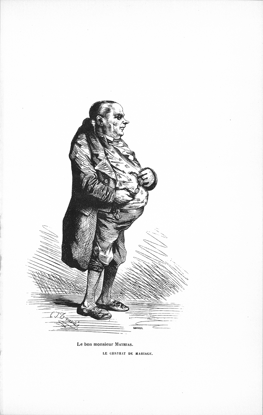 Maître Mathias était un vieux bonhomme âgé de soixante-neuf ans, et qui se faisait gloire de ses vingt années d’exercice en sa charge. Ses gros pieds de goutteux étaient chaussés de souliers ornés d’agrafes en argent, et terminaient ridiculement des jambes si menues, à rotules si saillantes que, quand il les croisait, vous eussiez dit les deux os gravés au-dessus des ci-gît. Ses petites cuisses maigres, perdues dans de larges culottes noires à boucles, semblaient plier sous le poids d’un ventre rond et d’un torse développé comme l’est le buste des gens de cabinet, une grosse boule toujours empaquetée dans un habit vert à basques carrées, que personne ne se souvenait d’avoir vu neuf. Ses cheveux, bien tirés et poudrés, se réunissaient en une petite queue de rat, toujours logée entre le collet de l’habit et celui de son gilet blanc à fleurs. Avec sa tête ronde, sa figure colorée comme une feuille de vigne, ses yeux bleus, le nez en trompette, une bouche à grosses lèvres, un menton doublé, ce cher petit homme excitait partout où il se montrait sans être connu le rire généreusement octroyé par le Français aux créations falotes 8 que se permet la nature, que l’art s’amuse à charger, et que nous nommons des caricatures. Mais chez maître Mathias l’esprit avait triomphé de la forme, les qualités de l’âme avaient vaincu les bizarreries du corps. La plupart des Bordelais lui témoignaient un respect amical, une déférence pleine d’estime. La voix du notaire gagnait le cœur en y faisant résonner l’éloquence de la probité. Pour toute ruse, il allait droit au fait en culbutant les mauvaises pensées par des interrogations {p. 197} précises. Son coup d’œil prompt, sa grande habitude des affaires lui donnaient ce sens divinatoire qui permet d’aller au fond des consciences et d’y lire les pensées secrètes. Quoique grave et posé dans les affaires, ce patriarche avait la gaieté de nos ancêtres. Il devait risquer la chanson de table, admettre et conserver les solennités de famille, célébrer les anniversaires, les fêtes des grand’mères et des enfants, enterrer avec cérémonie la bûche de Noël ; il devait aimer à donner des étrennes, à faire des surprises et offrir des œufs de Pâques ; il devait croire aux obligations du parrainage et ne déserter aucune des coutumes qui coloraient la vie d’autrefois. Maître Mathias était un noble et respectable débris de ces notaires, grands hommes obscurs, qui ne donnaient pas de reçu en acceptant des millions, mais les rendaient dans les mêmes sacs, ficelés de la même ficelle ; qui exécutaient à la lettre les fidéicommis, dressaient décemment les inventaires, s’intéressaient comme de seconds pères aux intérêts de leurs clients, barraient quelquefois le chemin devant les dissipateurs, et à qui les familles confiaient leurs secrets ; enfin l’un de ces notaires qui se croyaient responsables de leurs erreurs dans les actes et les méditaient longuement. Jamais, durant sa vie notariale, un de ses clients n’eut à se plaindre d’un placement perdu, d’une hypothèque ou mal prise ou mal assise. Sa fortune, lentement mais loyalement acquise, ne lui était venue qu’après trente années d’exercice et d’économie. Il avait établi quatorze de ses clercs. Religieux et généreux incognito, Mathias se trouvait partout où le bien s’opérait sans salaire. Membre actif du comité des hospices et du comité de bienfaisance, il s’inscrivait pour la plus forte somme dans les impositions volontaires destinées à secourir les infortunes subites, à créer quelques établissements utiles. Aussi ni lui ni sa femme n’avaient-ils de voiture, aussi sa parole était-elle sacrée, aussi ses caves gardaient-elles autant de capitaux qu’en avait la Banque, aussi le nommait-on le bon monsieur Mathias, et quand il mourut y eut-il trois mille personnes à son convoi. [ill.]