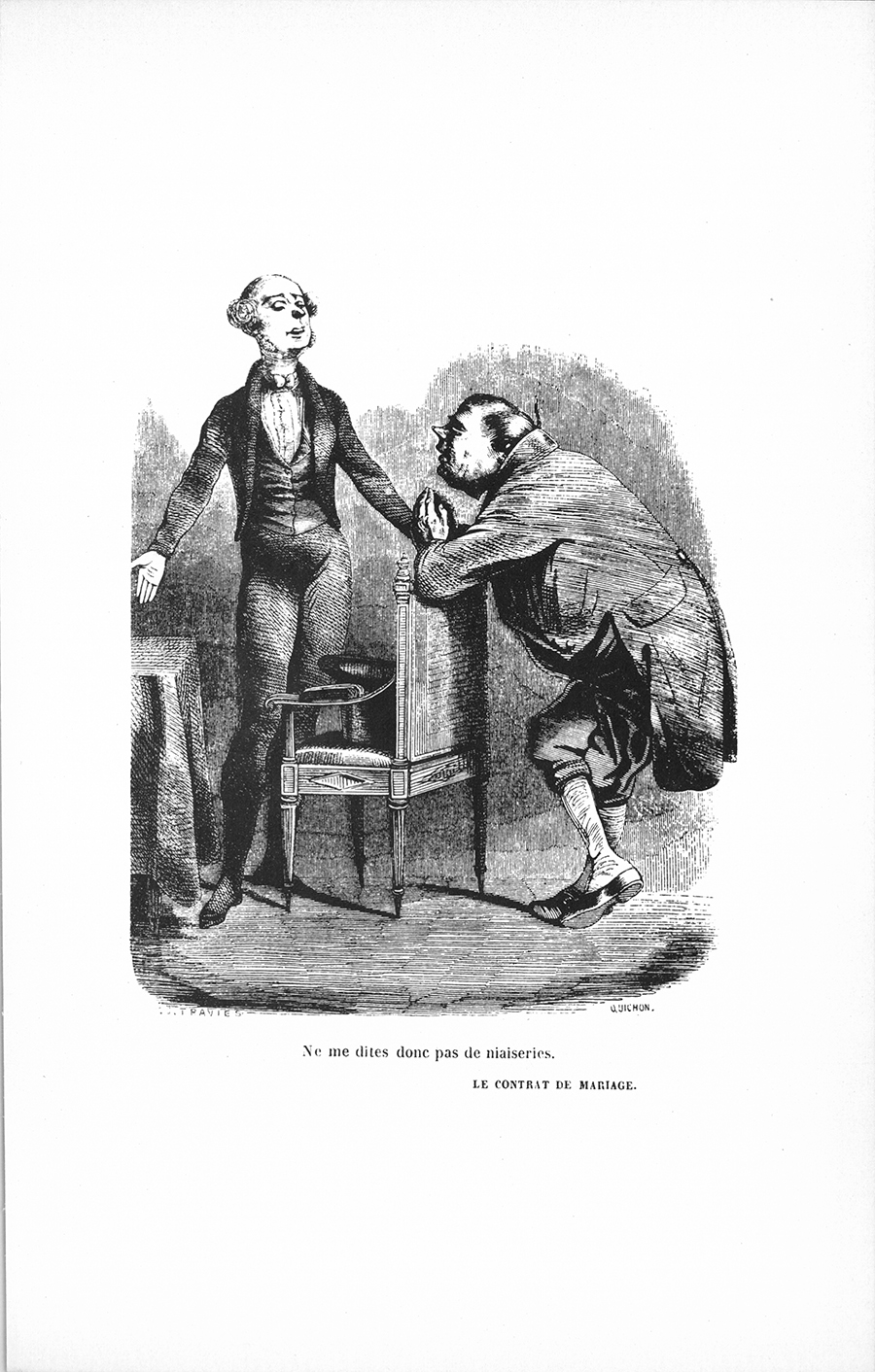 – La mère, mon enfant, est une fine mouche qui profite de la 5 {p. 190} beauté de sa fille pour imposer des conditions et ne vous laisser que ce qu’elle ne peut pas vous ôter, la fortune du père. Nous autres vieilles gens, nous tenons fort au : Qu’a-t-il ? Qu’a-t-elle ? Je vous engage à donner de bonnes instructions à votre notaire. Le contrat, mon enfant, est le plus saint des devoirs. Si votre père et votre mère n’avaient pas bien fait leur lit, vous seriez peut-être aujourd’hui sans draps. Vous aurez des enfants, c’est les suites les plus communes du mariage, il y faut donc penser. Voyez maître Mathias, notre vieux notaire.