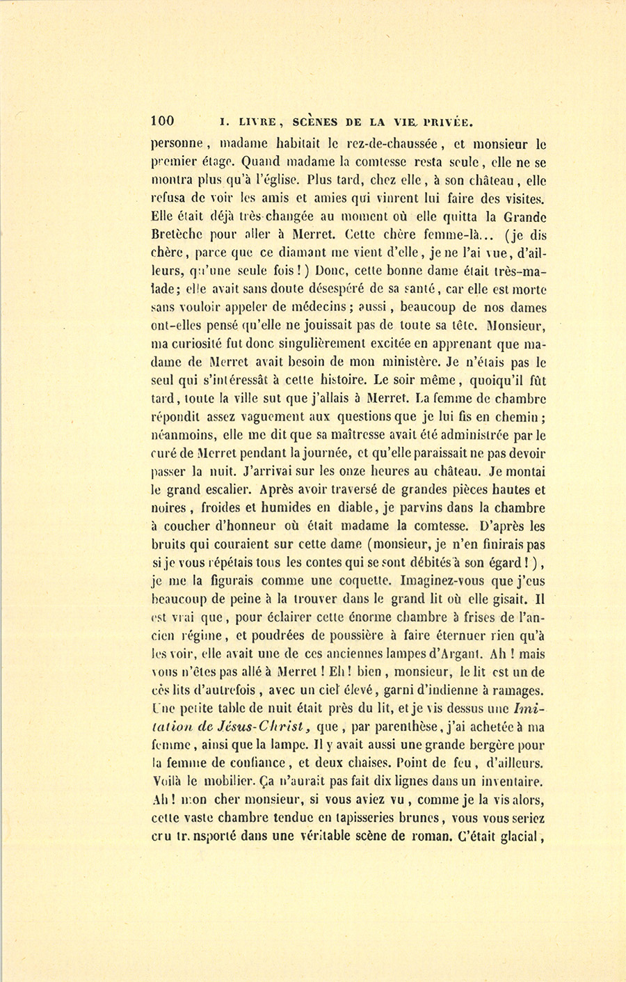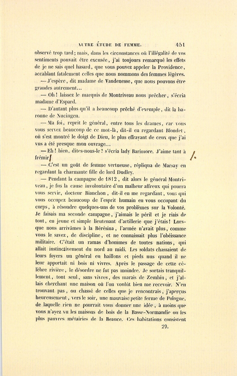 – Je suis de votre avis, madame, les femmes de cette époque sont vraiment grandes, répondit le général de Montriveau. Quand la postérité sera venue pour nous, est-ce que madame Récamier n’aura pas des proportions aussi grandes que celles des femmes les plus belles des temps passés ? Nous avons fait tant d’histoire que les historiens manqueront ! Le siècle de Louis XIV n’a eu qu’une madame de Sévigné, nous en avons mille aujourd’hui dans Paris qui certes écrivent mieux qu’elle et qui ne publient pas leurs lettres. Que la femme française s’appelle femme comme il faut ou grande dame, elle sera toujours la femme par excellence. Émile Blondet nous a fait une peinture des agréments d’une femme d’aujourd’hui ; mais au besoin cette femme qui minaude, qui parade, qui gazouille les idées de messieurs tels et tels, serait héroïque ! Et, disons-le, vos fautes, mesdames, sont d’autant plus poétiques qu’elles seront toujours et en tout temps environnées des plus grands périls. J’ai beaucoup vu le monde, je l’ai peut-être {p. 451} observé trop tard ; mais, dans les circonstances où l’illégalité de vos sentiments pouvait être excusée, j’ai toujours remarqué les effets de je ne sais quel hasard, que vous pouvez appeler la Providence, accablant fatalement celles que nous nommons des femmes légères.